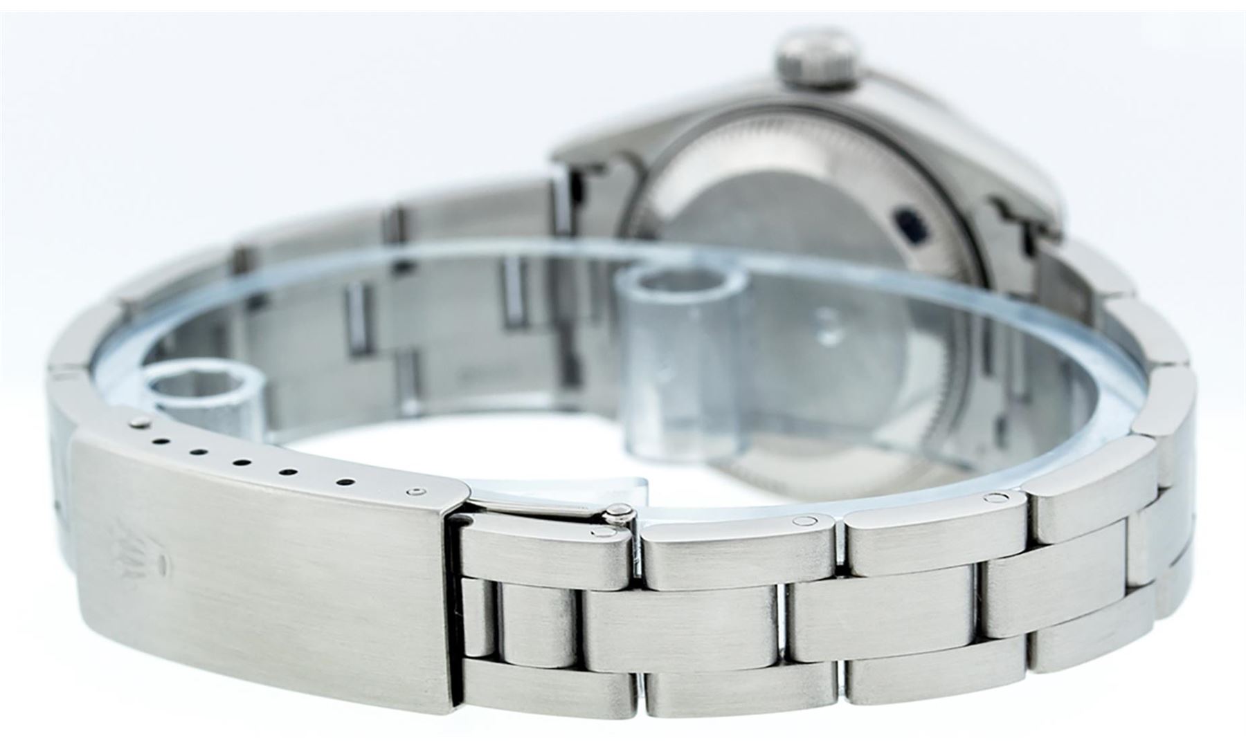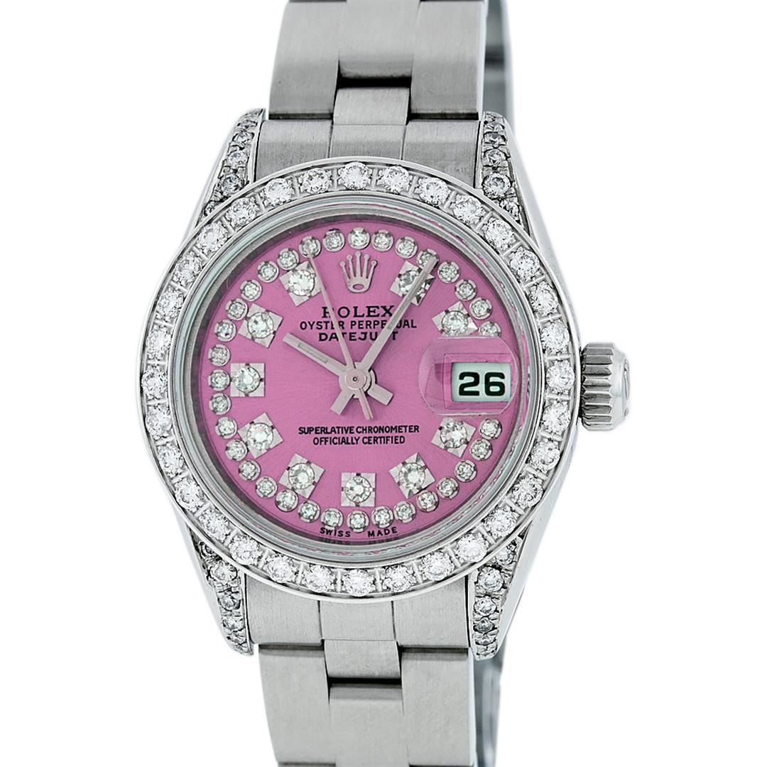 One Quickset Ladies Pre Owned Stainless Steel Rolex Datejust Polished Bright with Satin Finish, Serviced & Electronically Tested, Stainless Steel Case: 26mm, Stainless Steel Crown, Custom Diamond Lugs: 24 Diamonds On Lugs, Clarity: SI-VS, Color: G to H. C