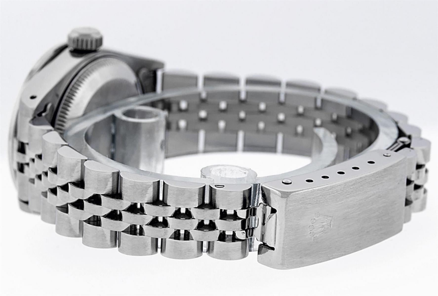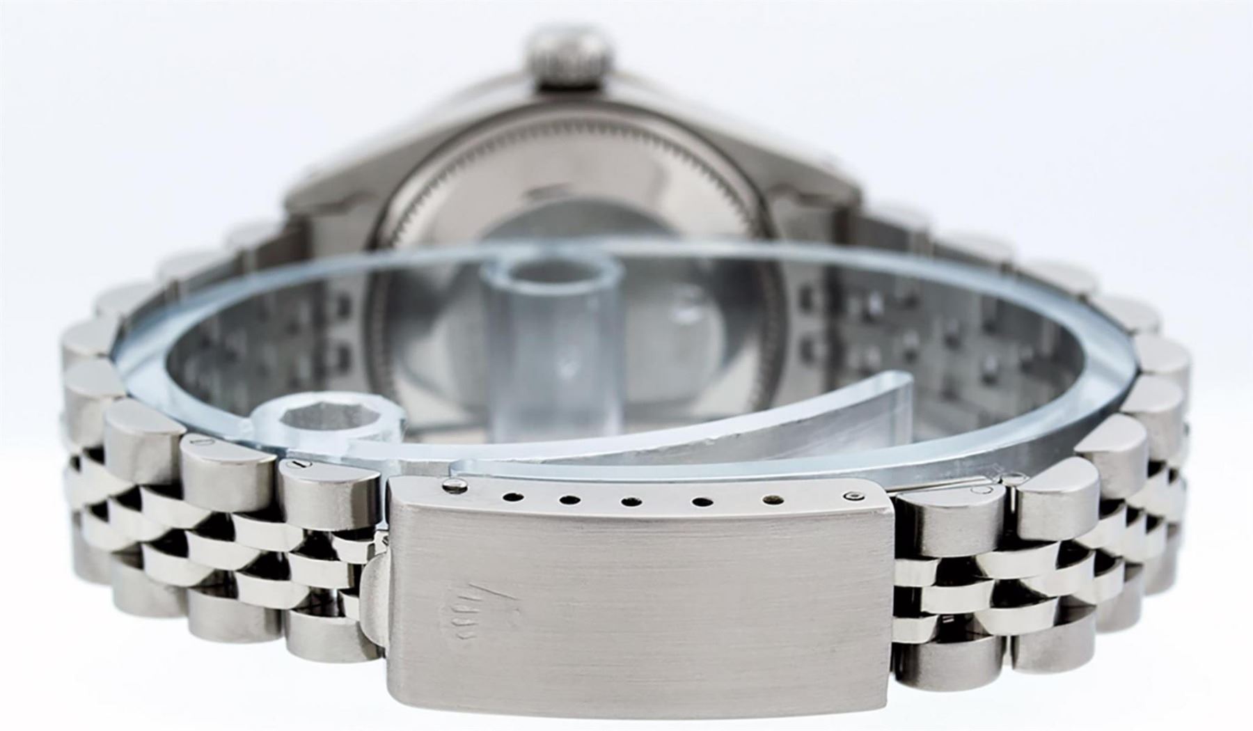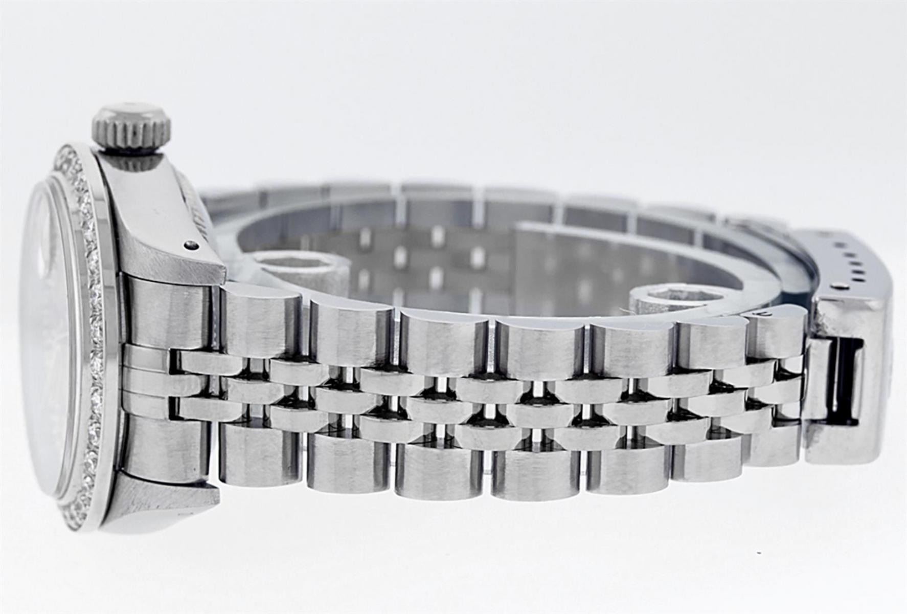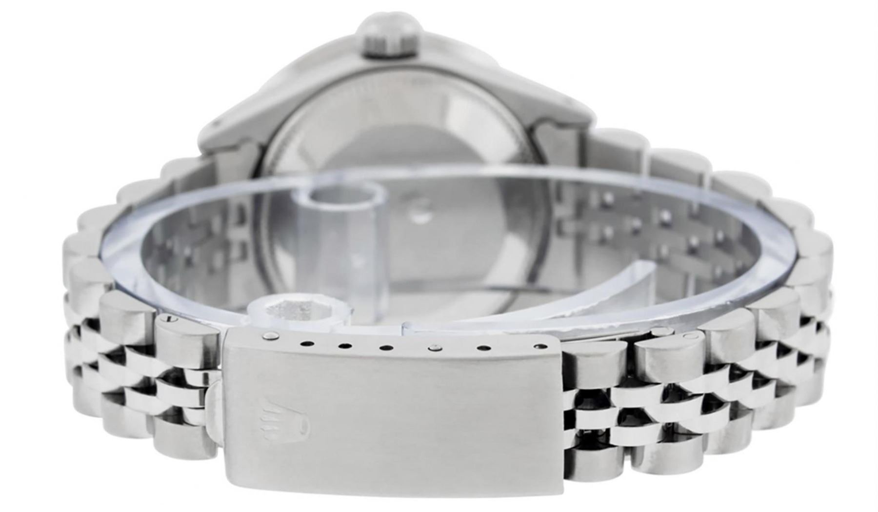 One Ladies Stainless Steel Rolex Oyster Perpetual Datejust Polished Bright with Satin Finish, Serviced & Electronically Tested, Stainless Steel Case: 26mm, Stainless Steel Crown. Custom Bezel: New 18K White Gold Beadset Diamond Bezel, Diamond Count: 32 Diamonds. Total Weight .70 Carat, Clarity: SI-VS, Color: G to H. Custom Crystal: New Scratch Resistant Synthetic Sapphire Cyclops Lens. Custom Hands: New Luminescent Hands. Movement: Automatic Winding Movement. Custom Dial: Refinished Slate Grey String Diamond Dial, Stone Count: 43 Diamonds In Dial, G To H In Color, Clarity: SI-VS. Date Window: 3 O'Clock Position Date Display, Model: Datejust. Condition: G-6 Extra Fine. Bracelet: Stainless Steel Jubilee Band. Bright Polish & Satin Finish. 6.0 Inch Length, Adjustable. Standard Clasp, With Rolex Logo. This Watch Has Been Serviced Time Tested And Is In Excellent Condition It Is Free Of All Scratches And Dents.