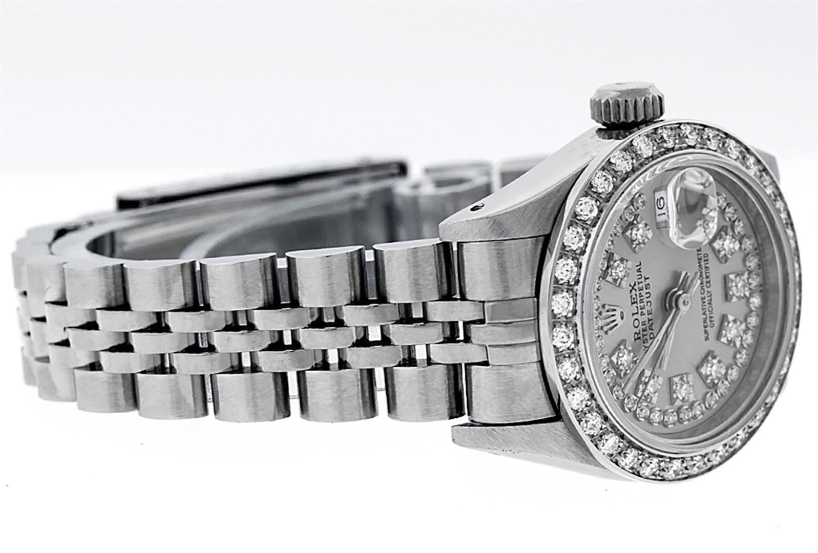 One Ladies Stainless Steel Rolex Oyster Perpetual Datejust Polished Bright with Satin Finish, Serviced & Electronically Tested, Stainless Steel Case: 26mm, Stainless Steel Crown. Custom Bezel: New 18K White Gold Beadset Diamond Bezel, Diamond Count: 32 Diamonds. Total Weight .70 Carat, Clarity: SI-VS, Color: G to H. Custom Crystal: New Scratch Resistant Synthetic Sapphire Cyclops Lens. Custom Hands: New Luminescent Hands. Movement: Automatic Winding Movement. Custom Dial: Refinished Slate Grey String Diamond Dial, Stone Count: 43 Diamonds In Dial, G To H In Color, Clarity: SI-VS. Date Window: 3 O'Clock Position Date Display, Model: Datejust. Condition: G-6 Extra Fine. Bracelet: Stainless Steel Jubilee Band. Bright Polish & Satin Finish. 6.0 Inch Length, Adjustable. Standard Clasp, With Rolex Logo. This Watch Has Been Serviced Time Tested And Is In Excellent Condition It Is Free Of All Scratches And Dents.