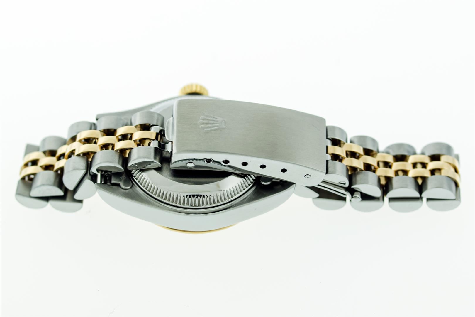 One Ladies Quickset Pre Owned Two Tone 18K Yellow Gold & Stainless Steel Rolex Datejust Polished, Serviced & Electronically Tested, Rolex Yellow Gold & Stainless Steel Case: 26mm, Rolex Yellow Gold Crown, Rolex Bezel: Rolex Yellow Gold Fluted Bezel. Crystal: Sapphire Crystal With Date Window. Hands: Solid Hands. Rolex Movement: Quickset Automatic Winding Movement. Rolex Factory Dial: Champagne With Diamond Hour Markers And Dash Track, Diamond Count: 10 Diamonds In Dial. Date Window: 3 O'Clock Position Date Display, Model: Quickset Datejust. Condition: G-6 Extra Fine. Rolex Bracelet: Two Tone 18K Yellow Gold & Stainless Steel Jubilee Band. Bright Polish. 6.0 Inch Length, Adjustable. Standard Clasp, With Rolex Logo. This Pre Owned Watch Has Been Serviced Time Tested And Is In Excellent Condition It Is Free Of All Scratches And Dents. This Watch Comes With A Rolex Box, Booklets, And Wallet.