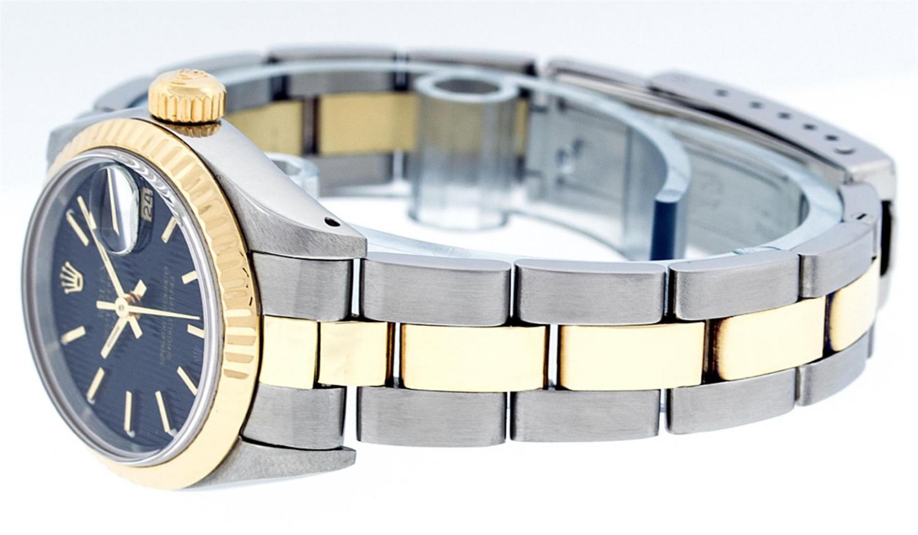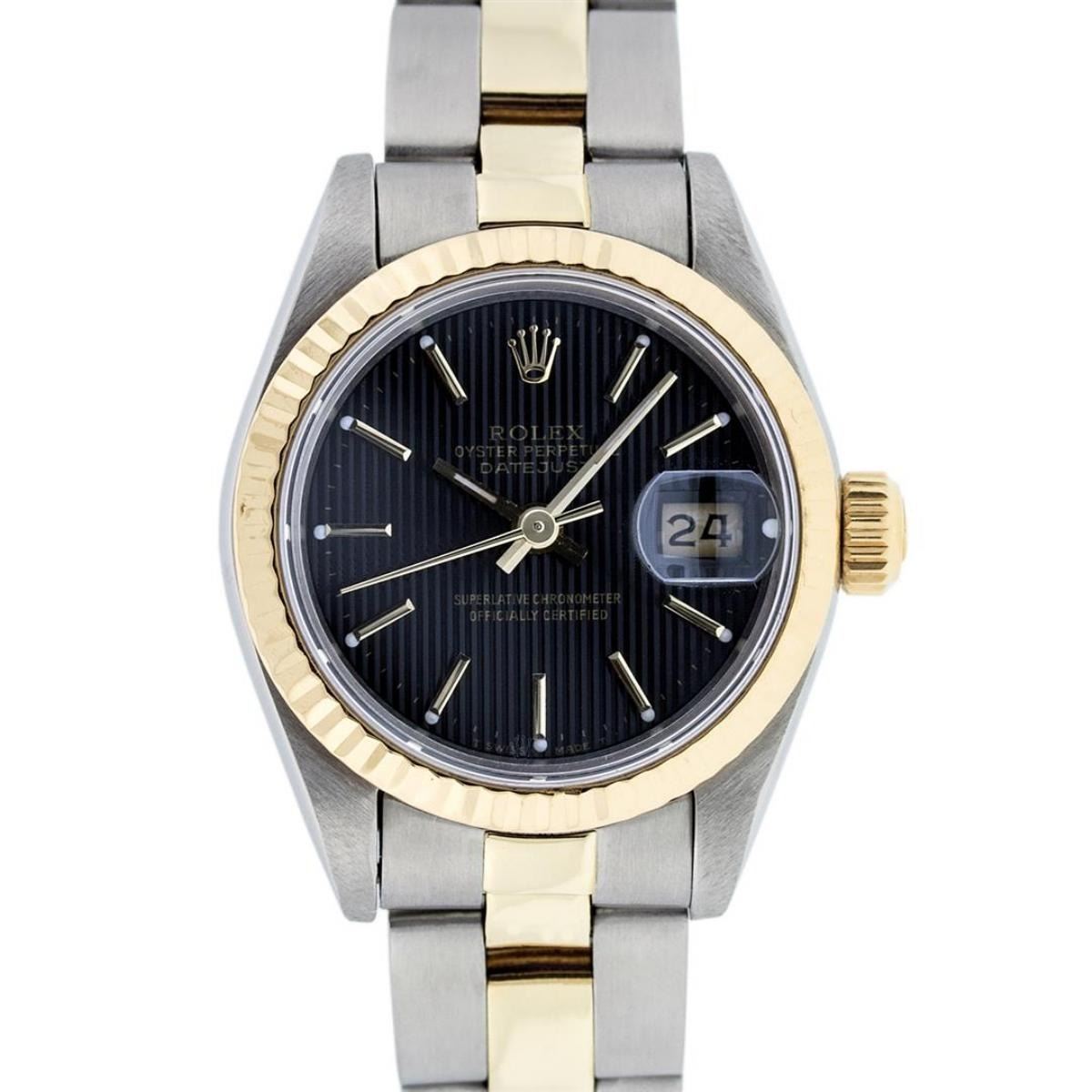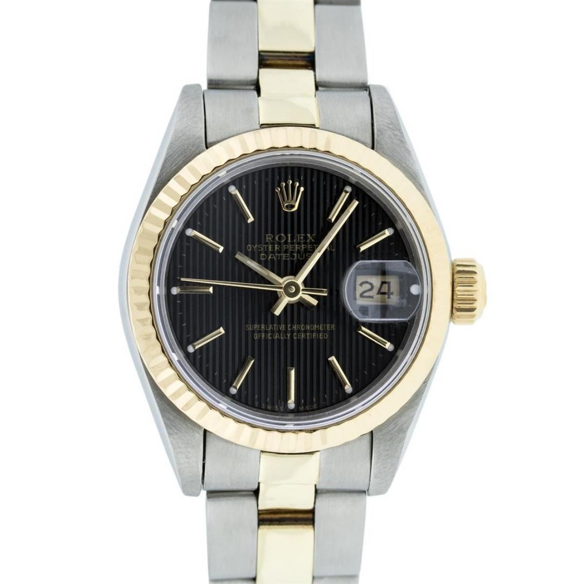 One Ladies Two Tone Yellow Gold And Stainless Steel Rolex Datejust Polished, Serviced & Electronically Tested, Yellow Gold & Stainless Steel Case: 26mm, Yellow Gold Crown, Bezel: Yellow Gold Fluted Bezel. Custom Crystal: New Acrylic Cyclops Lens. Hands: Luminescent Hands. Movement: Automatic Winding Movement. Dial: Black Tapestry With Index Hour Markers. Date Window: 3 O'Clock Position Date Display, Model: Datejust. Condition: G-6 Extra Fine. Bracelet: Two Tone Yellow Gold & Stainless Steel Oyster Band. Bright Polish. 6.0 Inch Length, Adjustable. Standard Clasp, With Rolex Logo. This Watch Has Been Serviced Time Tested And Is In Excellent Condition It Is Free Of All Scratches And Dents.