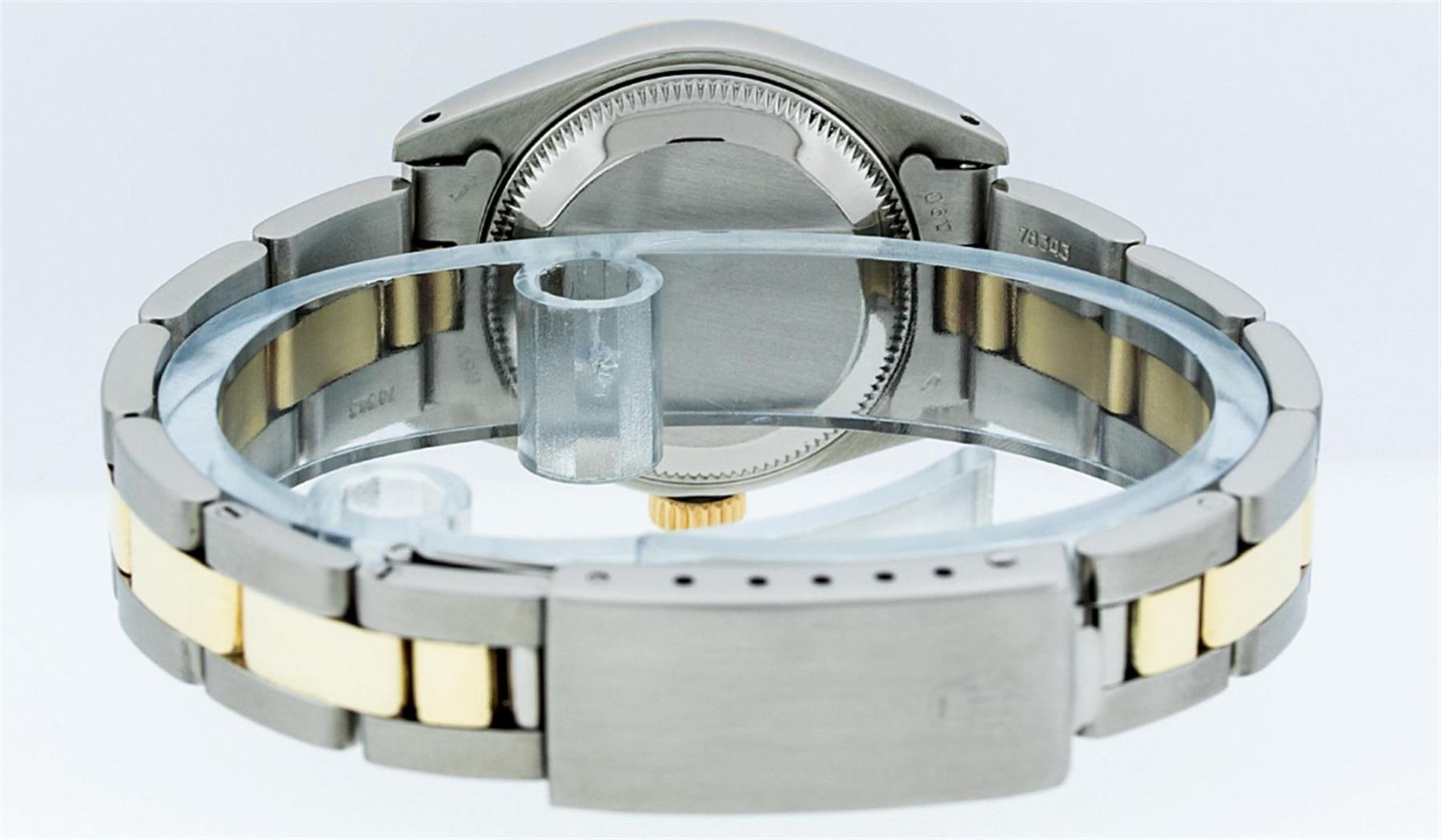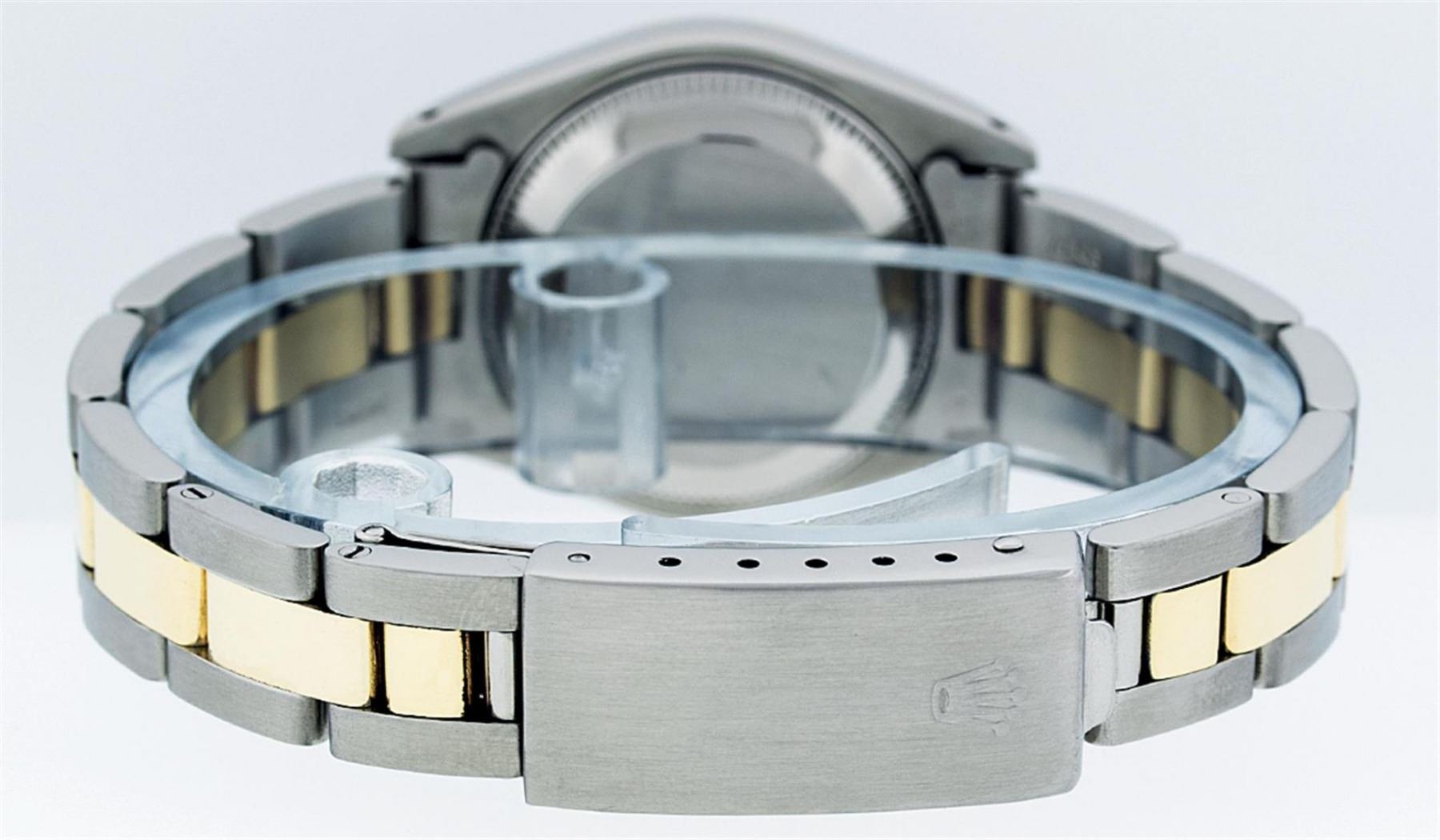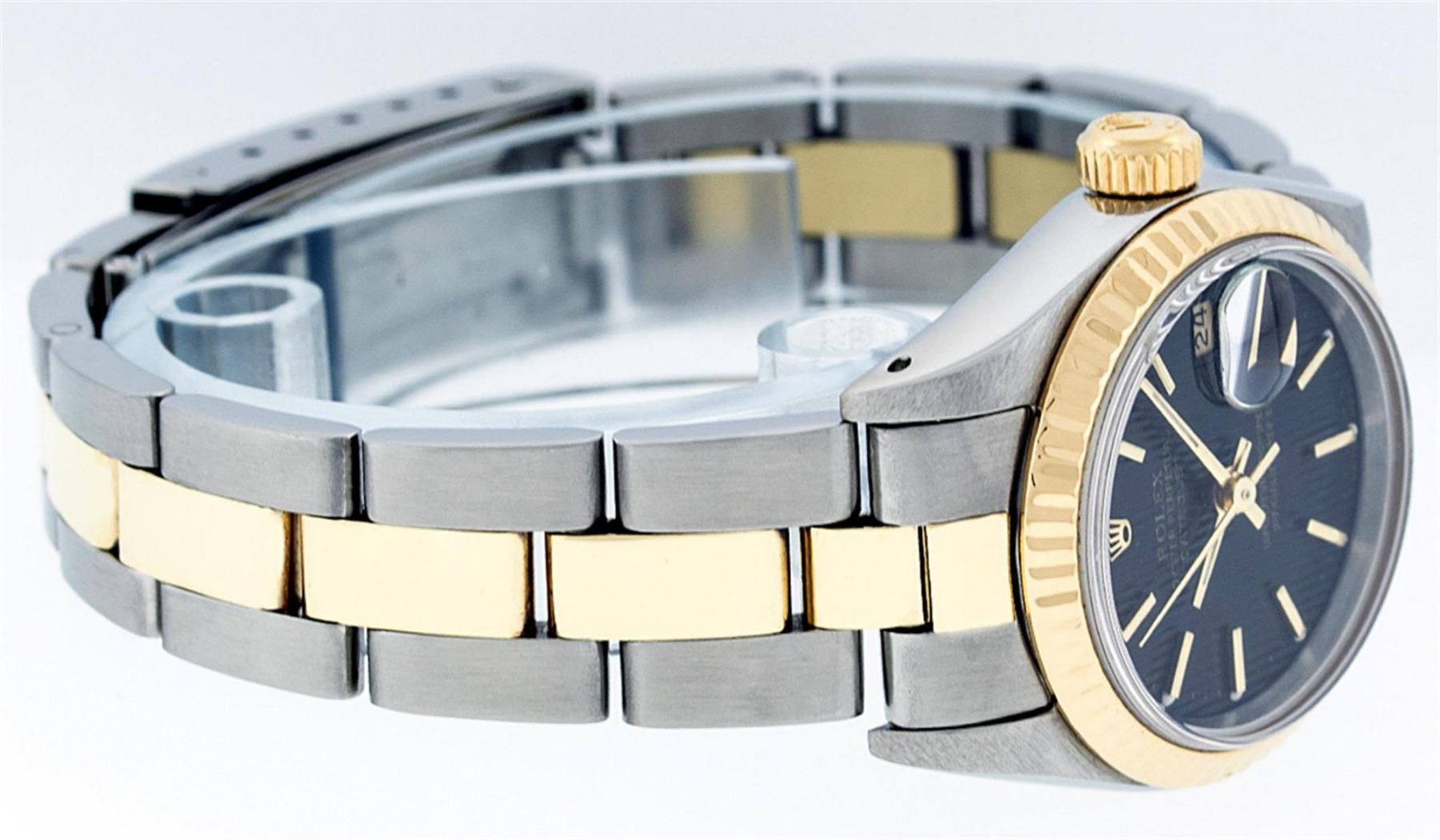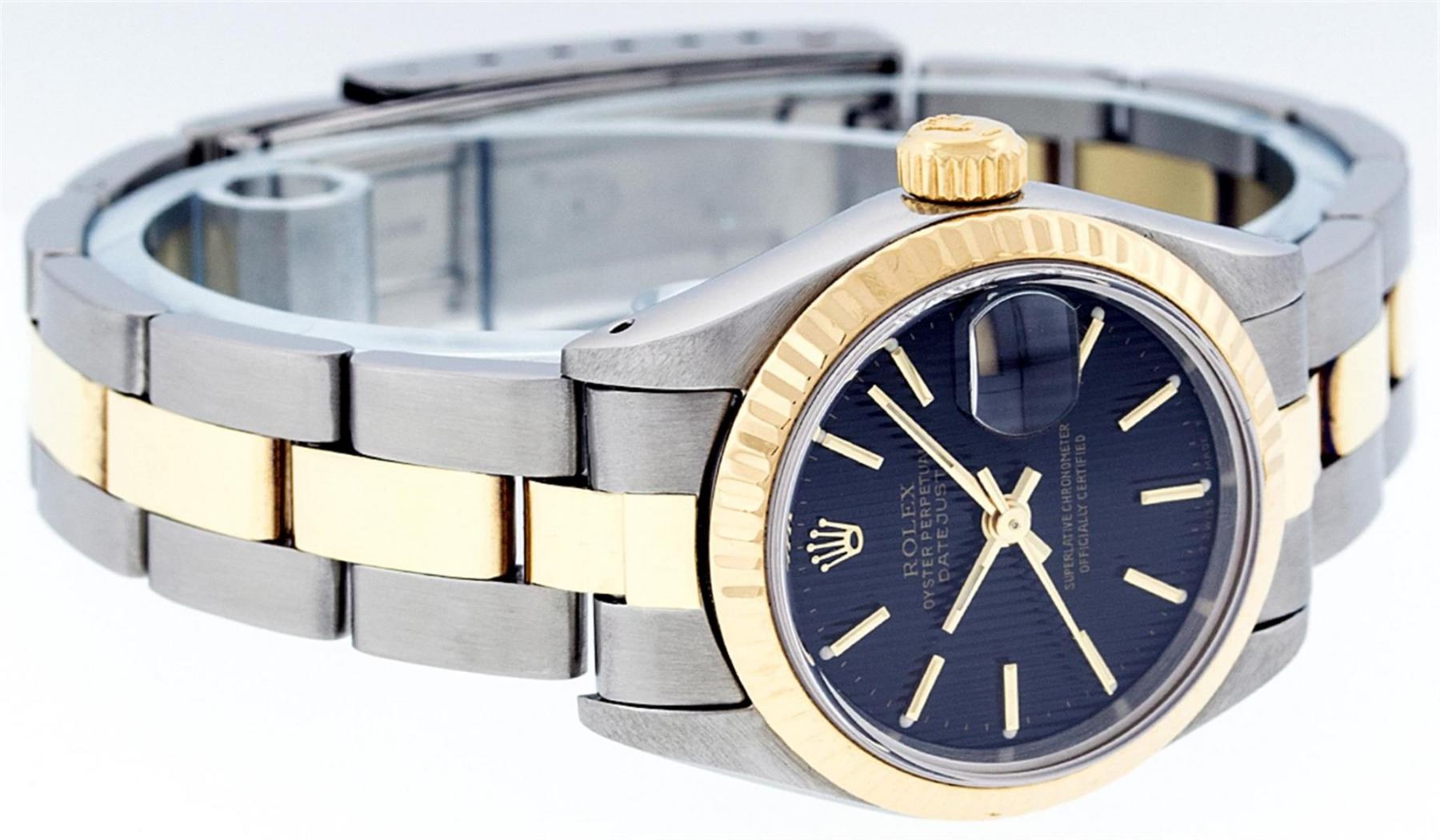 One Ladies Two Tone Yellow Gold And Stainless Steel Rolex Datejust Polished, Serviced & Electronically Tested, Yellow Gold & Stainless Steel Case: 26mm, Yellow Gold Crown, Bezel: Yellow Gold Fluted Bezel. Custom Crystal: New Acrylic Cyclops Lens. Hands: Luminescent Hands. Movement: Automatic Winding Movement. Dial: Black Tapestry With Index Hour Markers. Date Window: 3 O'Clock Position Date Display, Model: Datejust. Condition: G-6 Extra Fine. Bracelet: Two Tone Yellow Gold & Stainless Steel Oyster Band. Bright Polish. 6.0 Inch Length, Adjustable. Standard Clasp, With Rolex Logo. This Watch Has Been Serviced Time Tested And Is In Excellent Condition It Is Free Of All Scratches And Dents.