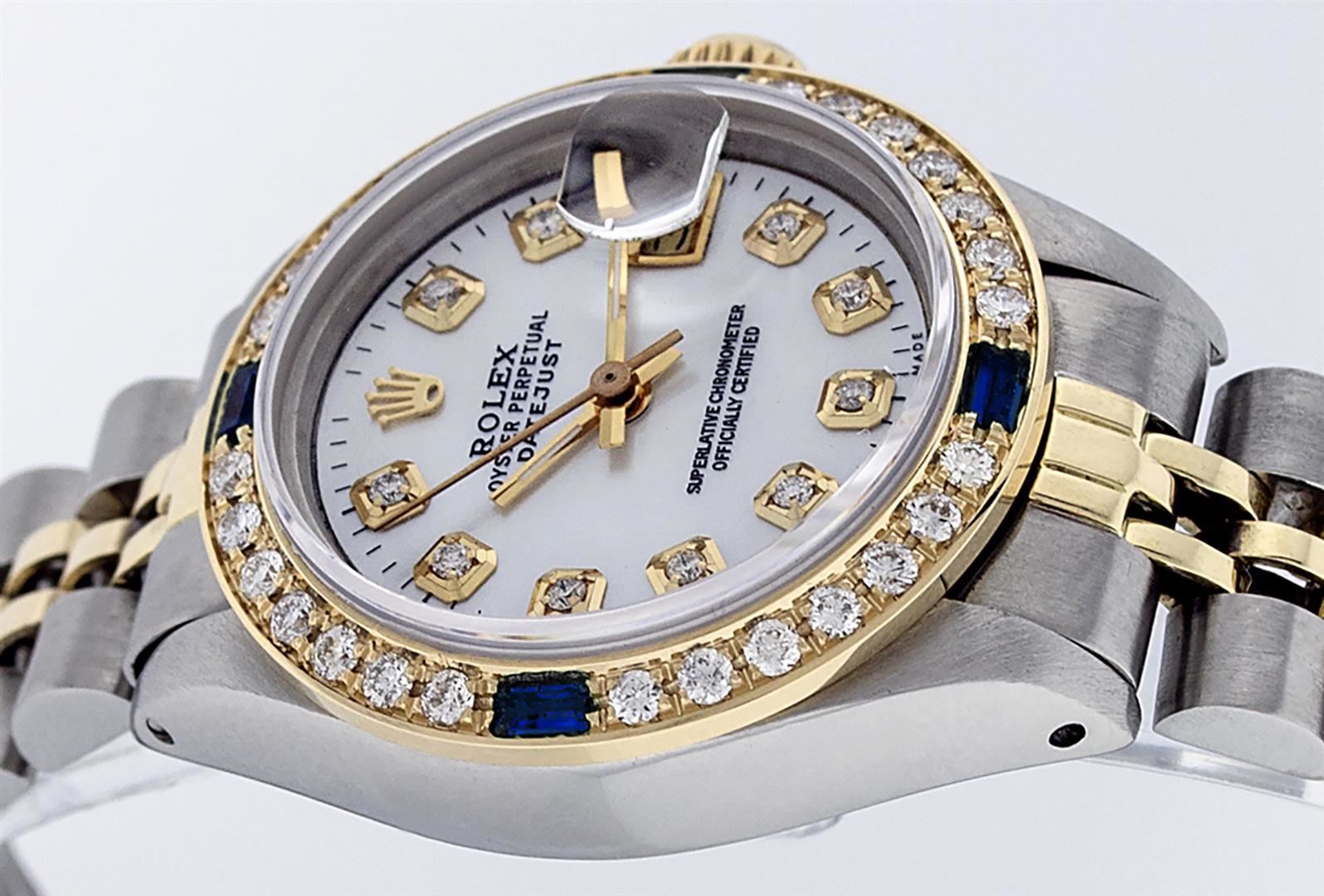 One Ladies Two Tone Yellow Gold And Stainless Steel Rolex Datejust Polished, Serviced & Electronically Tested, Yellow Gold & Stainless Steel Case: 26mm, Yellow Gold Crown, Custom Bezel: New 18K Yellow Gold Sapphire Beadset Diamond Bezel, Diamond + Gem Count: 28 Diamonds + 4 Sapphires Total Weight .70 Carat, Clarity: SI-VS, Color: G to H. Custom Crystal: New Scratch Resistant Synthetic Sapphire Cyclops Lens. Custom Hands: New Luminescent Hands. Movement: Automatic Winding Movement. Custom Dial: Mother Of Pearl Set With Diamond Hour Markers & Dash Track, Diamond Count: 10 Diamond in Dial, G To H In Color, SI-VS Clarity. Date Window: 3 O'Clock Position Date Display, Model: Datejust, Condition: G-6 Extra Fine. Bracelet: Two Tone Yellow Gold & Stainless Steel Jubilee Band. Bright Polish. 6.0 Inch Length, Adjustable. Standard Clasp, With Rolex Logo. This Watch Has Been Serviced Time Tested And Is In Excellent Condition It Is Free Of All Scratches And Dents.