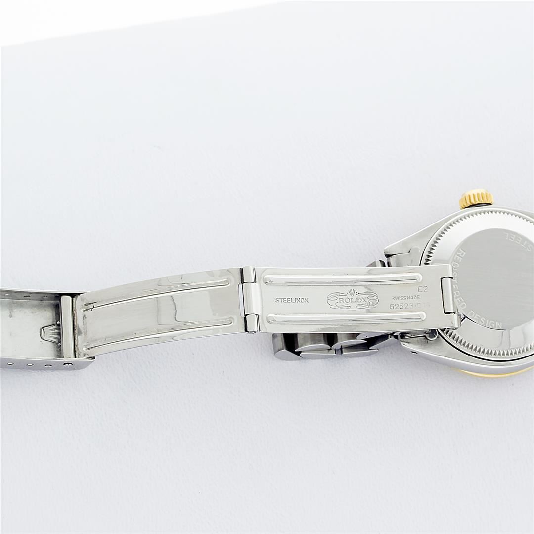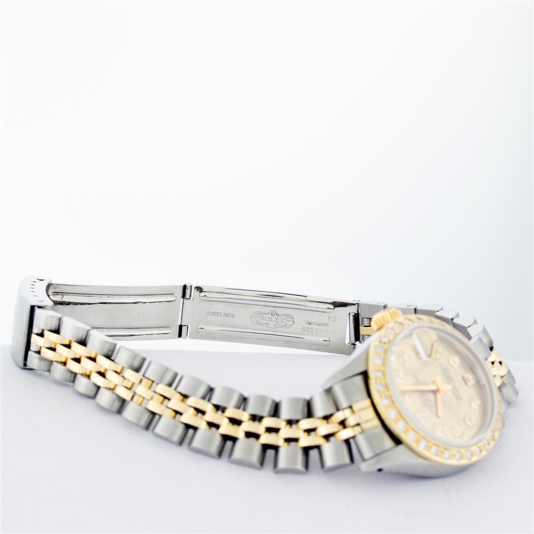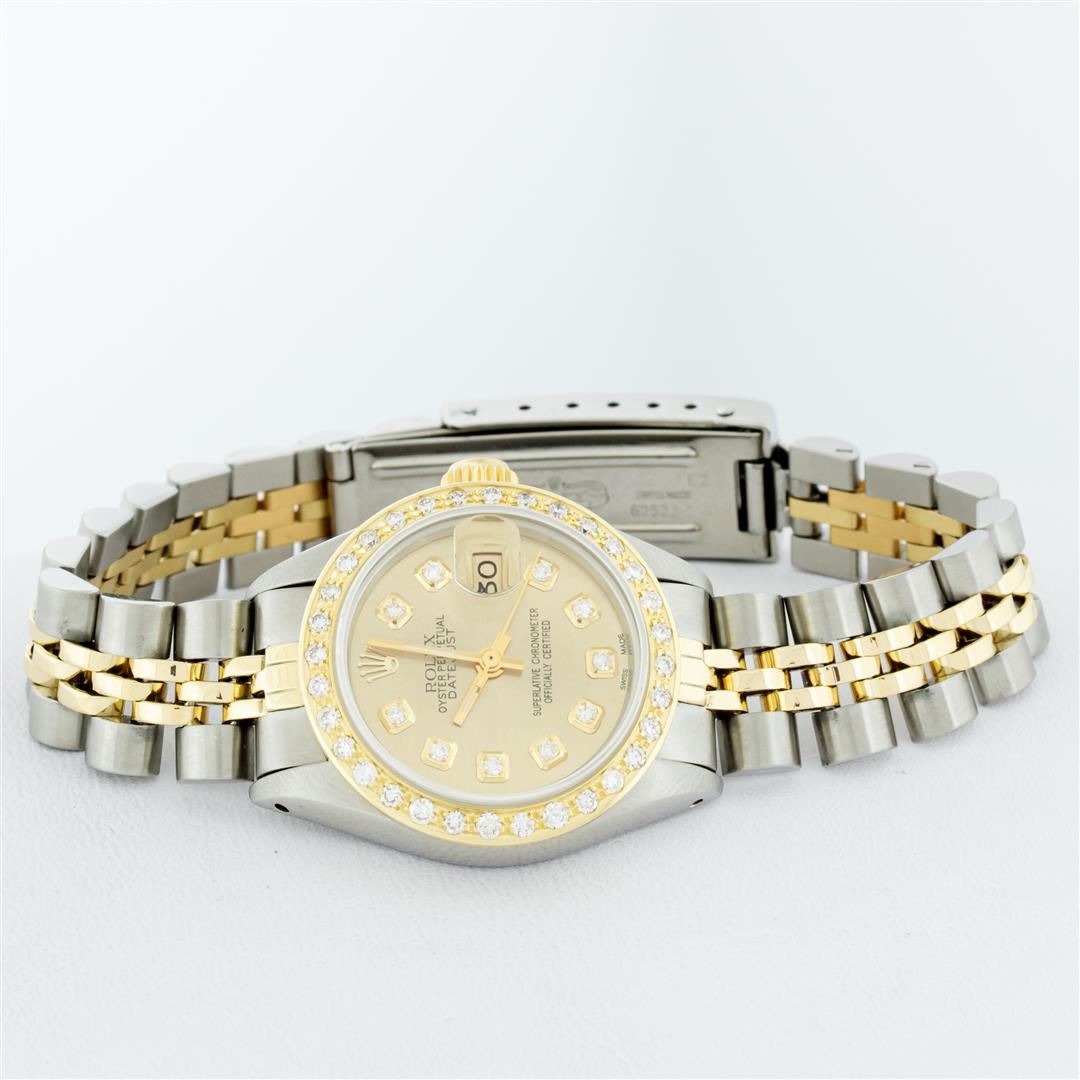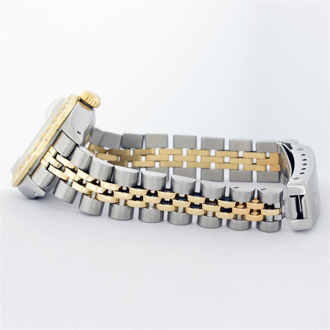 One Ladies Pre Owned Two Tone Rolex Datejust Polished, Serviced & Electronically Tested, Rolex Yellow Gold & Stainless Steel Case: 26mm, Rolex Yellow Gold Crown, Custom Bezel: New 18K Yellow Gold Beadset Diamond Bezel, Diamond Count: 32 Diamonds, Clarity: