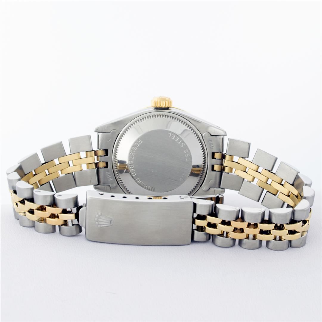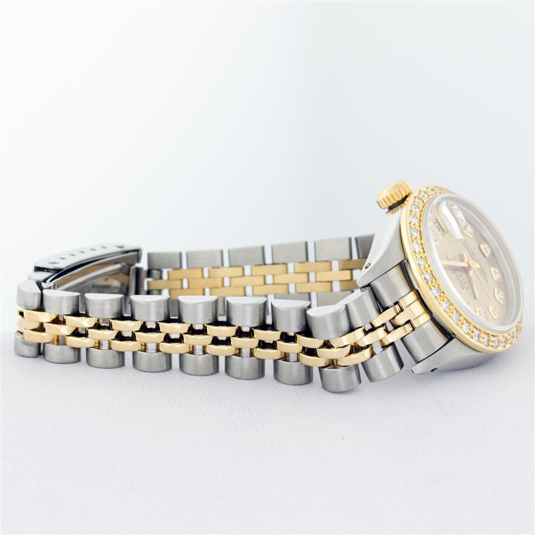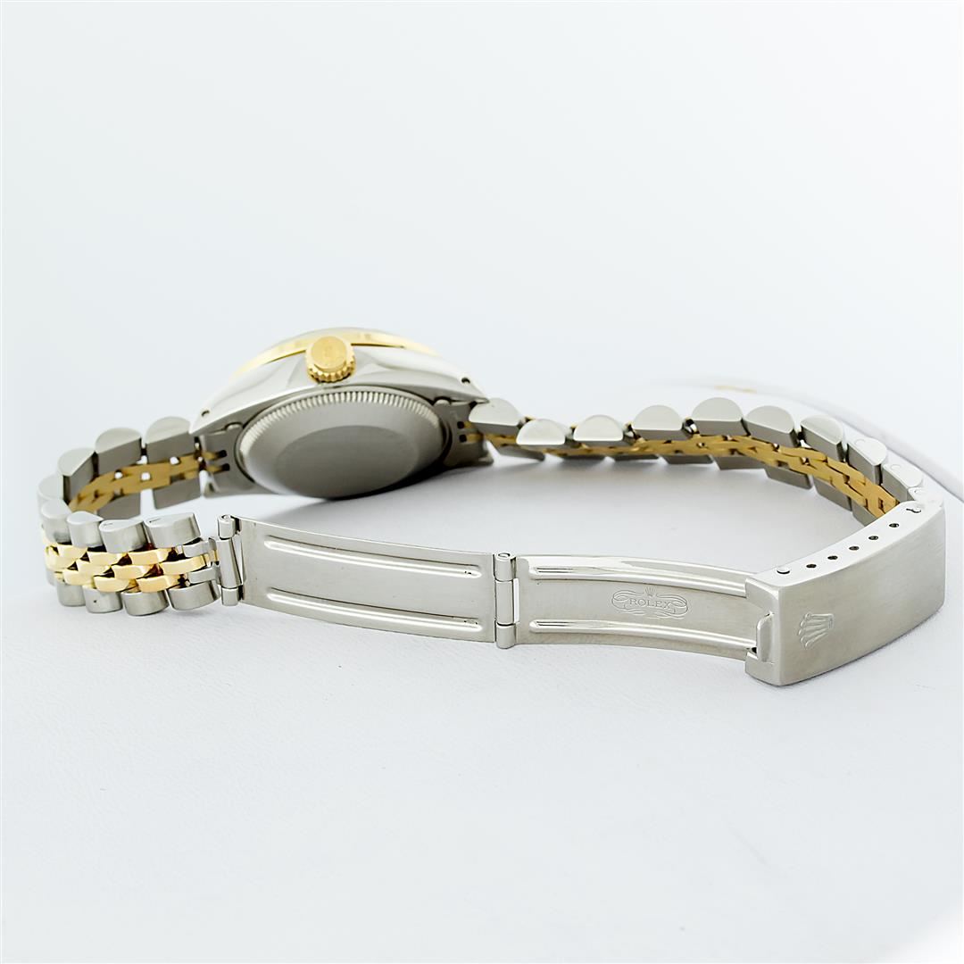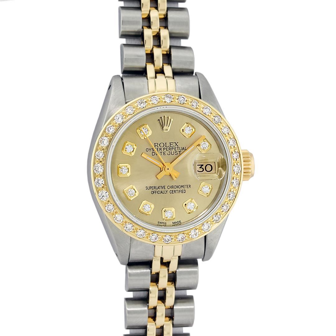 One Ladies Pre Owned Two Tone Rolex Datejust Polished, Serviced & Electronically Tested, Rolex Yellow Gold & Stainless Steel Case: 26mm, Rolex Yellow Gold Crown, Custom Bezel: New 18K Yellow Gold Beadset Diamond Bezel, Diamond Count: 32 Diamonds, Clarity: Si-VS, Color: G to H. Custom Crystal: New Sapphire With Date Window. Custom Hands: New Gold Hands. Rolex Movement: Automatic Winding Movement. Custom Dial: Refinished To Champagne With Added Diamonds, Diamond Count: 10 Single Cut Diamonds in Dial, G To H In Color, VS Clarity. Date Window: 3 Oclock Position Date Display, Model: Datejust, Condition: G-6 Extra Fine. Rolex Bracelet: Two Tone Yellow Gold & Stainless Steel Jubilee Band. Bright Polish. 6.0 Inch Length, Adjustable. Standard Clasp, With Rolex Logo. This Watch Has Been Serviced Time Tested And Is In Excellent Condition It Is Free Of All Scratches And Dents.