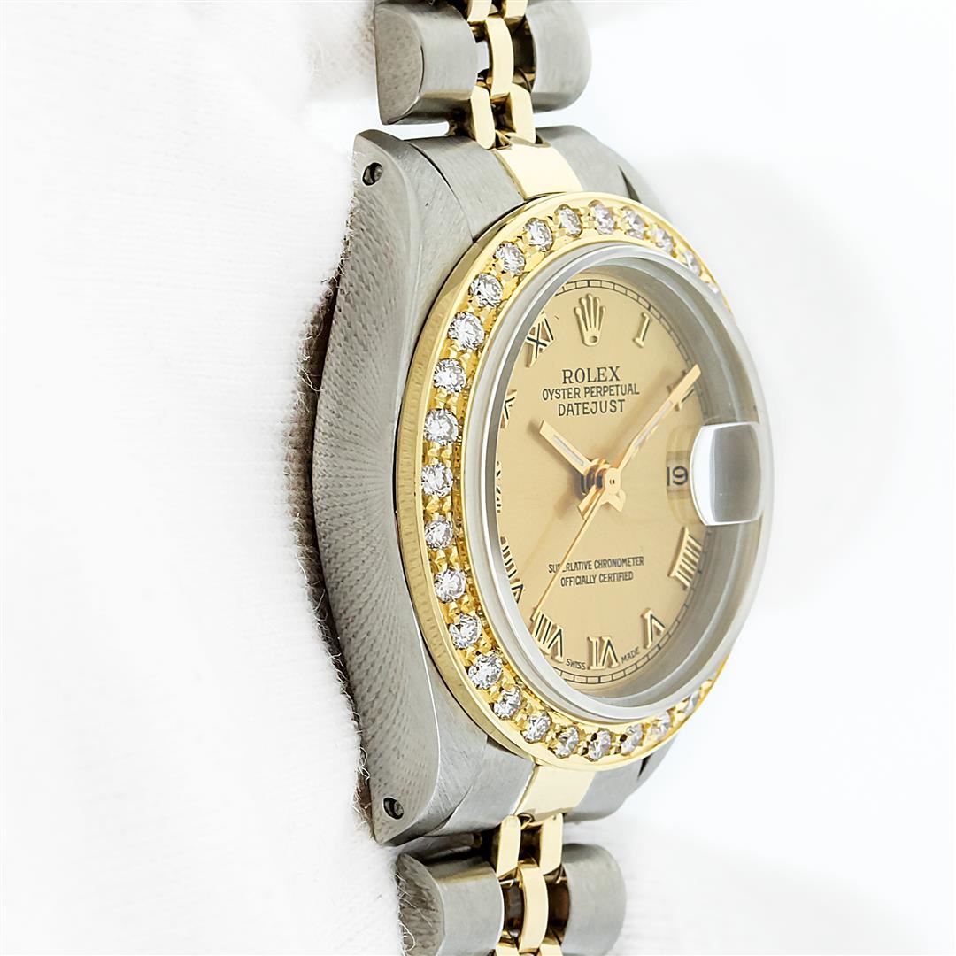 One Pre Owned Ladies Two Tone Rolex Datejust Polished, Serviced & Electronically Tested, Rolex Yellow Gold & Stainless Steel Case: 26mm, Rolex Yellow Gold Crown, Custom Bezel: New 18K Yellow Gold Diamond Bezel, Diamond Count: 32 Diamonds, Clarity: SI-VS, Color: G to H. Custom Crystal: New Scratch Resistant Synthetic Sapphire Cyclops Lens. Custom Hands: New Gold Hands. Rolex Movement: Automatic Winding Movement. Rolex Dial: Champagne Roman With Square Track. Date Window: 3 O'Clock Position Date Display, Model: Datejust, Condition: G-6 Extra Fine. Rolex Bracelet: Two Tone Yellow Gold & Stainless Steel Jubilee Band. Bright Polish. 6.0 Inch Length, Adjustable. Standard Clasp, With Rolex Logo. This Watch Has Been Serviced Time Tested And Is In Excellent Condition It Is Free Of All Scratches And Dents.