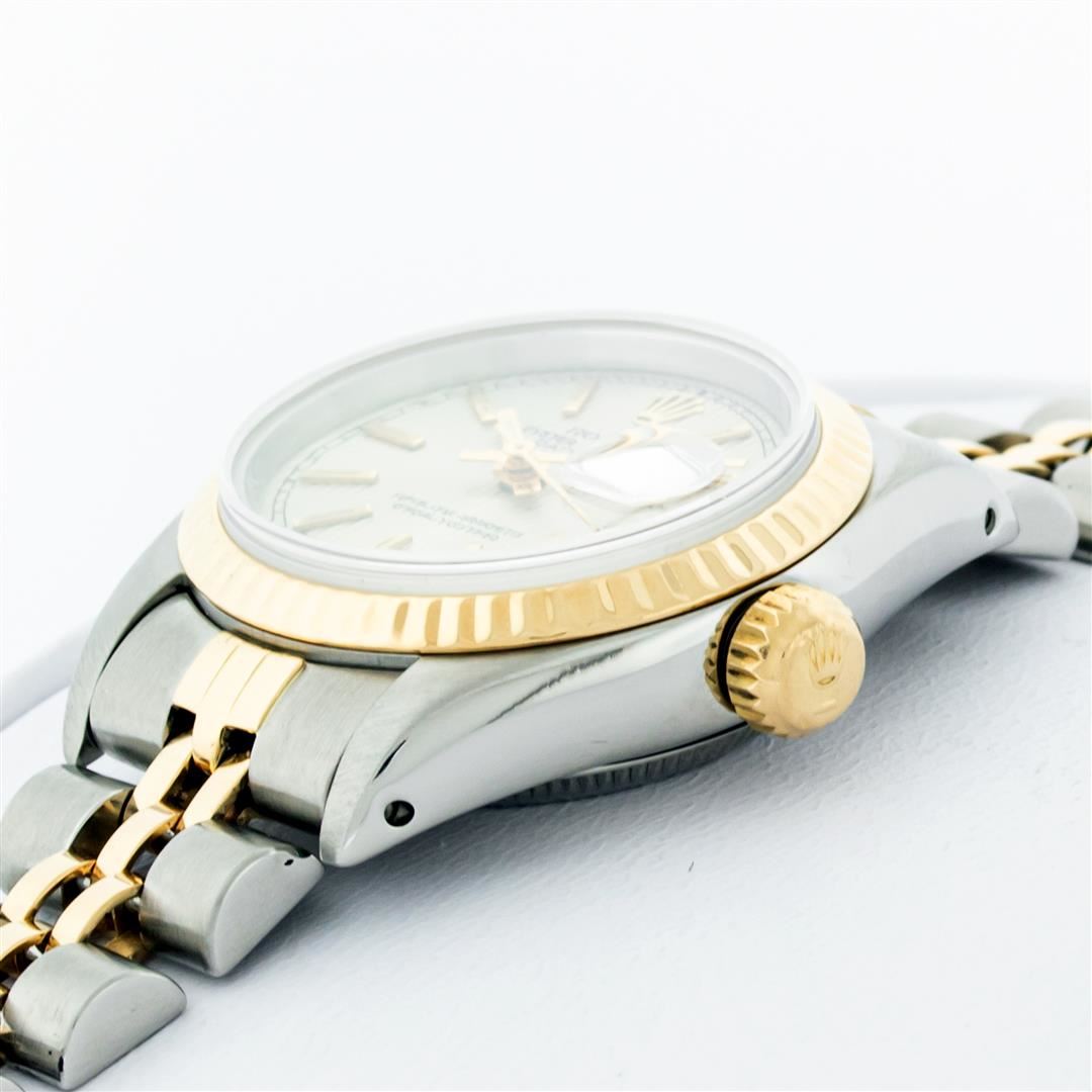 One Ladies Pre Owned Two Tone Rolex Datejust Polished, Serviced & Electronically Tested, Rolex Yellow Gold & Stainless Steel Case: 26mm, Rolex Yellow Gold Crown, Rolex Bezel: Yellow Gold Fluted Bezel. Custom Crystal: New With Cyclops Lens. Custom Hands: New Luminescent Hands. Rolex Movement: Automatic Winding Movement. Rolex Dial: Silver Index Tapestry With Square Track. Date Window: 3 O'Clock Position Date Display, Model: Datejust. Condition: G-6 Extra Fine. Rolex Bracelet: Two Tone Yellow Gold & Stainless Steel Jubilee Band. Bright Polish. 6.0 Inch Length, Adjustable. Standard Clasp, With Rolex Logo. This Watch Has Been Serviced Time Tested And Is In Excellent Condition It Is Free Of All Scratches And Dents.