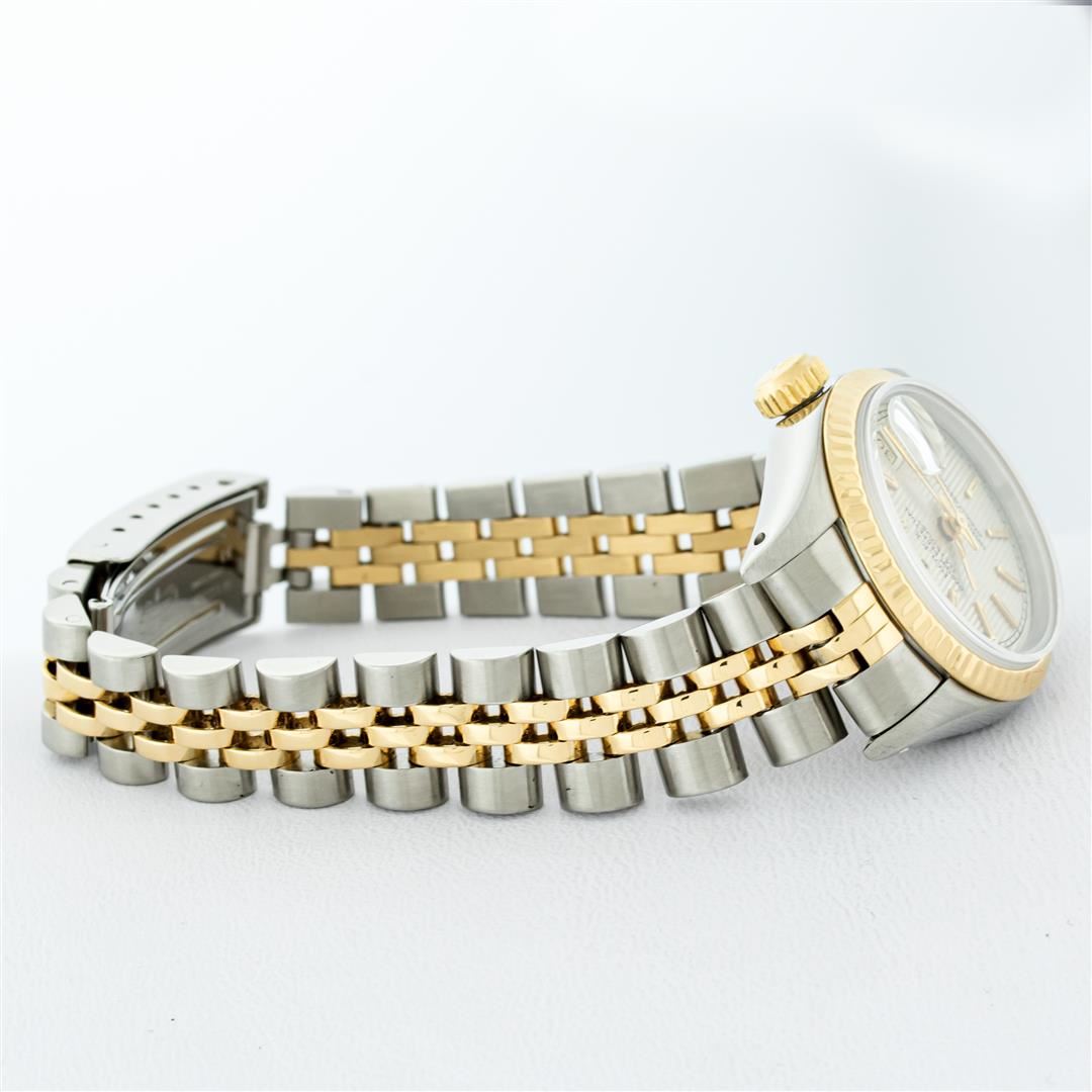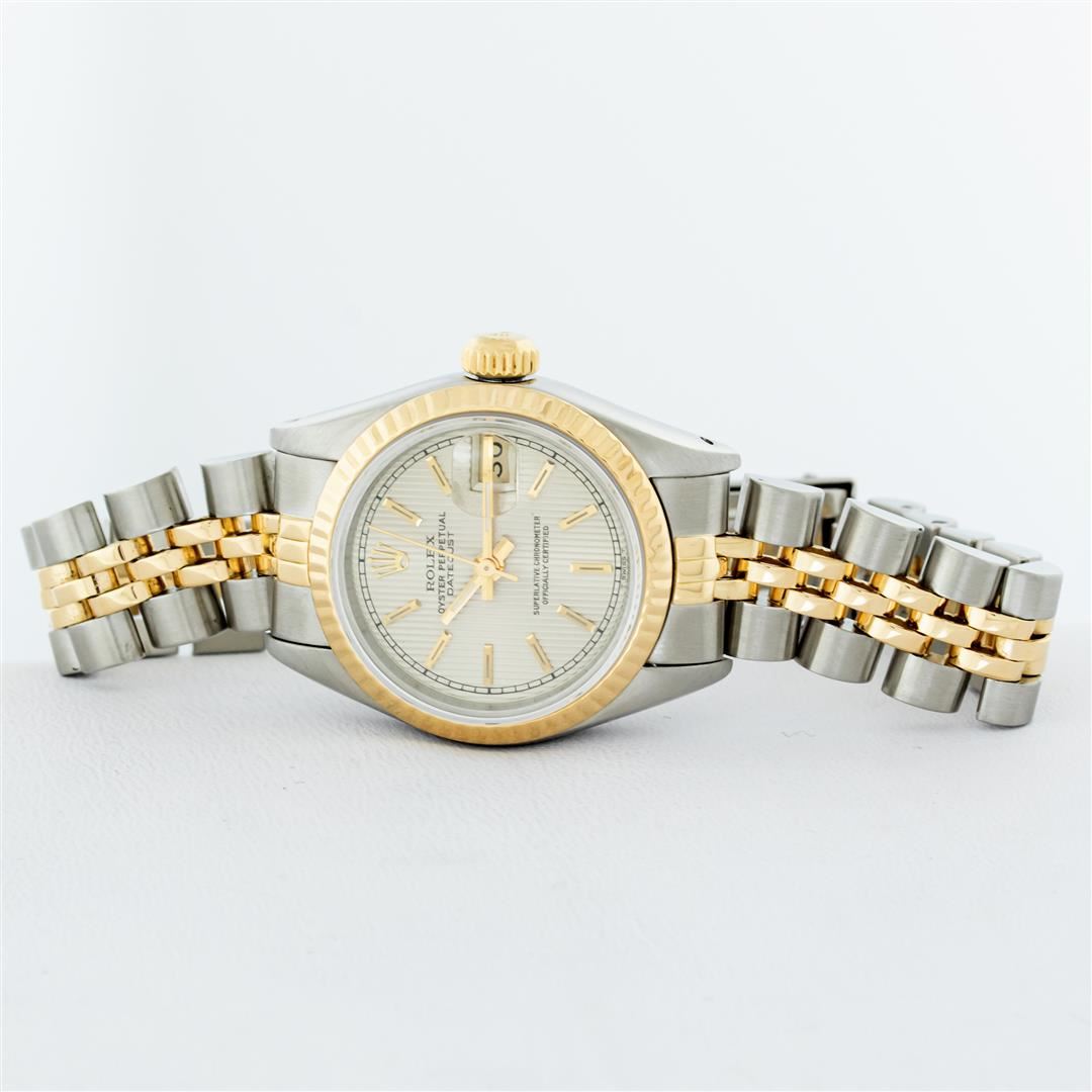 One Ladies Pre Owned Two Tone Rolex Datejust Polished, Serviced & Electronically Tested, Rolex Yellow Gold & Stainless Steel Case: 26mm, Rolex Yellow Gold Crown, Rolex Bezel: Yellow Gold Fluted Bezel. Custom Crystal: New With Cyclops Lens. Custom Hands: New Luminescent Hands. Rolex Movement: Automatic Winding Movement. Rolex Dial: Silver Index Tapestry With Square Track. Date Window: 3 O'Clock Position Date Display, Model: Datejust. Condition: G-6 Extra Fine. Rolex Bracelet: Two Tone Yellow Gold & Stainless Steel Jubilee Band. Bright Polish. 6.0 Inch Length, Adjustable. Standard Clasp, With Rolex Logo. This Watch Has Been Serviced Time Tested And Is In Excellent Condition It Is Free Of All Scratches And Dents.