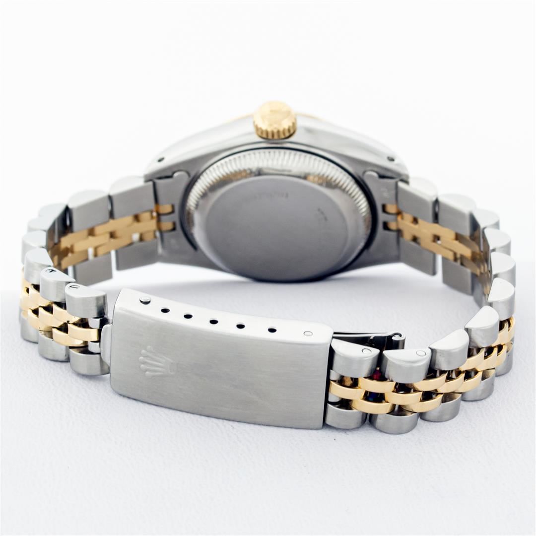 One Ladies Pre Owned Two Tone Rolex Datejust Polished, Serviced & Electronically Tested, Rolex Yellow Gold & Stainless Steel Case: 26mm, Rolex Yellow Gold Crown, Rolex Bezel: Yellow Gold Fluted Bezel. Custom Crystal: New With Cyclops Lens. Custom Hands: New Luminescent Hands. Rolex Movement: Automatic Winding Movement. Rolex Dial: Silver Index Tapestry With Square Track. Date Window: 3 O'Clock Position Date Display, Model: Datejust. Condition: G-6 Extra Fine. Rolex Bracelet: Two Tone Yellow Gold & Stainless Steel Jubilee Band. Bright Polish. 6.0 Inch Length, Adjustable. Standard Clasp, With Rolex Logo. This Watch Has Been Serviced Time Tested And Is In Excellent Condition It Is Free Of All Scratches And Dents.