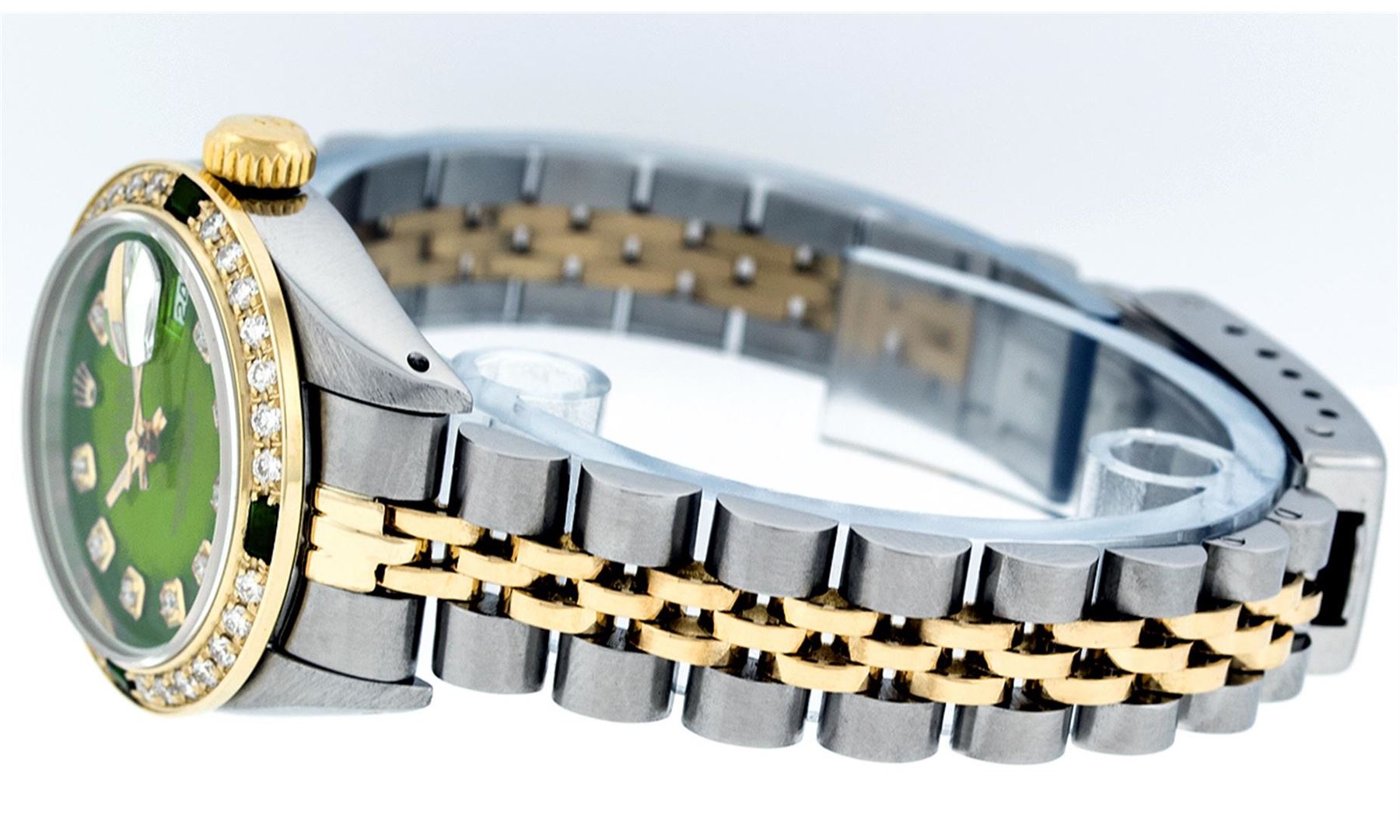 One Ladies Two Tone Rolex Datejust Polished, Serviced & Electronically Tested, 14K Yellow Gold & Stainless Steel Case:26mm, 14K Yellow Gold Crown, Custom Bezel: 18K Yellow Gold Emerald Beadset Diamond Bezel, Diamond Count: 28 Diamonds + 4 Emeralds Total Weight .70 Carat, Clarity: SI-VS, Color: G to H. Custom Crystal: Synthetic Sapphire Cyclops Lens. Movement: Automatic Winding Movement Caliber 2030. Custom Dial: Green Vignette With Diamond Hour Markers, Diamond Count: 10 Diamonds In Dial, Color: G to H, Clarity: SI-VS. Date Window: 3 O'Clock Position Date Display, Model: Datejust. Condition: G-6 Extra Fine. Bracelet: Two Tone 14K Yellow Gold & Stainless Steel Jubilee Band. Bright Polish. 5.5 Inch Length, Adjustable. Standard Clasp, With Rolex Logo.