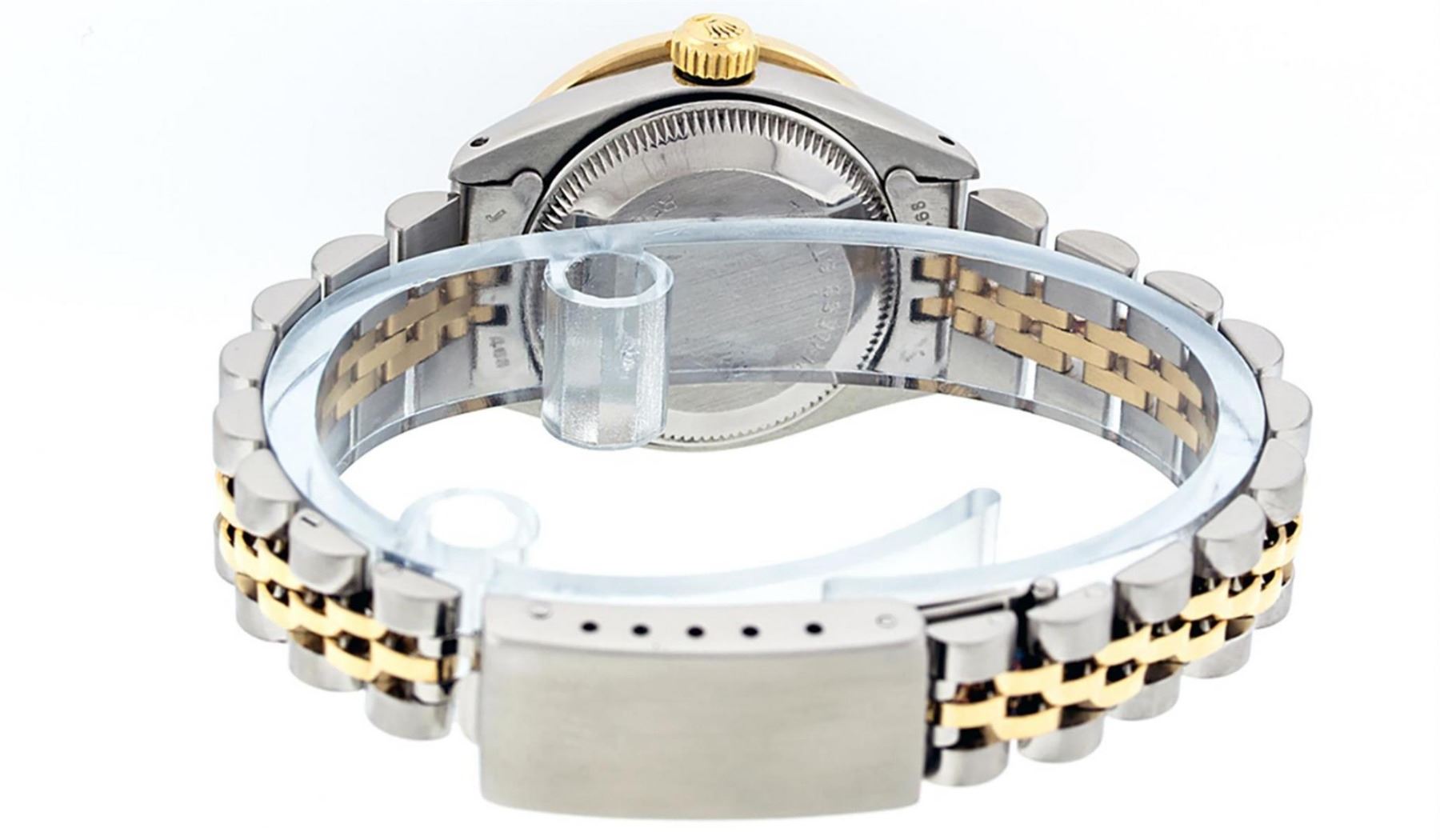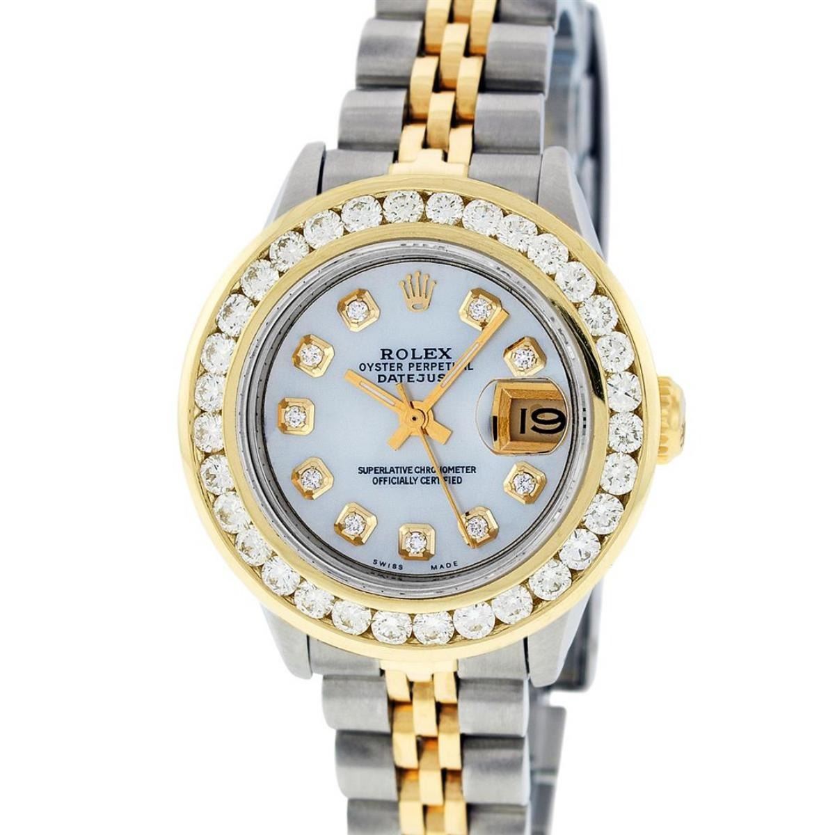 One Ladies Two Tone Rolex Datejust Polished, Serviced & Electronically Tested, Yellow Gold & Stainless Steel Case: 26mm, Yellow Gold Crown, Custom Bezel: New 2.0ctw 18K Yellow Gold Channel Set Diamond Bezel, Diamond + Gem Count: 32 Diamonds In Bezel, Total Weight 2.00 Carat, Clarity: SI-VS, Color: G to H. Custom Crystal: New Scratch Resistant Synthetic Sapphire Cyclops Lens. Custom Hands: New Luminescent Hands. Movement: Automatic Winding Movement. Custom Dial: Mother Of Pearl With Diamond Hour Markers, Stone Count: 10 Diamonds In Dial. Date Window: 3 O'Clock Position Date Display, Model: Datejust, Condition: G-6 Extra Fine. Bracelet: Two Tone Yellow Gold & Stainless Steel Jubilee Band. Bright Polish. 6.0 Inch Length, Adjustable. Standard Clasp, With Rolex Logo. This Watch Has Been Serviced Time Tested And Is In Excellent Condition It Is Free Of All Scratches And Dents. This Watch Comes With A Wooden Watch Winder.