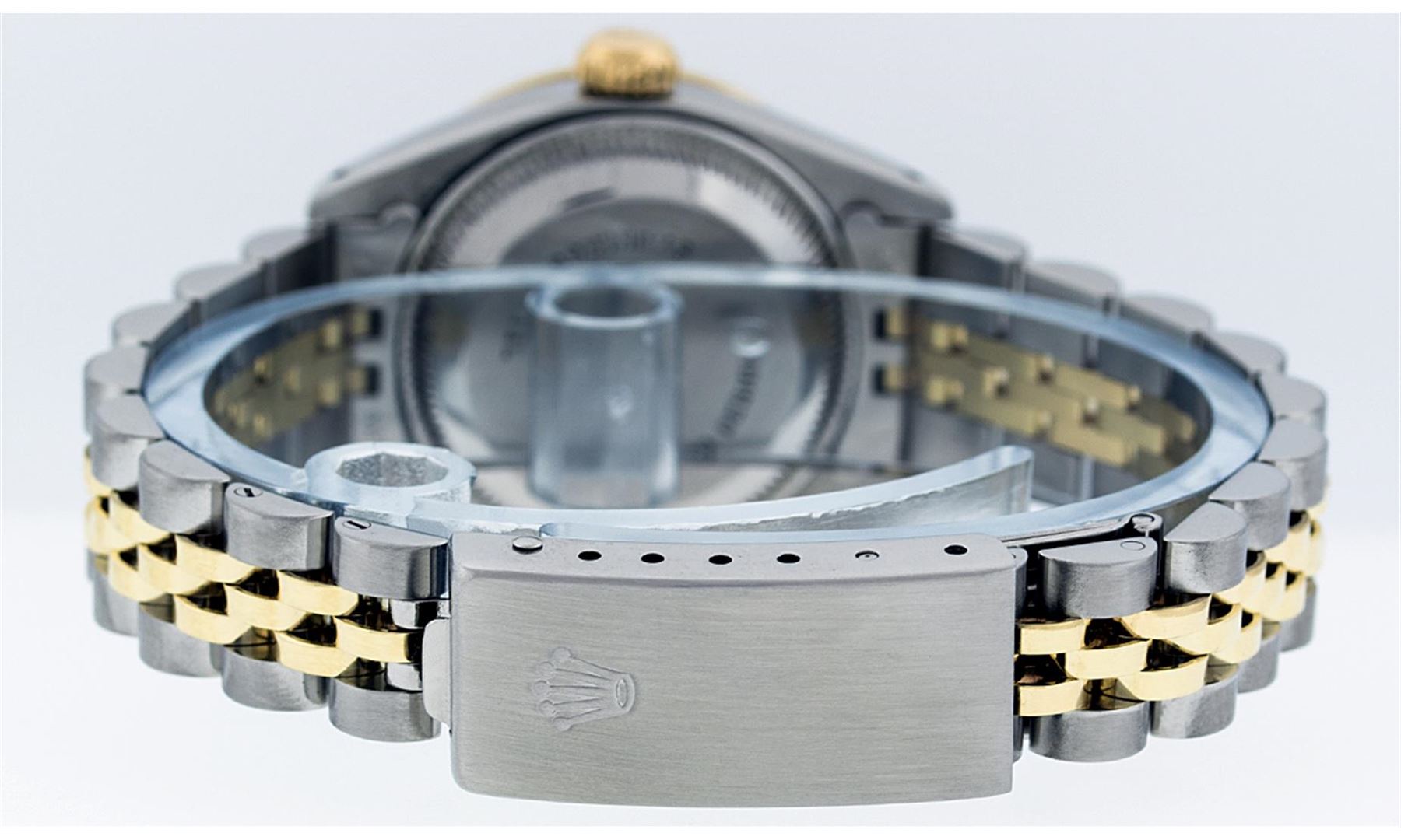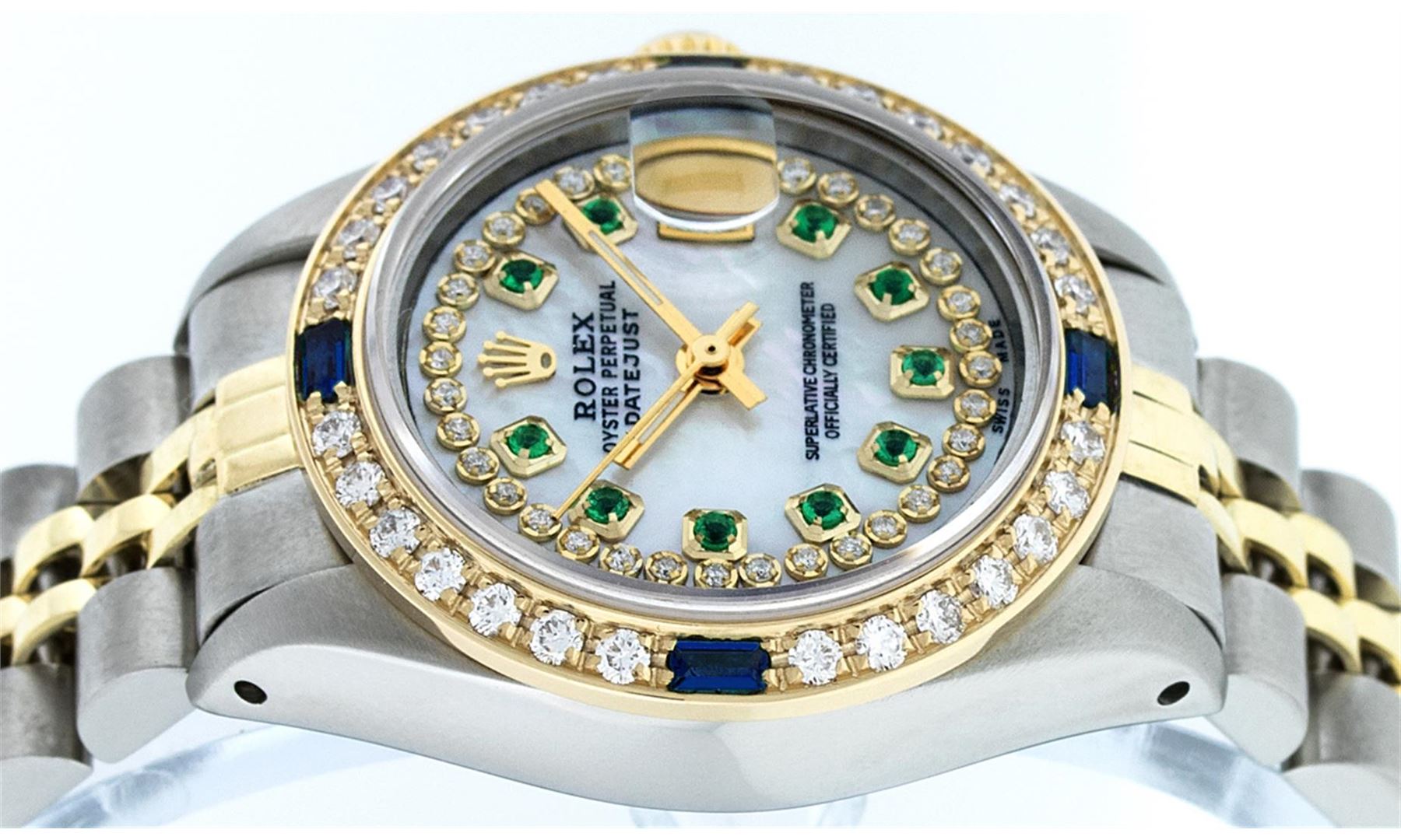 One Ladies Two Tone Rolex Datejust Polished, Serviced & Electronically Tested, 14K Yellow Gold & Stainless Steel Case:26mm, 14K Yellow Gold Crown, Custom Bezel: 18K Yellow Gold Sapphire Beadset Diamond Bezel, Diamond Count: 28 Diamonds + 4 Sapphires. Total Weight .70 Carat, Clarity: Si-VS, Color: G to H. Custom Crystal: Synthetic Sapphire Cyclops Lens. Movement: Automatic Winding Movement Caliber 2030. Custom Dial: Mother Of Pearl With Emerald String Diamond Hour Markers. Stone Count: 10 Emeralds + 33 Diamonds In Dial, Clarity: SI-VS, Color: G to H. Date Window: 3 O'Clock Position Date Display, Model: Datejust. Condition: G-6 Extra Fine. Bracelet: Two Tone 14K Yellow Gold & Stainless Steel Jubilee Band. Bright Polish. 6.0 Inch Length, Adjustable. Standard Clasp, With Rolex Logo.