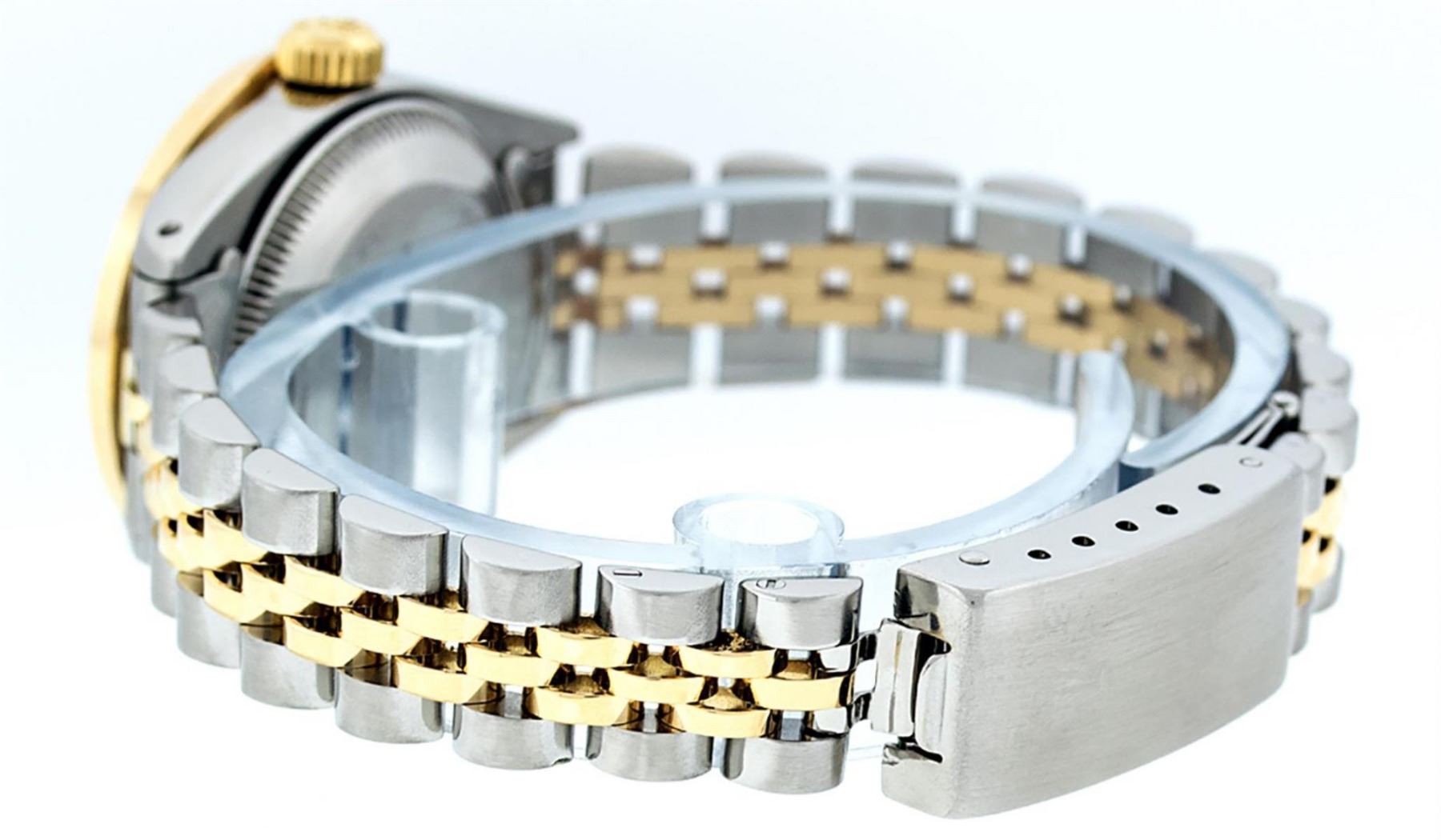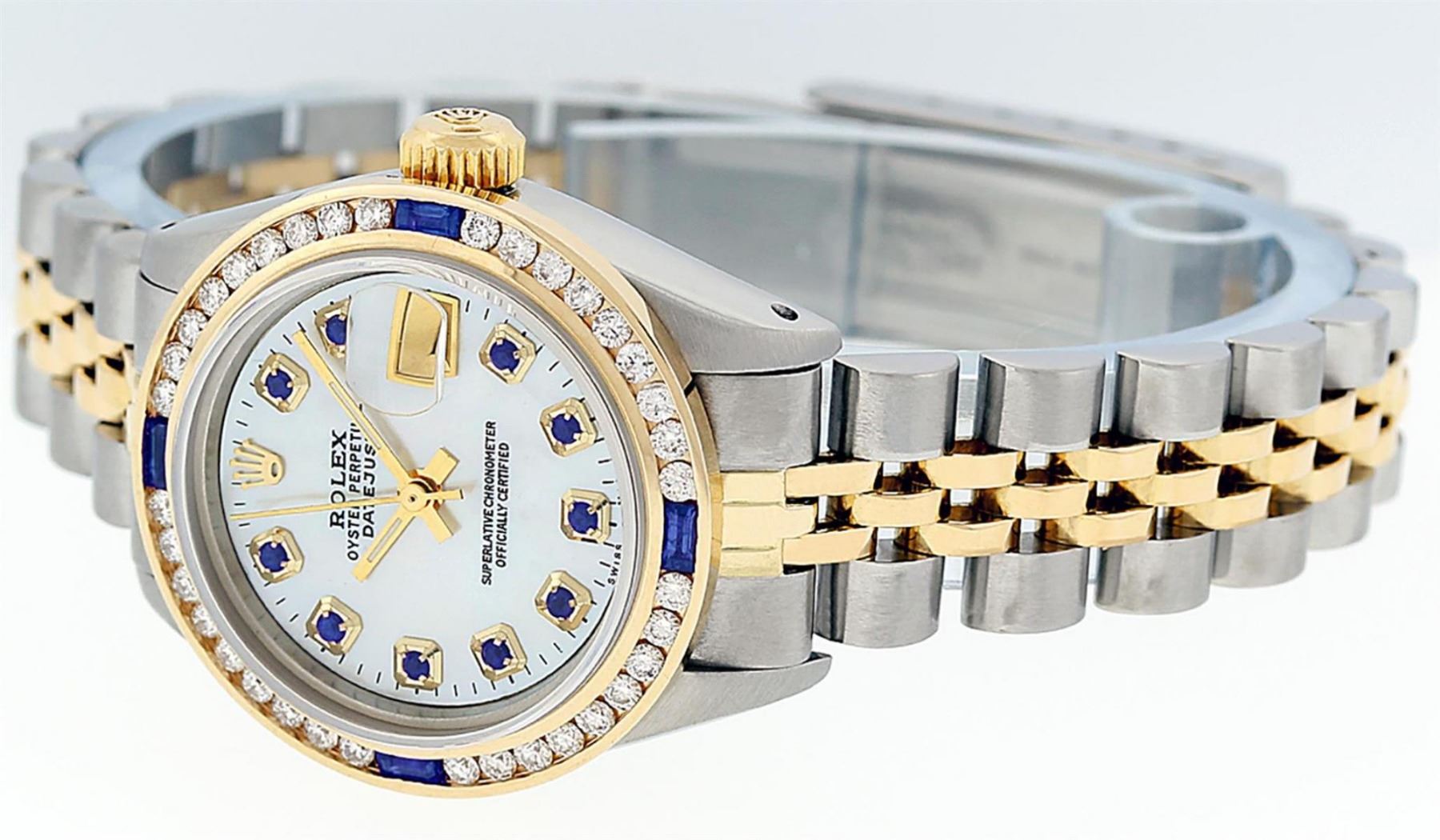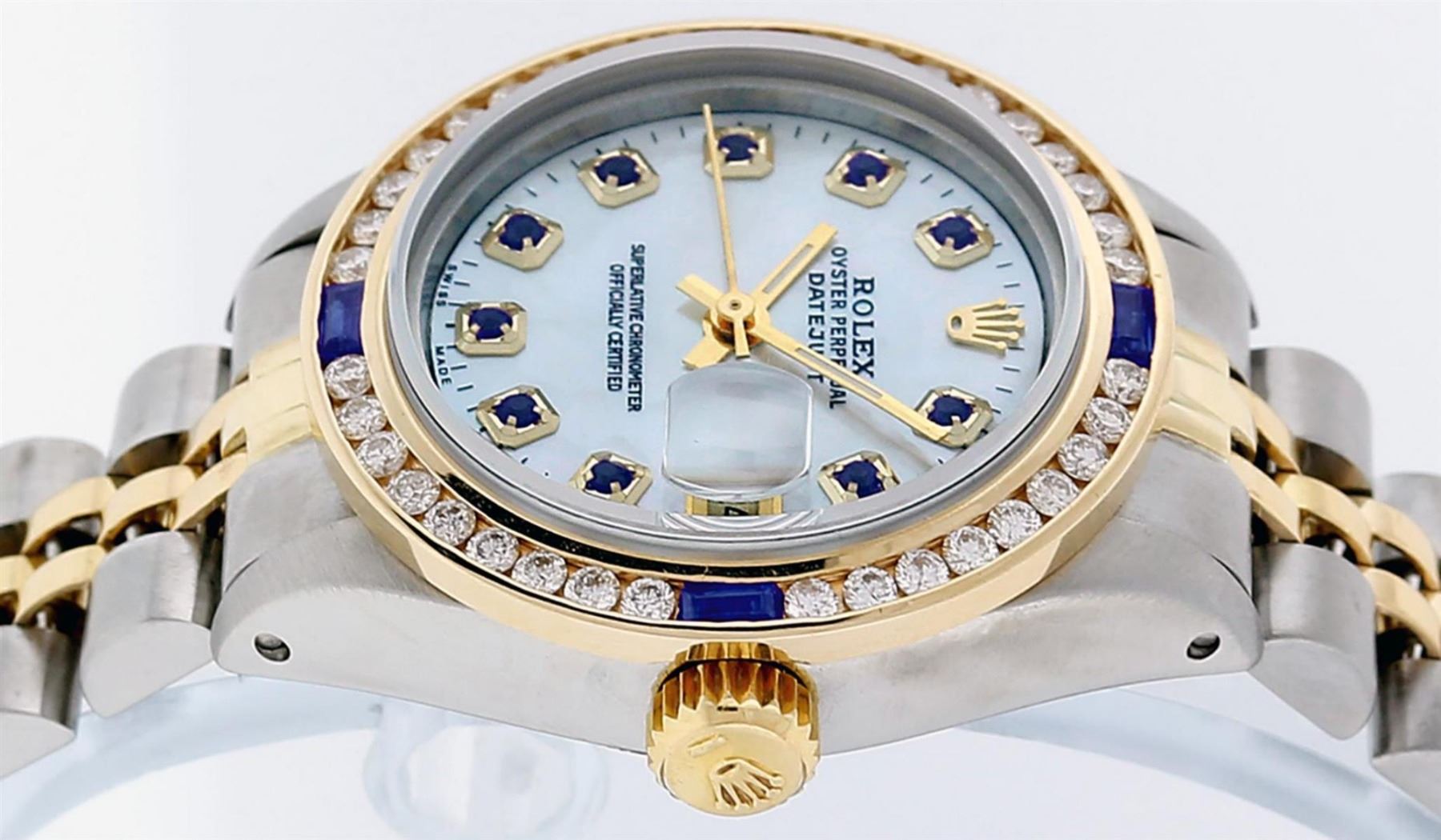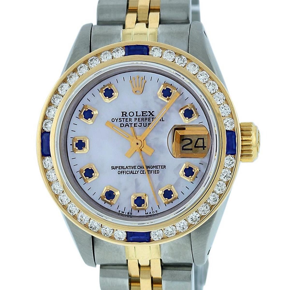 One Ladies Two Tone Rolex Datejust Polished, Serviced & Electronically Tested, Yellow Gold & Stainless Steel Case: 26mm, Yellow Gold Crown, Custom Bezel: New 18K Yellow Gold Sapphire Channel Set Diamond Bezel, Diamond + Gem Count: 36 Diamonds + 4 Sapphires, Total Weight 1.00 Carat, Clarity: SI-VS, Color: G to H. Custom Crystal: New Scratch Resistant Synthetic Sapphire Cyclops Lens. Custom Hands: New Luminescent Hands. Movement: Automatic Winding Movement. Custom Dial: Mother Of Pearl with Sapphire Hour Markers And Dash Tracks, Stone Count: 10 Sapphires In Dial. Date Window: 3 O'Clock Position Date Display, Model: Datejust, Condition: G-6 Extra Fine. Bracelet: Two Tone Yellow Gold & Stainless Steel Jubilee. Bright Polish. 6.0 Inch Length, Adjustable. Standard Clasp, With Rolex Logo. This Watch Has Been Serviced Time Tested And Is In Excellent Condition It Is Free Of All Scratches And Dents.