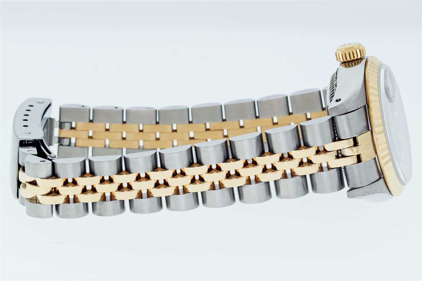 One Ladies Quickset Pre Owned Two Tone 18K Yellow Gold & Stainless Steel Rolex Datejust Polished, Serviced & Electronically Tested, Rolex Yellow Gold & Stainless Steel Case: 26mm, Rolex Yellow Gold Crown, Rolex Bezel: Rolex 18K Yellow Gold Fluted Bezel. Crystal: Sapphire Crystal With Date Window. Hands: Lumi Hands. Rolex Movement: Quickset Automatic Winding Movement 2135. Custom Dial: Custom Blue Vignette Dial With Aftermarket Added Genuine Diamonds, Diamond Count: 10 Diamonds On Dial. Date Window: 3 O'Clock Position Date Display, Model: Quickset Datejust. Condition: G-6 Extra Fine. Rolex Bracelet: Two Tone 18K Yellow Gold & Stainless Steel Jubilee Band. Bright Polish. 6.0 Inch Length, Adjustable. Standard Clasp, With Rolex Logo. This Watch Has Been Serviced Time Tested And Is In Excellent Condition It Is Free Of All Scratches And Dents.