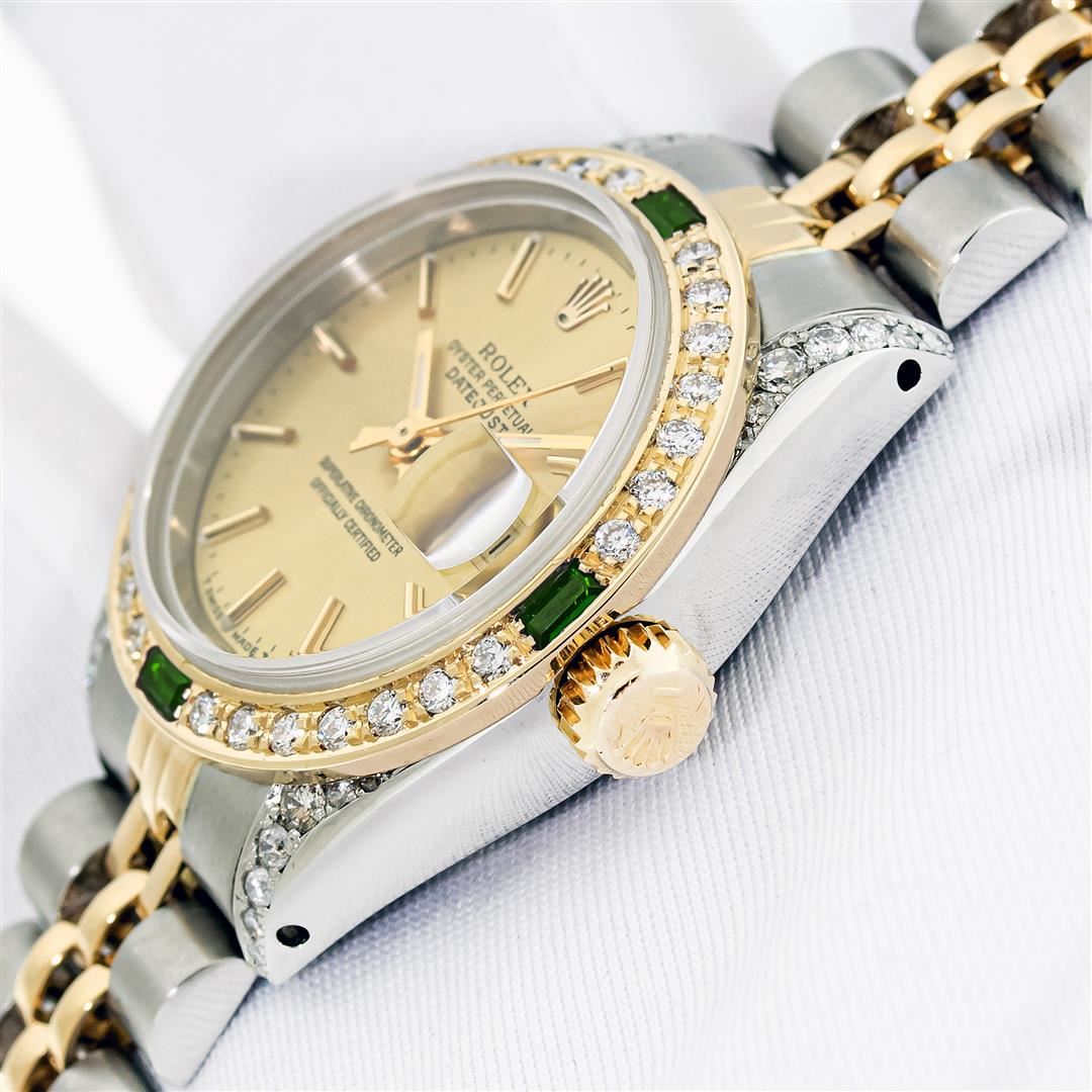 Rolex Ladies Pre Owned Quickset 18K Yellow Gold and Stainless Steel Two Tone Wristwatch Polished Bright with Satin Finish, Serviced & Electronically Tested, Rolex Stainless Steel Case: 26mm, Custom Diamond Lugs: Added Diamonds On Lugs, Diamond Count: 24 D
