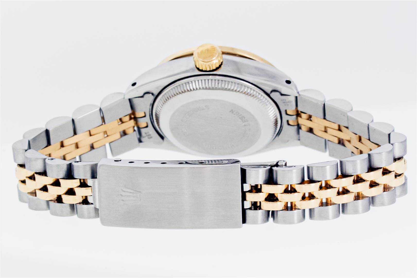 Rolex Ladies Pre Owned Quickset 18K Yellow Gold and Stainless Steel Two Tone Wristwatch Polished Bright with Satin Finish, Serviced & Electronically Tested, Rolex Stainless Steel Case: 26mm, Custom Diamond Lugs: Added Diamonds On Lugs, Diamond Count: 24 D