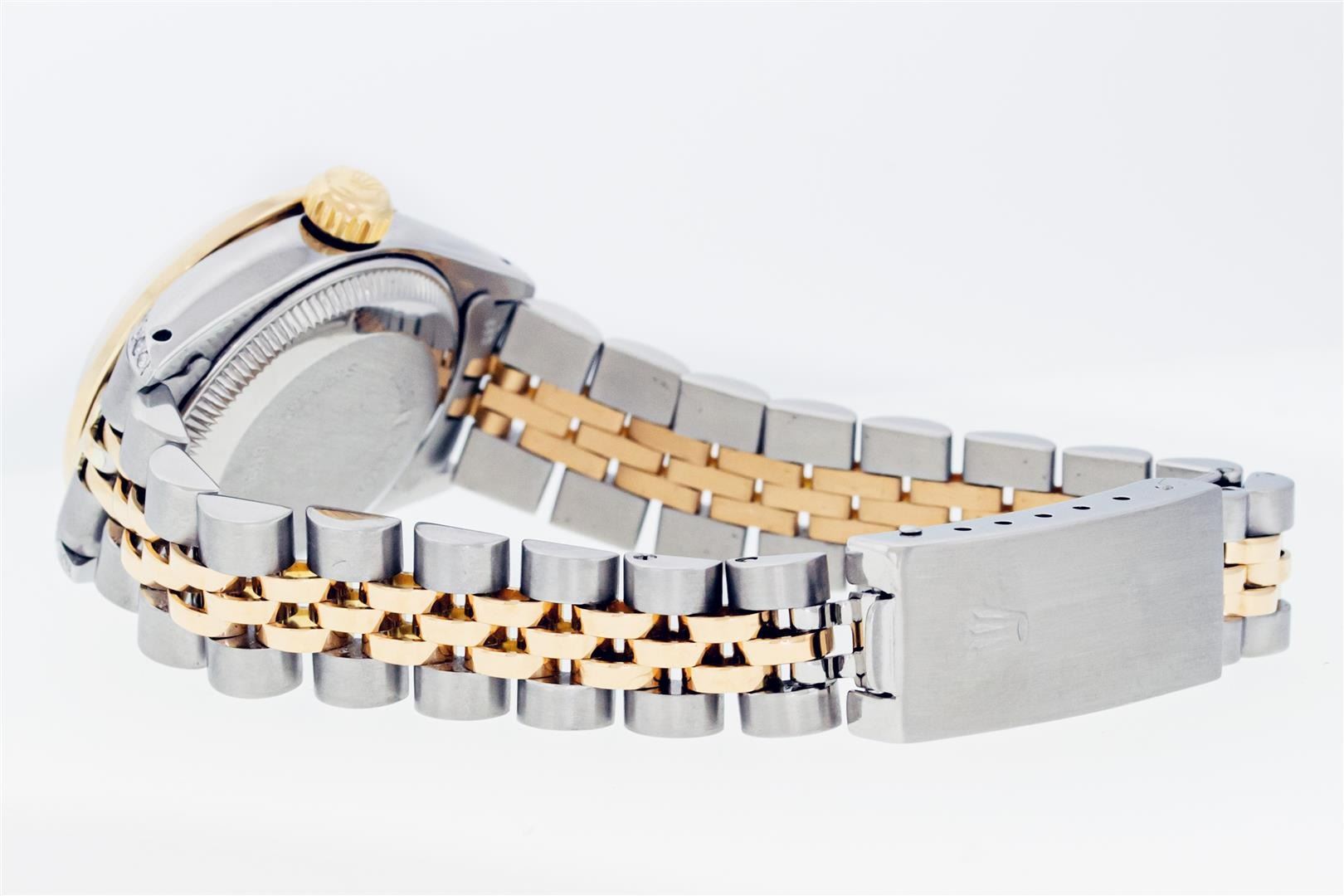 Rolex Ladies Pre Owned Quickset 18K Yellow Gold and Stainless Steel Two Tone Wristwatch Polished Bright with Satin Finish, Serviced & Electronically Tested, Rolex Stainless Steel Case: 26mm, Custom Diamond Lugs: Added Diamonds On Lugs, Diamond Count: 24 D