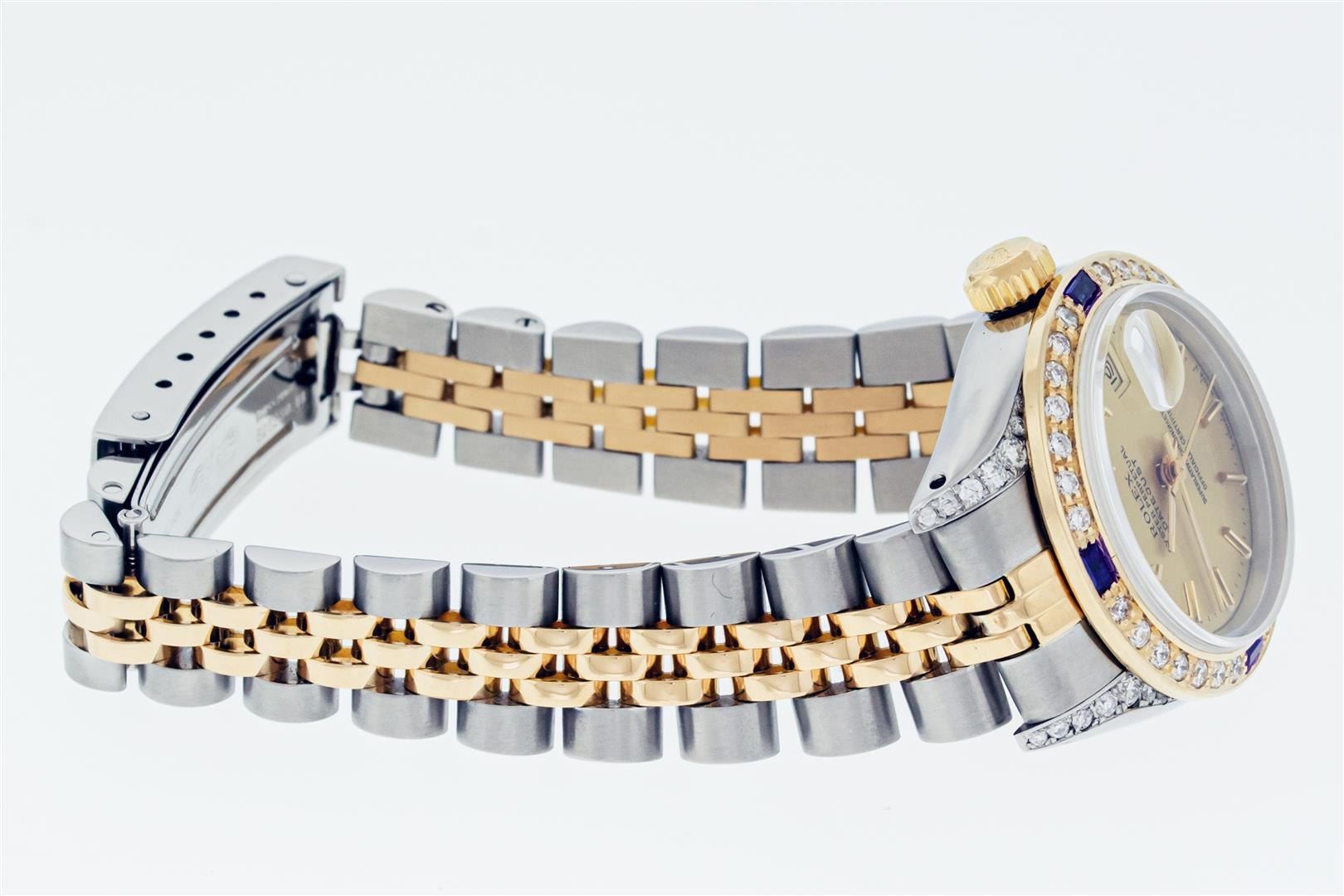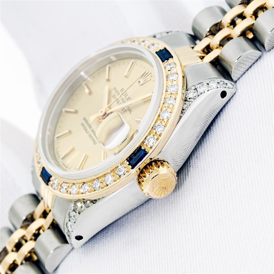 Rolex Ladies Pre Owned Quickset 18K Yellow Gold and Stainless Steel Two Tone Wristwatch Polished Bright with Satin Finish, Serviced & Electronically Tested, Rolex Stainless Steel Case: 26mm, Custom Diamond Lugs: Added Diamonds On Lugs, Diamond Count: 24 Diamonds On Lugs, Color: G To H, Clarity: SI-VS. Rolex Yellow Gold Crown, Custom Bezel: New 18K Yellow Gold Beadset And Sapphire Diamond Bezel, Stone Count: 28 Diamonds + 4 Sapphires On Bezel. Custom Crystal: New Sapphire With Magnified Date Window. Custom Hands: New Hands. Rolex Movement: Automatic Winding Movement. Rolex Dial: Champagne Dial With Dash Track & Lumi Dots, Date Window: 3 O'Clock Position Date Display, Model: Quickset Datejust, Condition: G-6 Extra Fine. Rolex Bracelet: Stainless Steel and 18K Yellow Gold Jubilee Band. Bright Polish & Satin Finish. 6.0 Inch Length, Adjustable. Standard Clasp, With Rolex Logo. This Watch Has Been Serviced Time Tested And Is In Excellent Condition It Is Free Of All Scratches And Dents.