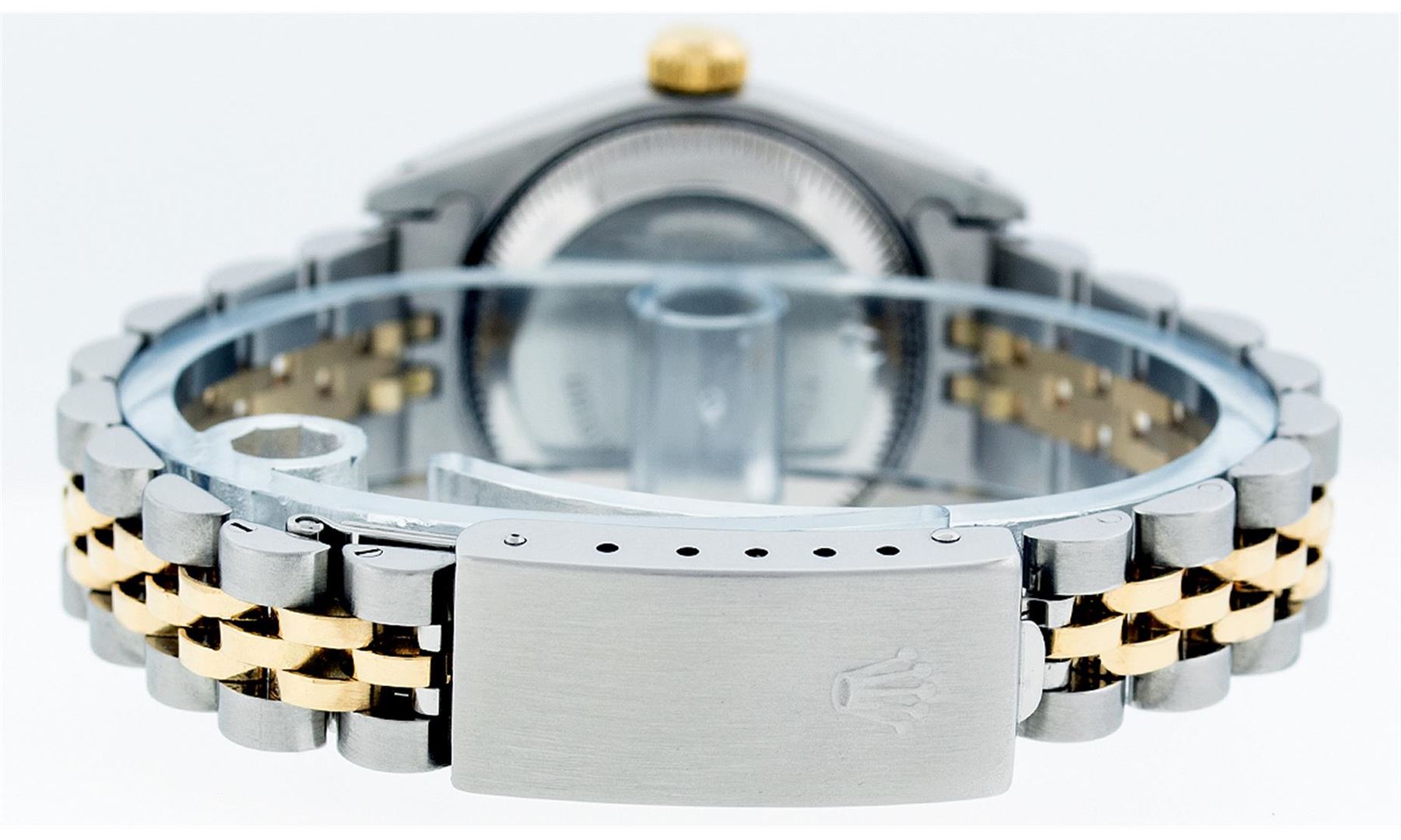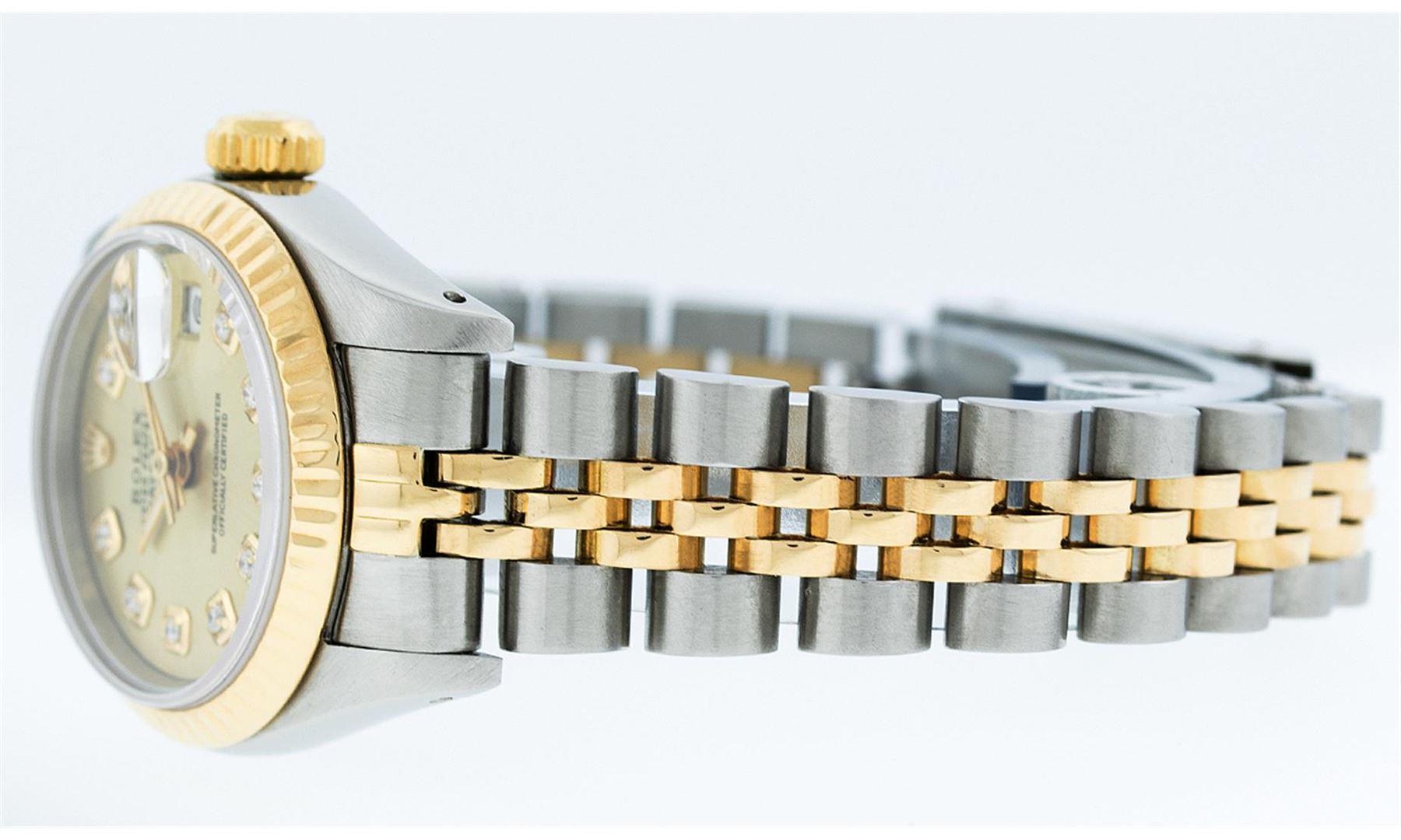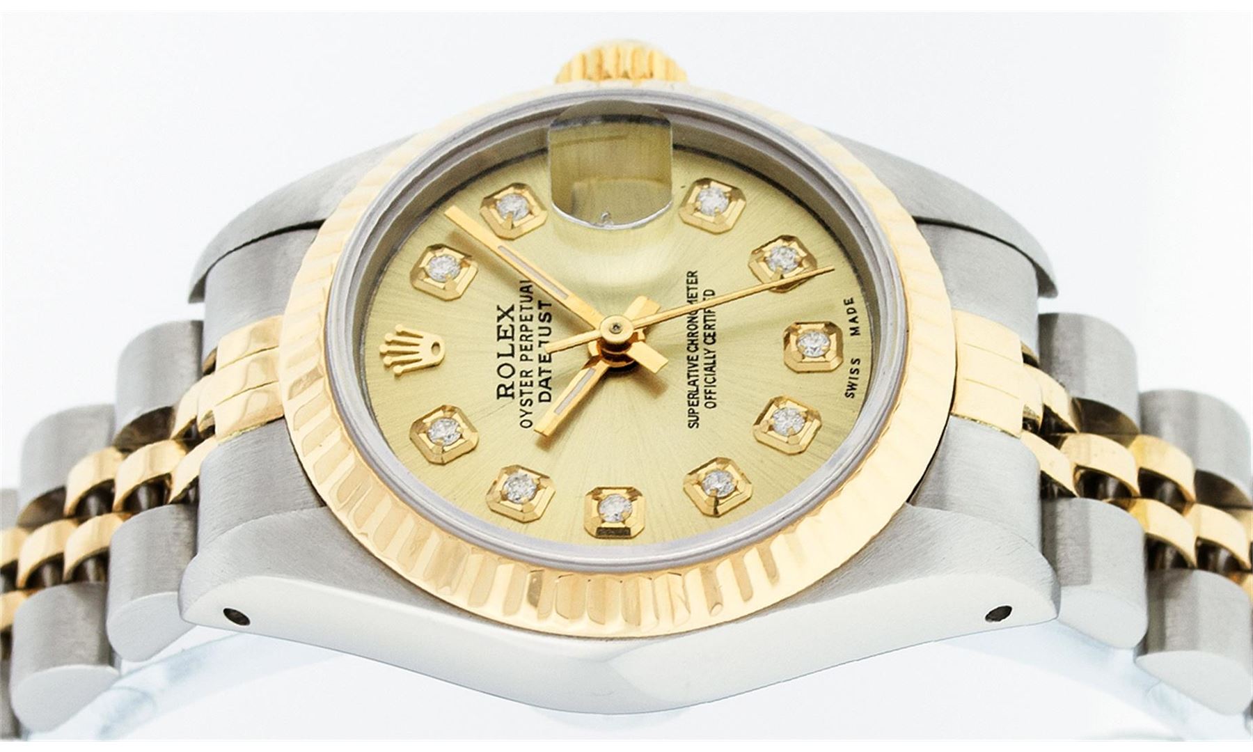 One Ladies Two Tone Rolex Datejust Polished, Serviced & Electronically Tested, 18K Yellow Gold & Stainless Steel Case:26mm, 18K Yellow Gold Crown, Bezel: 18K Yellow Gold Fluted Bezel. Custom Crystal: Acrylic Cyclops Lens. Movement: Automatic Winding Movement Caliber 2135. Custom Champagne With Diamond Hour Markers, Diamond Count: 10 Diamonds, Color: G to H, Clarity: VS2-SI1. Date Window: 3 O'Clock Position Date Display, Quickset, Model: Quickset 69173. Condition: G-6 Extra Fine. Bracelet: Two Tone 18K Yellow Gold & Stainless Steel Jubilee. Bright Polish. 6.0 Inch Length, Adjustable. Standard Clasp, With Rolex Logo.
