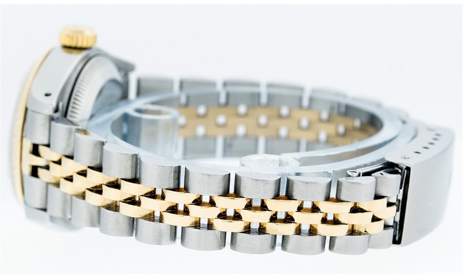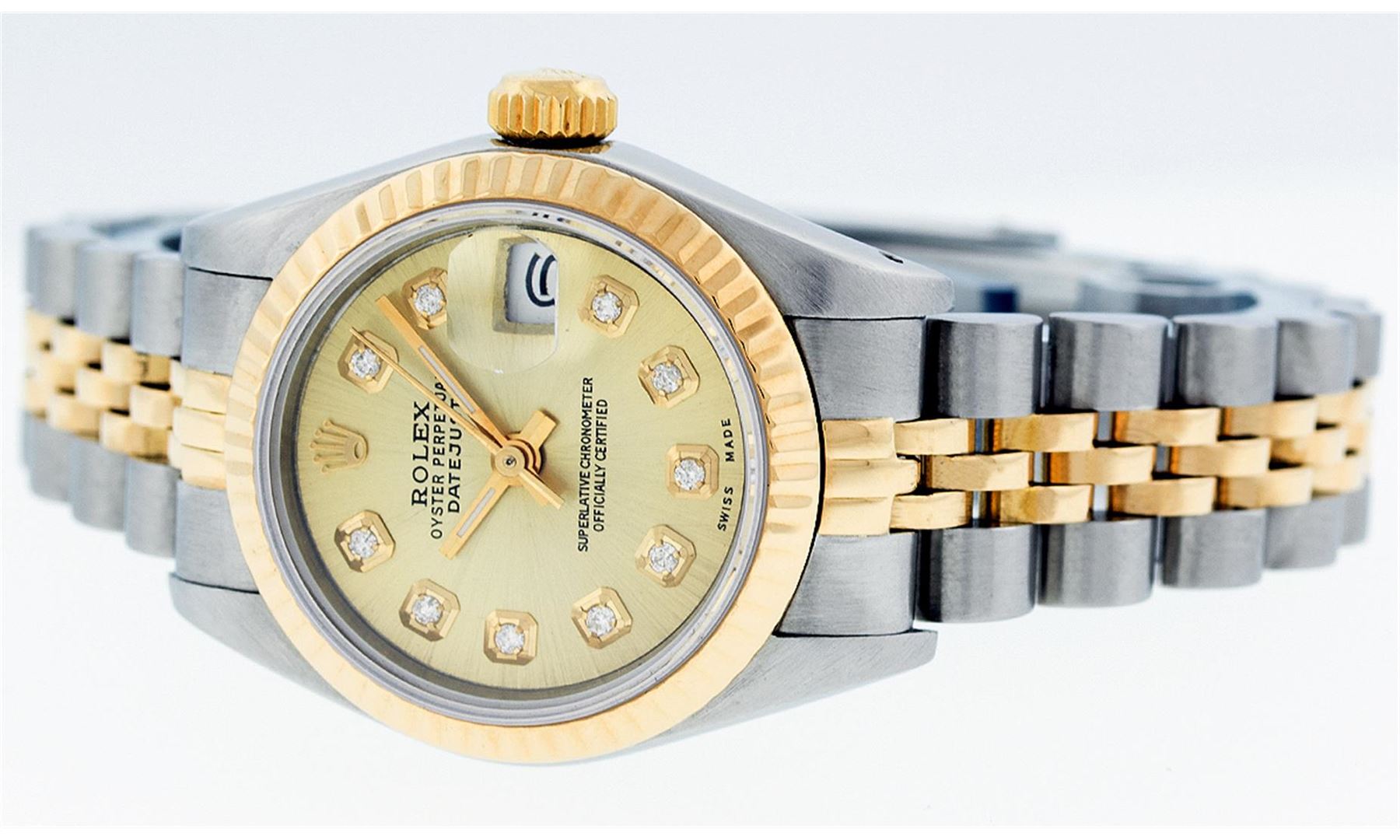 One Ladies Two Tone Rolex Datejust Polished, Serviced & Electronically Tested, 18K Yellow Gold & Stainless Steel Case:26mm, 18K Yellow Gold Crown, Bezel: 18K Yellow Gold Fluted Bezel. Custom Crystal: Acrylic Cyclops Lens. Movement: Automatic Winding Movement Caliber 2135. Custom Champagne With Diamond Hour Markers, Diamond Count: 10 Diamonds, Color: G to H, Clarity: VS2-SI1. Date Window: 3 O'Clock Position Date Display, Quickset, Model: Quickset 69173. Condition: G-6 Extra Fine. Bracelet: Two Tone 18K Yellow Gold & Stainless Steel Jubilee. Bright Polish. 6.0 Inch Length, Adjustable. Standard Clasp, With Rolex Logo.