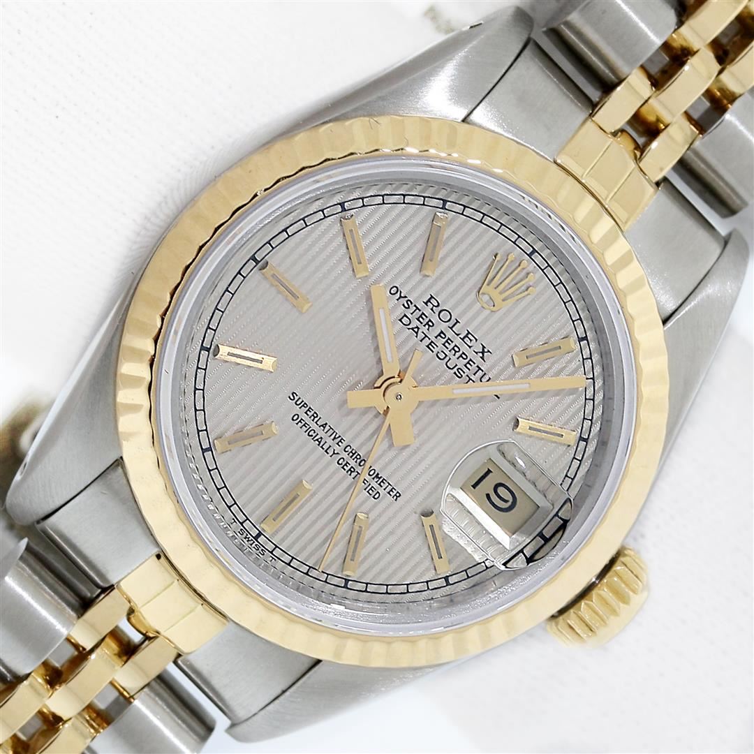 One Ladies Pre Owned 18K Two Tone Rolex Datejust Polished, Serviced & Electronically Tested, Rolex 18K Yellow Gold & Stainless Steel Case: 26mm, Rolex Yellow Gold Crown, Rolex Bezel: 18K Yellow Gold Fluted Bezel. Crystal: Sapphire With Magnified Date Window. Hands: Luminescent Hands. Rolex Movement: Quickset Automatic Winding Movement. Rolex Dial: Silver Index Tapestry With Square Track. Date Window: 3 O'Clock Position Date Display, Model: Quickset Datejust. Condition: G-6 Extra Fine. Rolex Bracelet: Two Tone 18K Yellow Gold & Stainless Steel Jubilee Band. Bright Polish. 6.0 Inch Length, Adjustable. Standard Clasp, With Rolex Logo. This Watch Has Been Serviced Time Tested And Is In Excellent Condition It Is Free Of All Scratches And Dents.