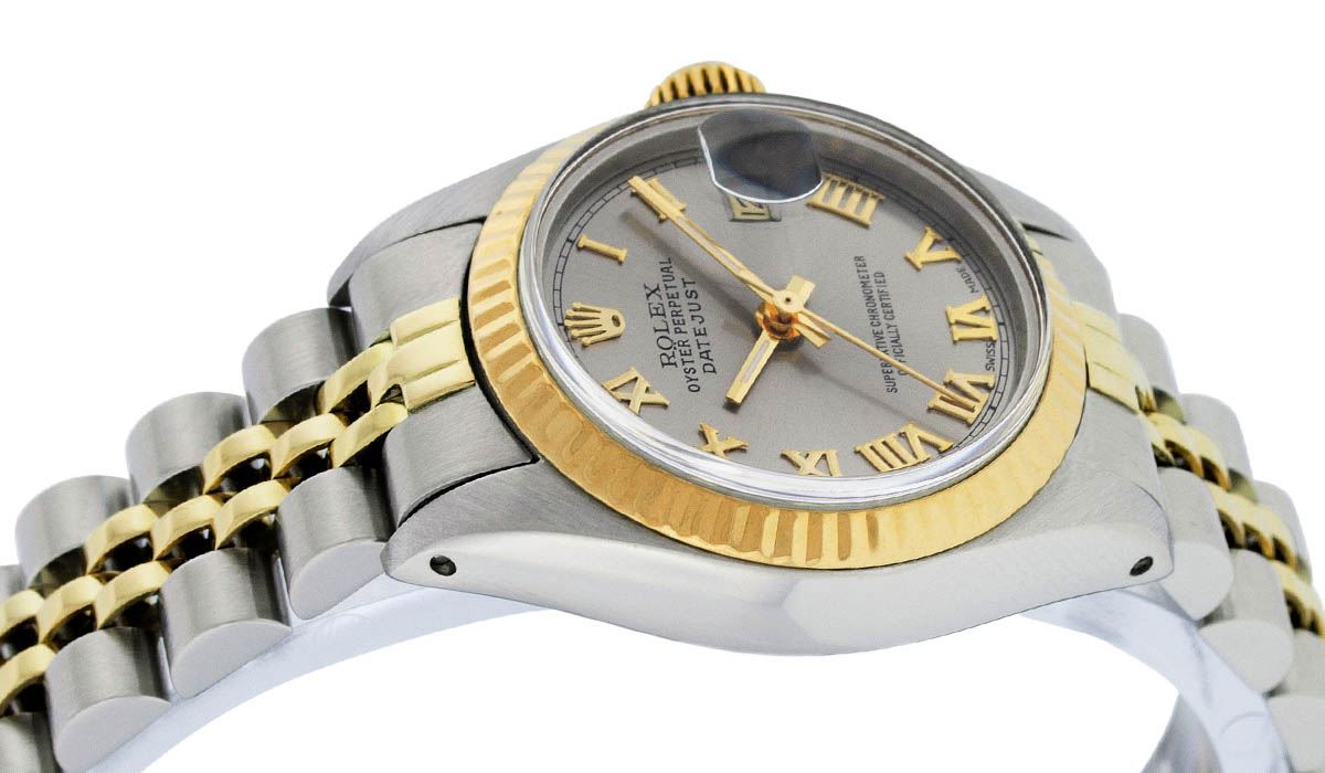One Ladies Two Tone Rolex Datejust Polished, Serviced & Electronically Tested, 14K Yellow Gold & Stainless Steel Case:26mm, 14K Yellow Gold Crown, Bezel: 14K Yellow Gold Fluted Bezel. Custom Crystal: Acrylic Cyclops Lens. Movement: Automatic Winding Movement Caliber 2030. Custom Dial: Slate Grey Roman Dial. Date Window: 3 O'Clock Position Date Display, Model: Datejust. Condition: G-6 Extra Fine. Bracelet: Two Tone 14K Yellow Gold & Stainless Steel Jubilee. Bright Polish. 5.5 Inch Length, Adjustable. Standard Clasp, With Rolex Logo. This watch has been serviced and polished and its free of all dents and scratches and has been time tested.