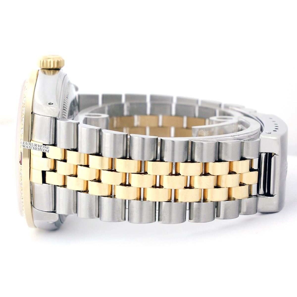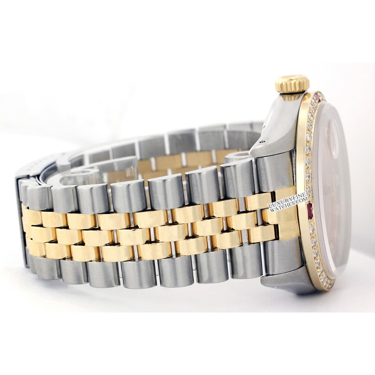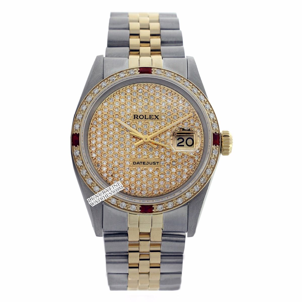 WATCH DETAILS: ITEM: WatchBRAND: RolexTYPE: Two ToneFEATURE: MODEL: DateJustMADE: Swiss MadeGENDER: LadiesCONDITION: Pre-OwnedFUNCTION: DateDIAL COLOR: GoldHOUR MARKERS: Full Diamond PaveBEZEL TYPE: Diamond & Ruby BezelBEZEL STONE: Diamond G-VVS1 & 4 Burmise RubyBEZEL MATERIAL: 18K GoldBRACELET TYPE: Jubilee BRACELET MATERIAL: 14K Yellow Gold & Stainless SteelCLASP TYPE: Folding ClaspCLASP MATERIAL: Stainless SteelCASE STONE: CASE SIZE: 36mmCRYSTAL: Scratch Resistance Sapphire CrystalMOVEMENT: Automatic (Self Winding)CALIBER: 2035CROWN TYPE: Screw Down CrownWATER RESISTANCE: Waterproof to 10 ATM/100 meters/330 feetMODEL #: 6917SKU #: ALTJNS80We Buy/Sell/Trade Valuable watches, Please call usNote: Presentational generic box included. This watch was professionally inspected and serviced prior to auction. We are not affiliated with Rolex USA, Inc.