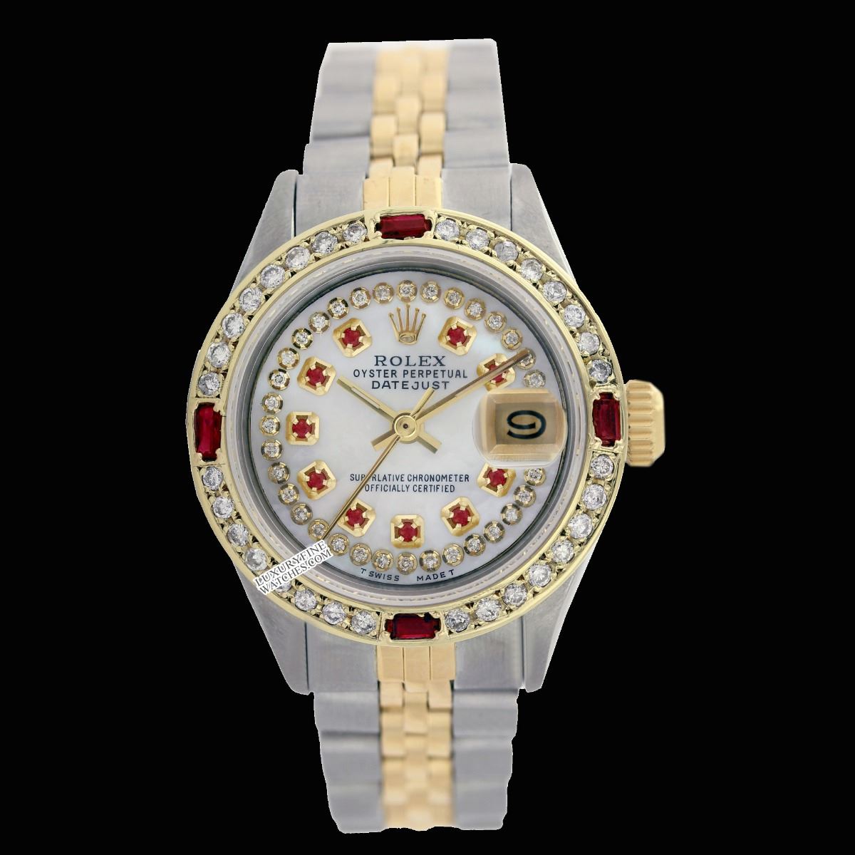 WATCH DETAILS: ITEM: WatchBRAND: RolexTYPE: Two ToneFEATURE: MODEL: DateJustMADE: Swiss MadeGENDER: LadiesCONDITION: Pre-OwnedFUNCTION: DateDIAL COLOR: WhiteHOUR MARKERS: String Diamond + 10 Round RubyBEZEL TYPE: Diamond & Ruby BezelBEZEL STONE: Diamond G-VVS1 & 4 Burmise RubyBEZEL MATERIAL: 18K GoldBRACELET TYPE: Jubilee BRACELET MATERIAL: 14K Yellow Gold & Stainless SteelCLASP TYPE: Folding ClaspCLASP MATERIAL: Stainless SteelCASE STONE: CASE SIZE: 36mmCRYSTAL: Scratch Resistance Sapphire CrystalMOVEMENT: Automatic (Self Winding)CALIBER: 2035CROWN TYPE: Screw Down CrownWATER RESISTANCE: Waterproof to 10 ATM/100 meters/330 feetMODEL #: 6917SKU #: ALTJNS73We Buy/Sell/Trade Valuable watches, Please call usNote: Presentational generic box included. This watch was professionally inspected and serviced prior to auction. We are not affiliated with Rolex USA, Inc.