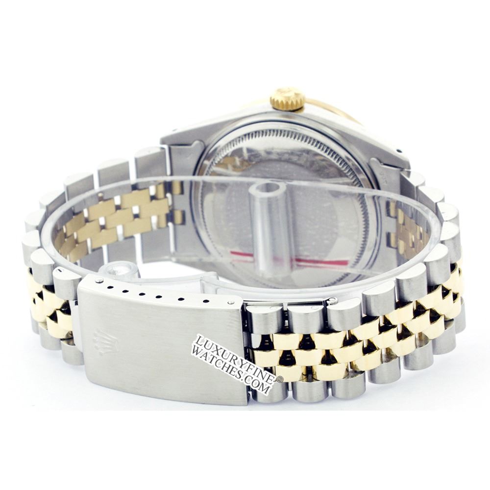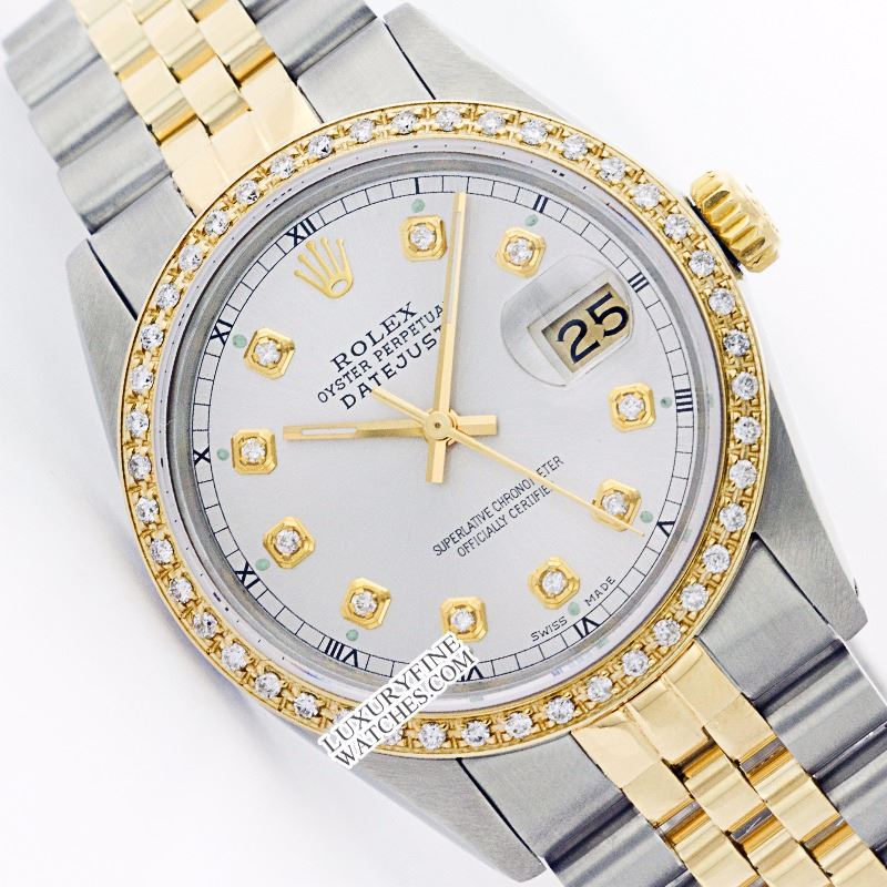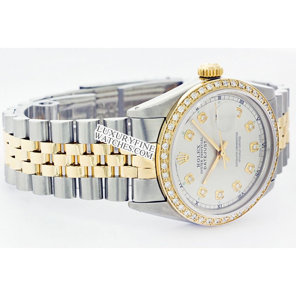 WATCH DETAILS: ITEM: WatchBRAND: RolexTYPE: Two ToneFEATURE: MODEL: DateJustMADE: Swiss MadeGENDER: LadiesCONDITION: Pre-OwnedFUNCTION: DateDIAL COLOR: SilverHOUR MARKERS: 10 Round DiamondBEZEL TYPE: Diamond BezelBEZEL STONE: Diamond .80 CTW G-VVS1 BEZEL MATERIAL: 18K GoldBRACELET TYPE: Jubilee BRACELET MATERIAL: 14K Yellow Gold & Stainless SteelCLASP TYPE: Folding ClaspCLASP MATERIAL: Stainless SteelCASE STONE: CASE SIZE: 36mmCRYSTAL: Scratch Resistance Sapphire CrystalMOVEMENT: Automatic (Self Winding)CALIBER: 2035CROWN TYPE: Screw Down CrownWATER RESISTANCE: Waterproof to 10 ATM/100 meters/330 feetMODEL #: 6917SKU #: ALTJNS117We Buy/Sell/Trade Valuable watches, Please call usNote: Presentational generic box included. This watch was professionally inspected and serviced prior to auction. We are not affiliated with Rolex USA, Inc.