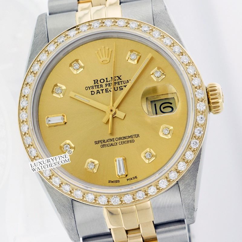 WATCH DETAILS: ITEM: WatchBRAND: RolexTYPE: Two ToneFEATURE: MODEL: DateJustMADE: Swiss MadeGENDER: LadiesCONDITION: Pre-OwnedFUNCTION: DateDIAL COLOR: ChampagneHOUR MARKERS: 8 Round & 2 Baguette DiamondBEZEL TYPE: Diamond BezelBEZEL STONE: Diamond .80 CTW G-VVS1 BEZEL MATERIAL: 18K GoldBRACELET TYPE: Jubilee BRACELET MATERIAL: 14K Yellow Gold & Stainless SteelCLASP TYPE: Folding ClaspCLASP MATERIAL: Stainless SteelCASE STONE: CASE SIZE: 36mmCRYSTAL: Scratch Resistance Sapphire CrystalMOVEMENT: Automatic (Self Winding)CALIBER: 2035CROWN TYPE: Screw Down CrownWATER RESISTANCE: Waterproof to 10 ATM/100 meters/330 feetMODEL #: 6917SKU #: ALTJNS96We Buy/Sell/Trade Valuable watches, Please call usNote: Presentational generic box included. This watch was professionally inspected and serviced prior to auction. We are not affiliated with Rolex USA, Inc.
