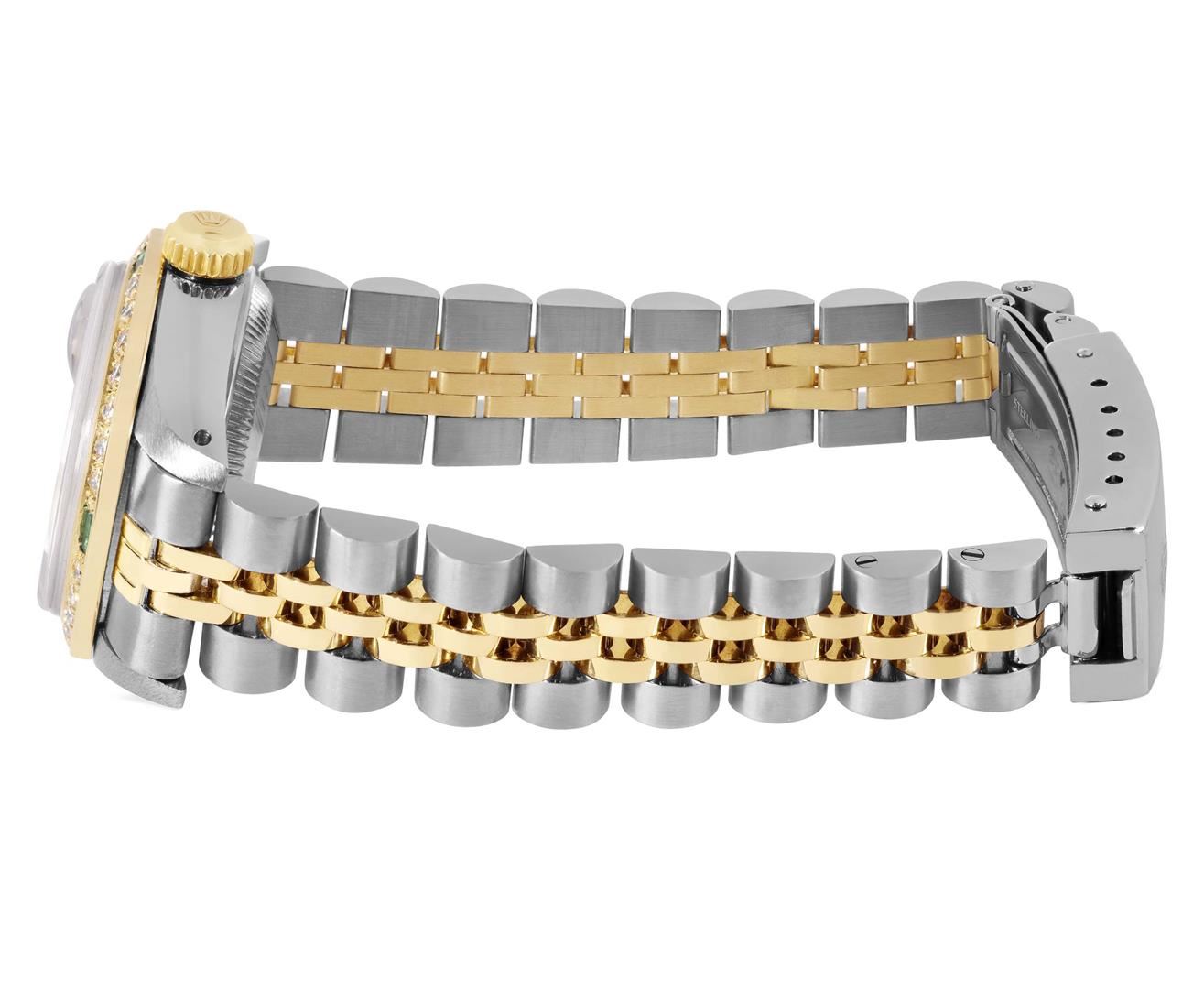 One Rolex Ladies Pre Owned Two Tone Yellow Gold & Stainless Steel Rolex Date Watch Polished, Serviced & Electronically Tested, Rolex Yellow Gold & Stainless Steel Case: 26mm, Rolex Yellow Gold Crown. Custom Bezel: New 18K Yellow Gold Emerald Beadset Diamo