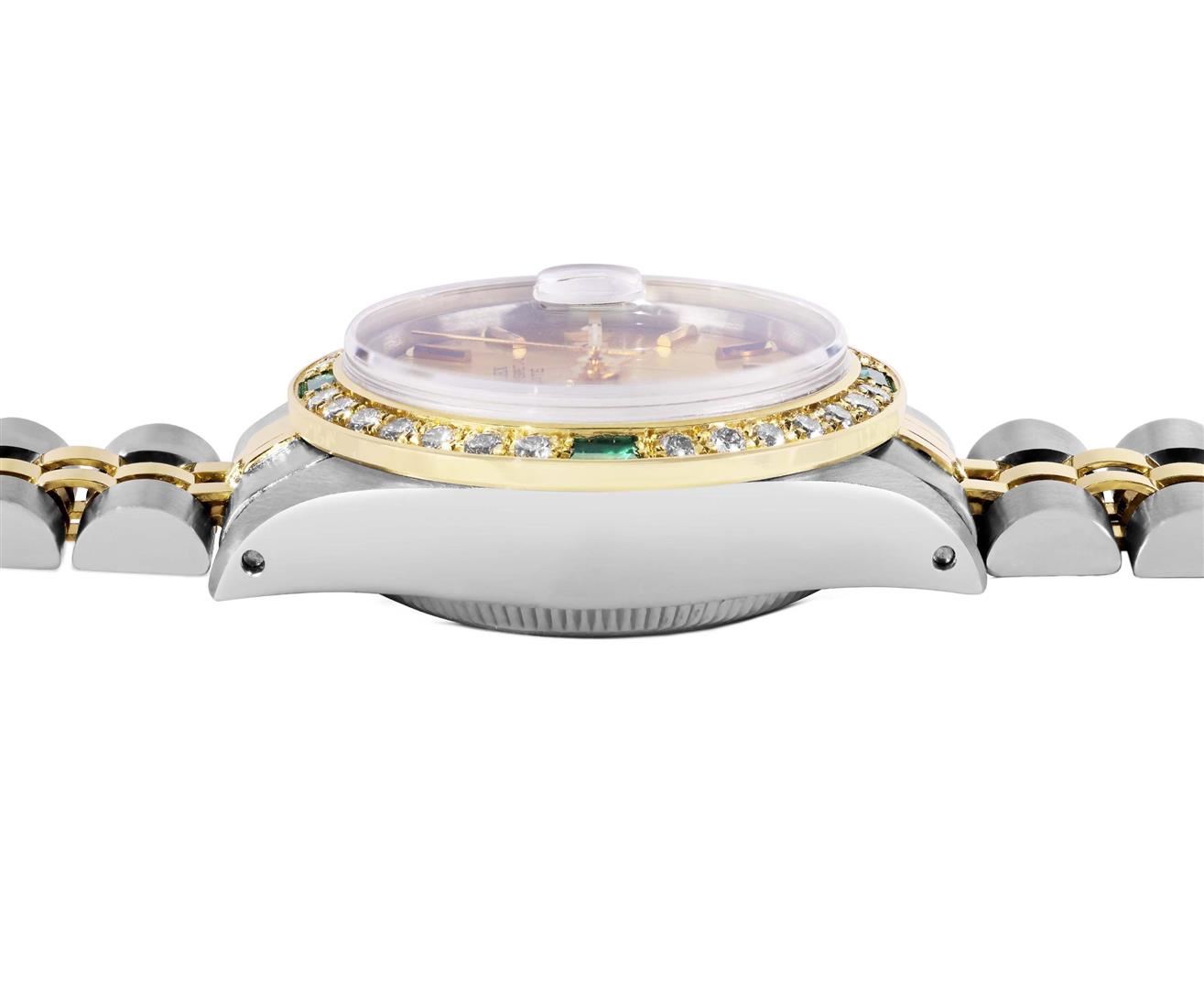 One Rolex Ladies Pre Owned Two Tone Yellow Gold & Stainless Steel Rolex Date Watch Polished, Serviced & Electronically Tested, Rolex Yellow Gold & Stainless Steel Case: 26mm, Rolex Yellow Gold Crown. Custom Bezel: New 18K Yellow Gold Emerald Beadset Diamond Bezel, Diamond + Gem Count: 36 Diamonds + 4 Emeralds, Clarity: SI-VS, Color: G to H. Custom Crystal: New Sapphire Crystal With Date Window. Custom Hands: New Luminescent Hands. Rolex Movement: Automatic Winding Movement 2030. Rolex Factory Dial: Champagne Dial With Baton Index Markers And Dash Track. Date Window: 3 O'Clock Position Date Display, Condition: G-6 Extra Fine. Rolex Bracelet: Two Tone 14K Yellow Gold & Stainless Steel Jubilee Band. Bright Polish & Satin Finish. 6.0 Inch Length, Adjustable. Standard Clasp, With Rolex Logo. This Watch Has Been Serviced Time Tested And Is In Excellent Condition It Is Free Of All Scratches And Dents. This Watch Comes With A Rolex Box.