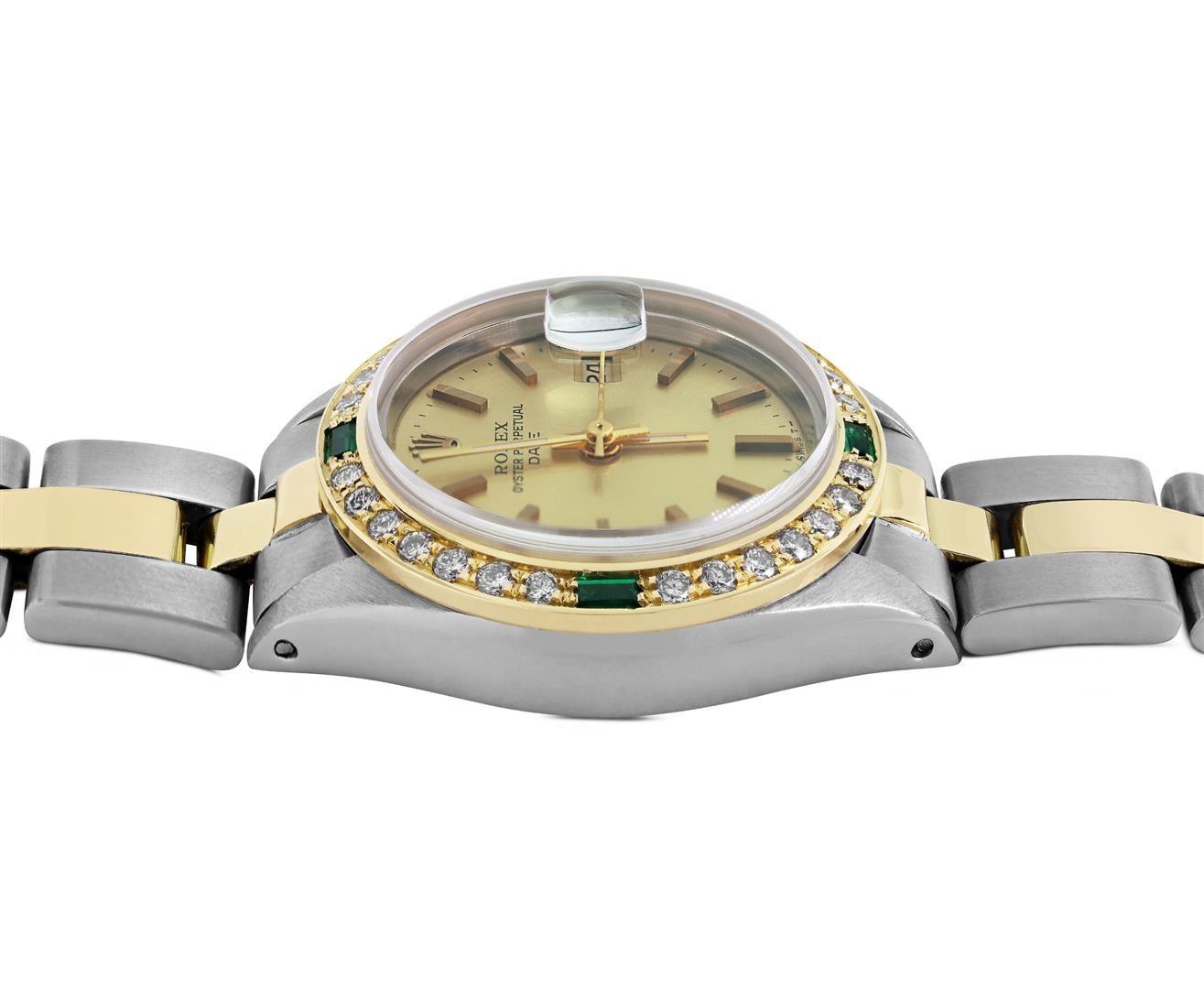 One Rolex Ladies Pre Owned Two Tone Yellow Gold & Stainless Steel Rolex Date Watch Polished, Serviced & Electronically Tested, Rolex Yellow Gold & Stainless Steel Case: 26mm, Rolex Yellow Gold Crown. Custom Bezel: New 18K Yellow Gold Emerald Beadset Diamo