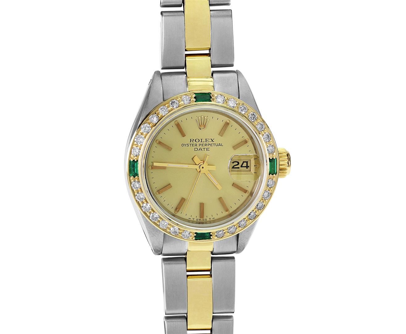 One Rolex Ladies Pre Owned Two Tone Yellow Gold & Stainless Steel Rolex Date Watch Polished, Serviced & Electronically Tested, Rolex Yellow Gold & Stainless Steel Case: 26mm, Rolex Yellow Gold Crown. Custom Bezel: New 18K Yellow Gold Emerald Beadset Diamond Bezel, Diamond + Gem Count: 36 Diamonds + 4 Emeralds, Clarity: SI-VS, Color: G to H. Custom Crystal: New Sapphire Crystal With Date Window. Custom Hands: New Luminescent Hands. Rolex Movement: Automatic Winding Movement 2030. Rolex Factory Dial: Champagne With Index Hour Markers And Dash Track. Date Window: 3 O'Clock Position Date Display, Condition: G-6 Extra Fine. Rolex Bracelet: Two Tone 14K Yellow Gold & Stainless Steel Oyster Band. Bright Polish. 6.0 Inch Length, Adjustable. Standard Clasp, With Rolex Logo. This Watch Has Been Serviced Time Tested And Is In Excellent Condition It Is Free Of All Scratches And Dents. This Watch Comes With A Rolex Box.