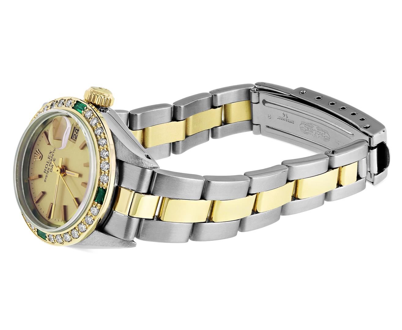 One Rolex Ladies Pre Owned Two Tone Yellow Gold & Stainless Steel Rolex Date Watch Polished, Serviced & Electronically Tested, Rolex Yellow Gold & Stainless Steel Case: 26mm, Rolex Yellow Gold Crown. Custom Bezel: New 18K Yellow Gold Emerald Beadset Diamond Bezel, Diamond + Gem Count: 36 Diamonds + 4 Emeralds, Clarity: SI-VS, Color: G to H. Custom Crystal: New Sapphire Crystal With Date Window. Custom Hands: New Luminescent Hands. Rolex Movement: Automatic Winding Movement 2030. Rolex Factory Dial: Champagne With Index Hour Markers And Dash Track. Date Window: 3 O'Clock Position Date Display, Condition: G-6 Extra Fine. Rolex Bracelet: Two Tone 14K Yellow Gold & Stainless Steel Oyster Band. Bright Polish. 6.0 Inch Length, Adjustable. Standard Clasp, With Rolex Logo. This Watch Has Been Serviced Time Tested And Is In Excellent Condition It Is Free Of All Scratches And Dents. This Watch Comes With A Rolex Box.