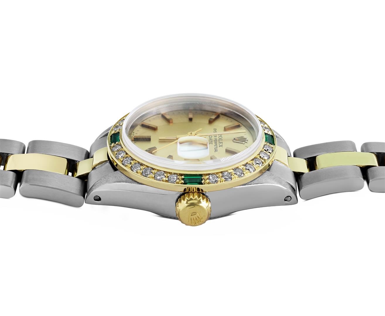 One Rolex Ladies Pre Owned Two Tone Yellow Gold & Stainless Steel Rolex Date Watch Polished, Serviced & Electronically Tested, Rolex Yellow Gold & Stainless Steel Case: 26mm, Rolex Yellow Gold Crown. Custom Bezel: New 18K Yellow Gold Emerald Beadset Diamond Bezel, Diamond + Gem Count: 36 Diamonds + 4 Emeralds, Clarity: SI-VS, Color: G to H. Custom Crystal: New Sapphire Crystal With Date Window. Custom Hands: New Luminescent Hands. Rolex Movement: Automatic Winding Movement 2030. Rolex Factory Dial: Champagne With Index Hour Markers And Dash Track. Date Window: 3 O'Clock Position Date Display, Condition: G-6 Extra Fine. Rolex Bracelet: Two Tone 14K Yellow Gold & Stainless Steel Oyster Band. Bright Polish. 6.0 Inch Length, Adjustable. Standard Clasp, With Rolex Logo. This Watch Has Been Serviced Time Tested And Is In Excellent Condition It Is Free Of All Scratches And Dents. This Watch Comes With A Rolex Box.