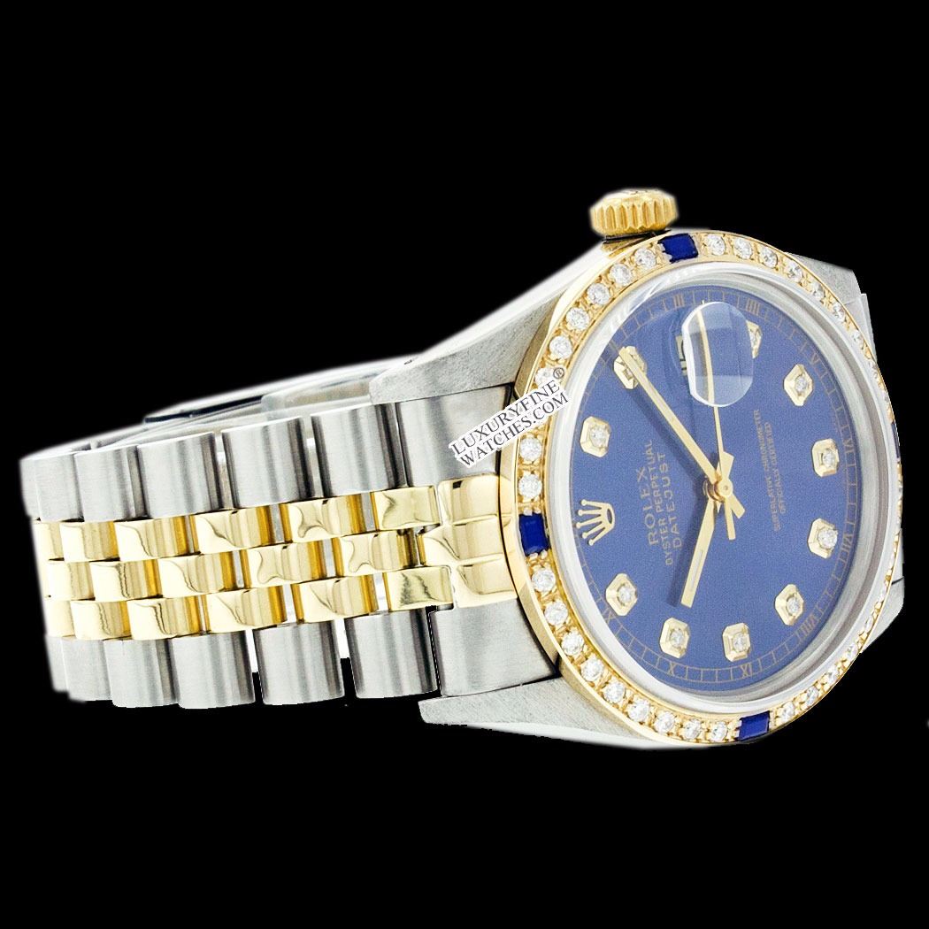 WATCH DETAILS: ITEM: WatchBRAND: RolexTYPE: Two ToneFEATURE: MODEL: DateJustMADE: Swiss MadeGENDER: LadiesCONDITION: Pre-OwnedFUNCTION: DateDIAL COLOR: BlueHOUR MARKERS: 10 Round DiamondBEZEL TYPE: Diamond & Sapphire BezelBEZEL STONE: Diamond 1 CTW G-VVS1 & Ceylon Blue SapphireBEZEL MATERIAL: 18K GoldBRACELET TYPE: Jubilee BRACELET MATERIAL: 14K Yellow Gold & Stainless SteelCLASP TYPE: Folding ClaspCLASP MATERIAL: Stainless SteelCASE STONE: CASE SIZE: 36mmCRYSTAL: Scratch Resistance Sapphire CrystalMOVEMENT: Automatic (Self Winding)CALIBER: 2035CROWN TYPE: Screw Down CrownWATER RESISTANCE: Waterproof to 10 ATM/100 meters/330 feetMODEL #: 6917SKU #: ALTJNS178We Buy/Sell/Trade Valuable watches, Please call usNote: Presentational generic box included. This watch was professionally inspected and serviced prior to auction. We are not affiliated with Rolex USA, Inc.