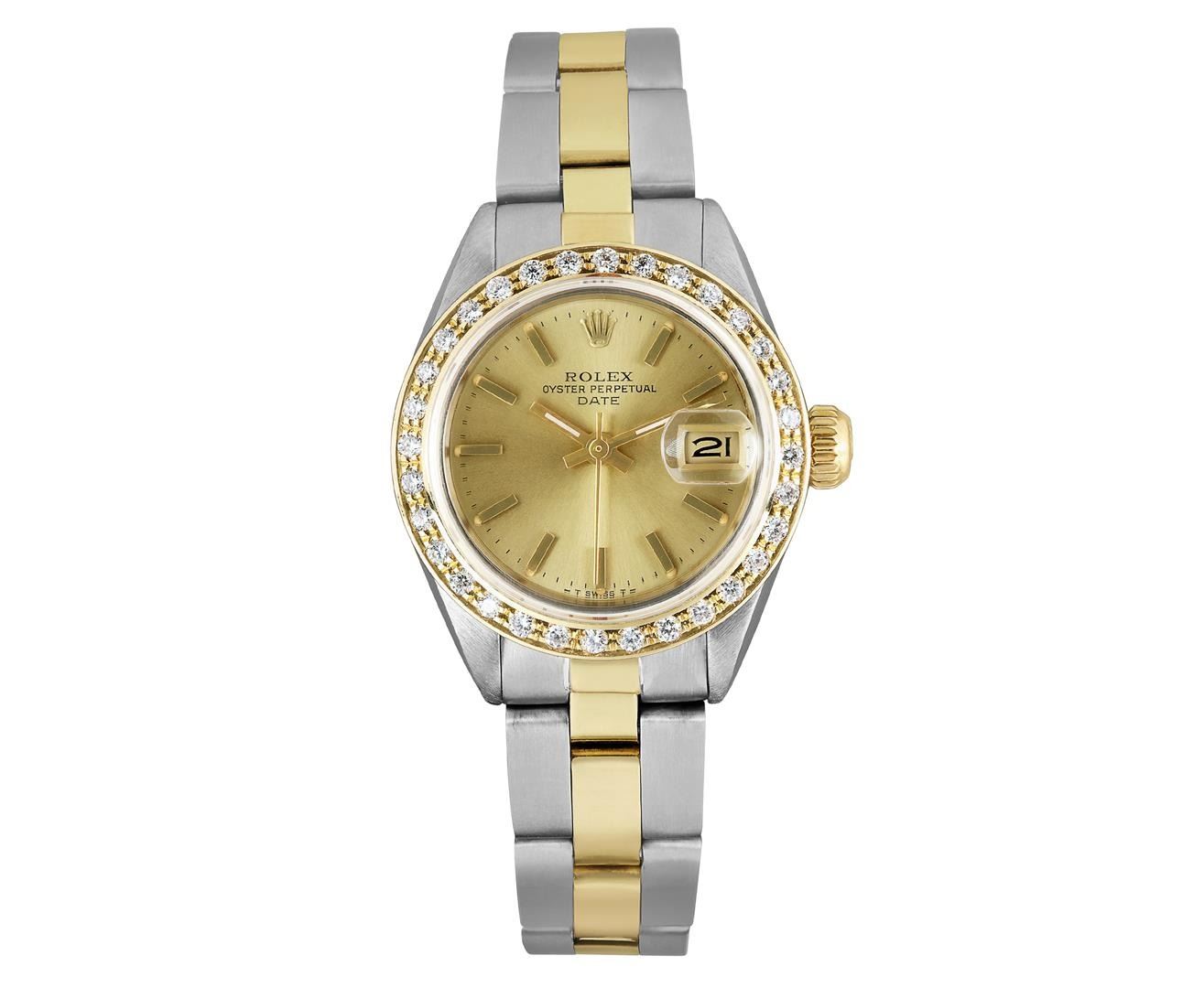 One Rolex Ladies Pre Owned Two Tone 14K Yellow Gold & Stainless Steel Rolex Date Watch Polished, Serviced & Electronically Tested, Rolex Yellow Gold & Stainless Steel Case: 26mm, Rolex Yellow Gold Crown. Custom Bezel: New 18K Yellow Gold Beadset Diamond B