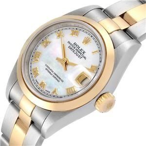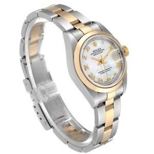 Make is stainless steel and 18 Karat yellow gold with mother of pearl dial and raised gold roman numerals. Rolex Ladies Date-Just Steel & Yellow Gold, MOP Dial Oyster Bracelet Ladies Watch Ref: 79163. 211231: Model number: 79163