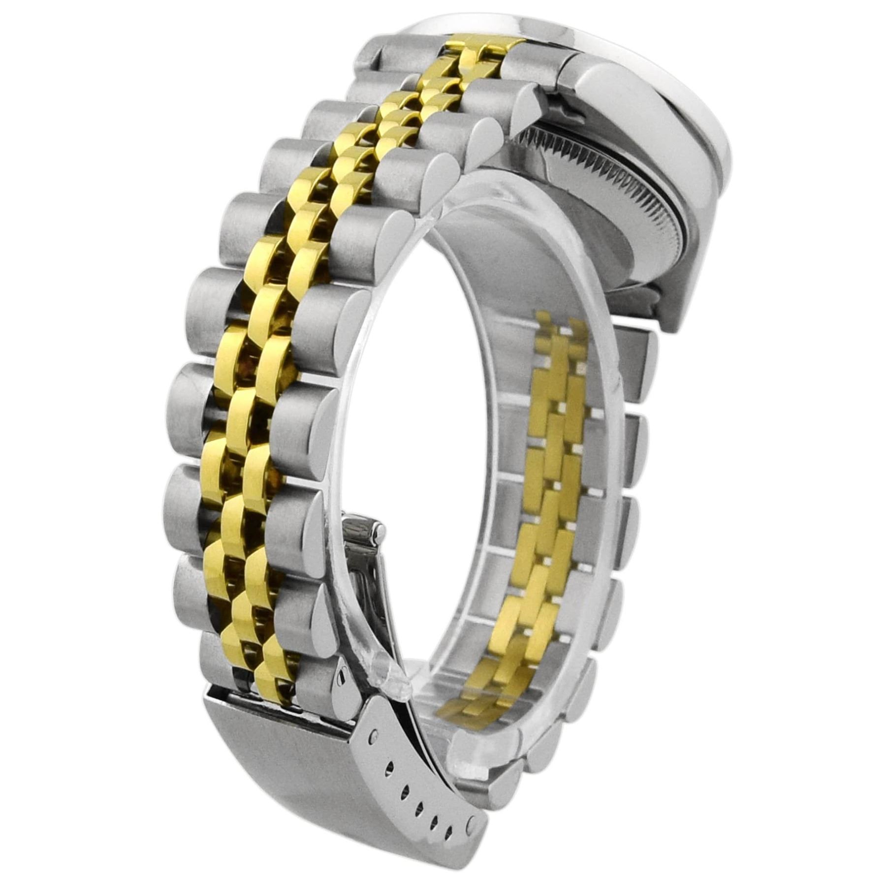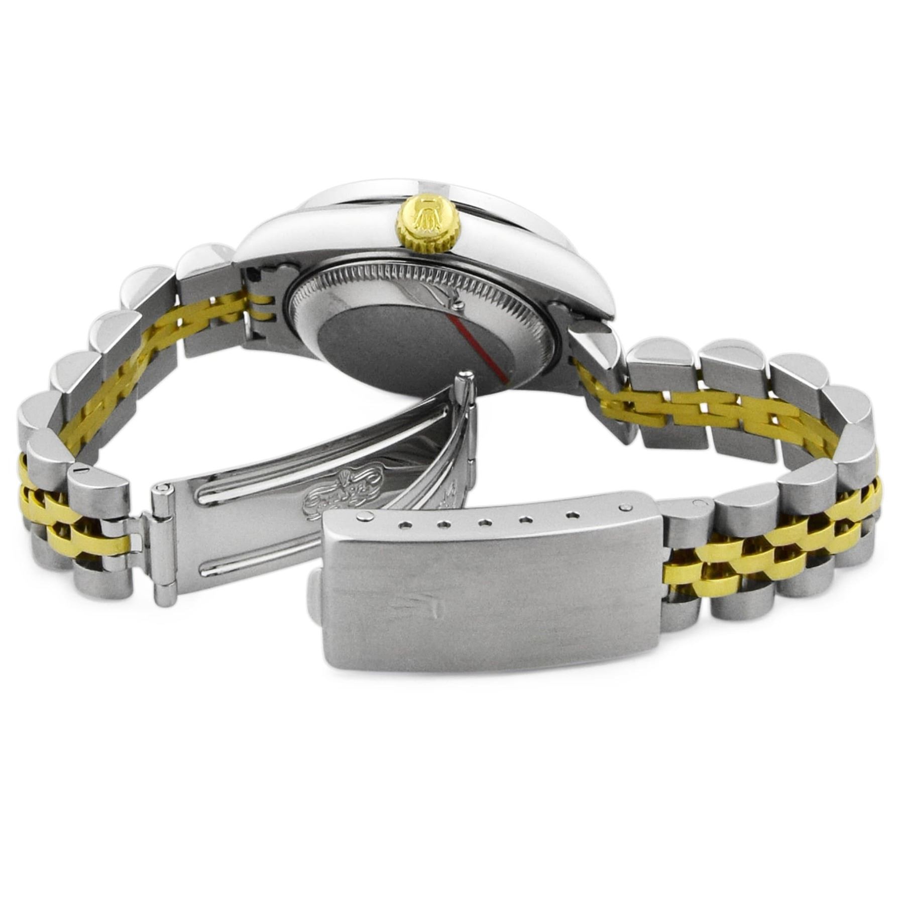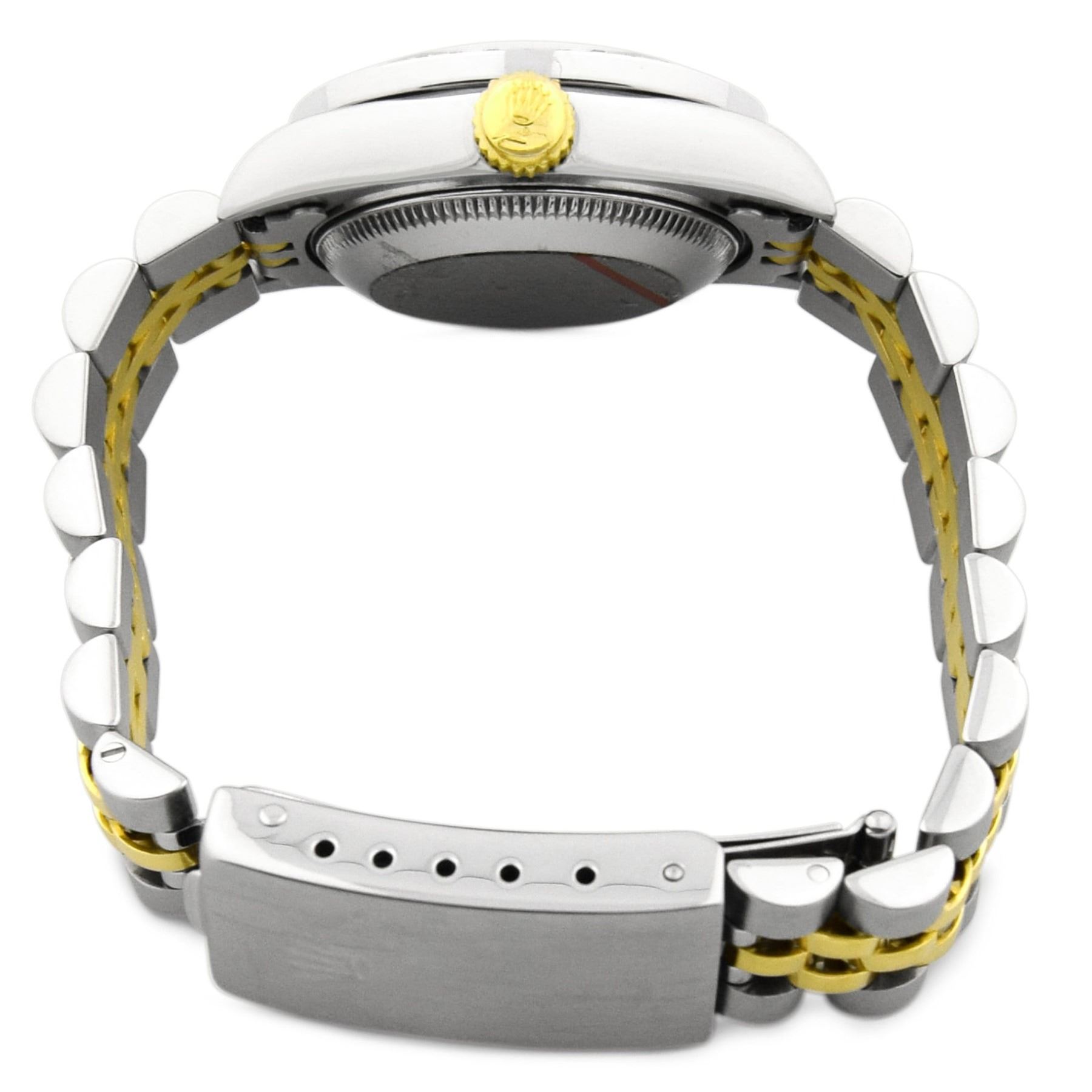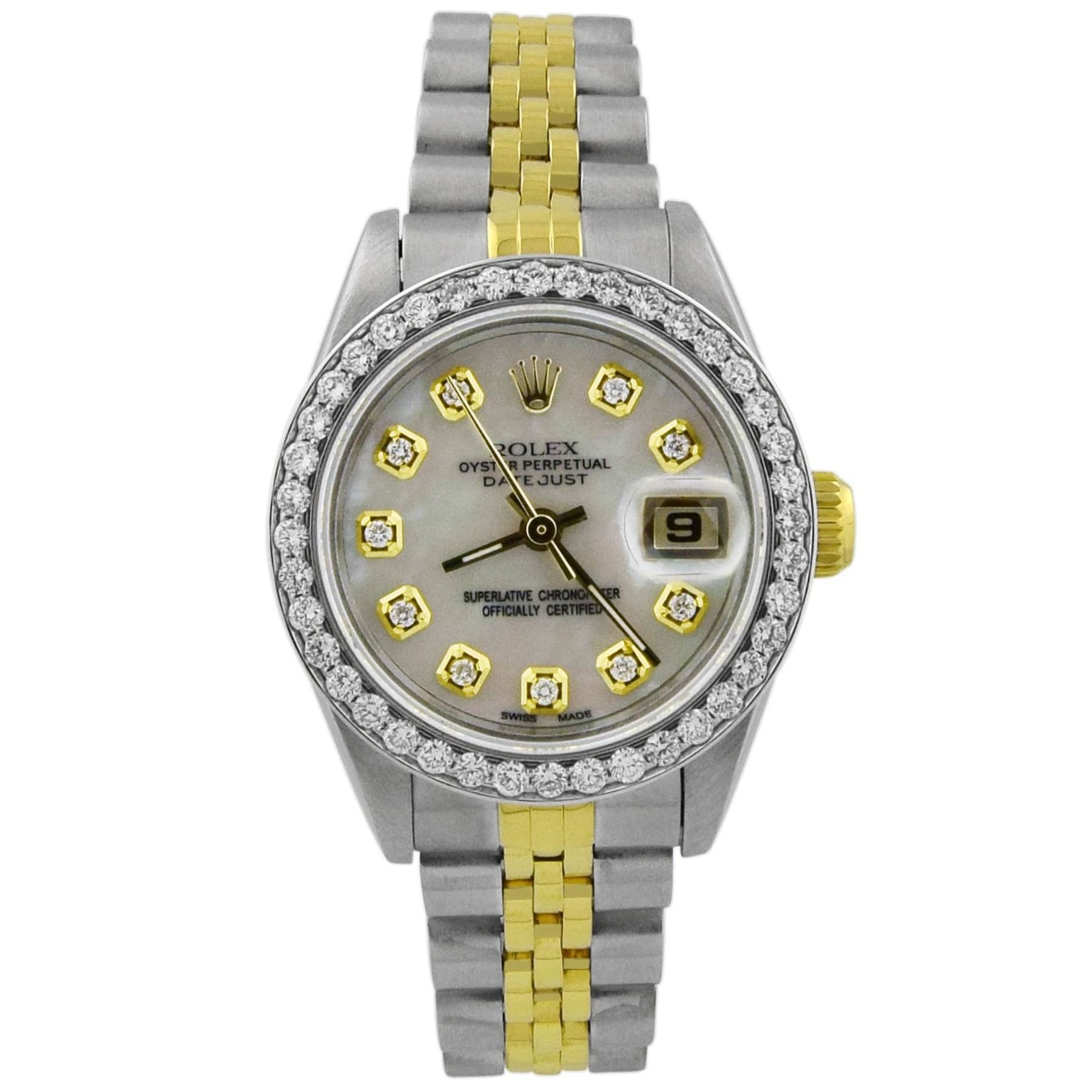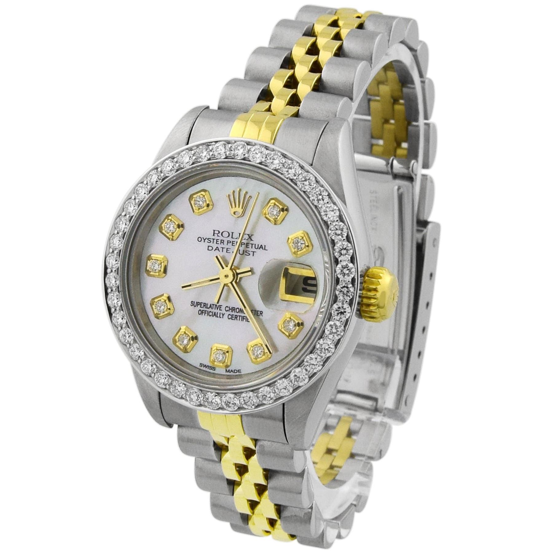 Model: Datejust 26. Reference #: 69173. Case: 18K Yellow Gold & Steel. Case Size: 26mm. Bracelet: Two-Tone Jubilee Bracelet. Dial: MOP Dial w/ Diamond Dot Hour Markers. Bezel: Custom Diamond Bezel. Date Window: 3 O'clock Position w/ Cyclops Lens. Movement: Automatic Winding Movement . Water Resistant: Yes 100 Meters/330 Feet. Crystal: Scratch-Resistant Sapphire Crystal. Condition: Pre-Owned. Box Included. Circa: 1985. All Pre-Owned watches are guaranteed to be 100% genuine. Your watch will come with a 2-year limited warranty, original box, and appraisal.