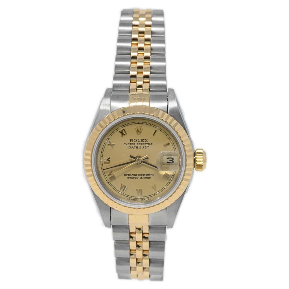 Model: Datejust 26. Reference #: 79173. Case: 18K Yellow Gold & Stainless Steel. Case Size: 26mm. Bracelet: Two-Tone Jubilee Bracelet. Dial: Champagne Dial w/ Roman Numeral Hour Marker. Bezel: Fluted Gold Bezel. Date Window: 3 O'clock Position w/ Cyclops Lens. Movement: Automatic Winding Movement; Rolex Calibre 2235. Power Reserve: 48 hours. Water Resistant: Yes 100 Meters/330 Feet. Crystal: Scratch-Resistant Sapphire Crystal. Condition: Pre-Owned; Great Condition. Rolex Box & PAPERS Included. Circa: 2000 (P Serial Number). All Pre-Owned watches are guaranteed to be 100% genuine. Your watch will come with a 2-year limited warranty, original box, and appraisal.