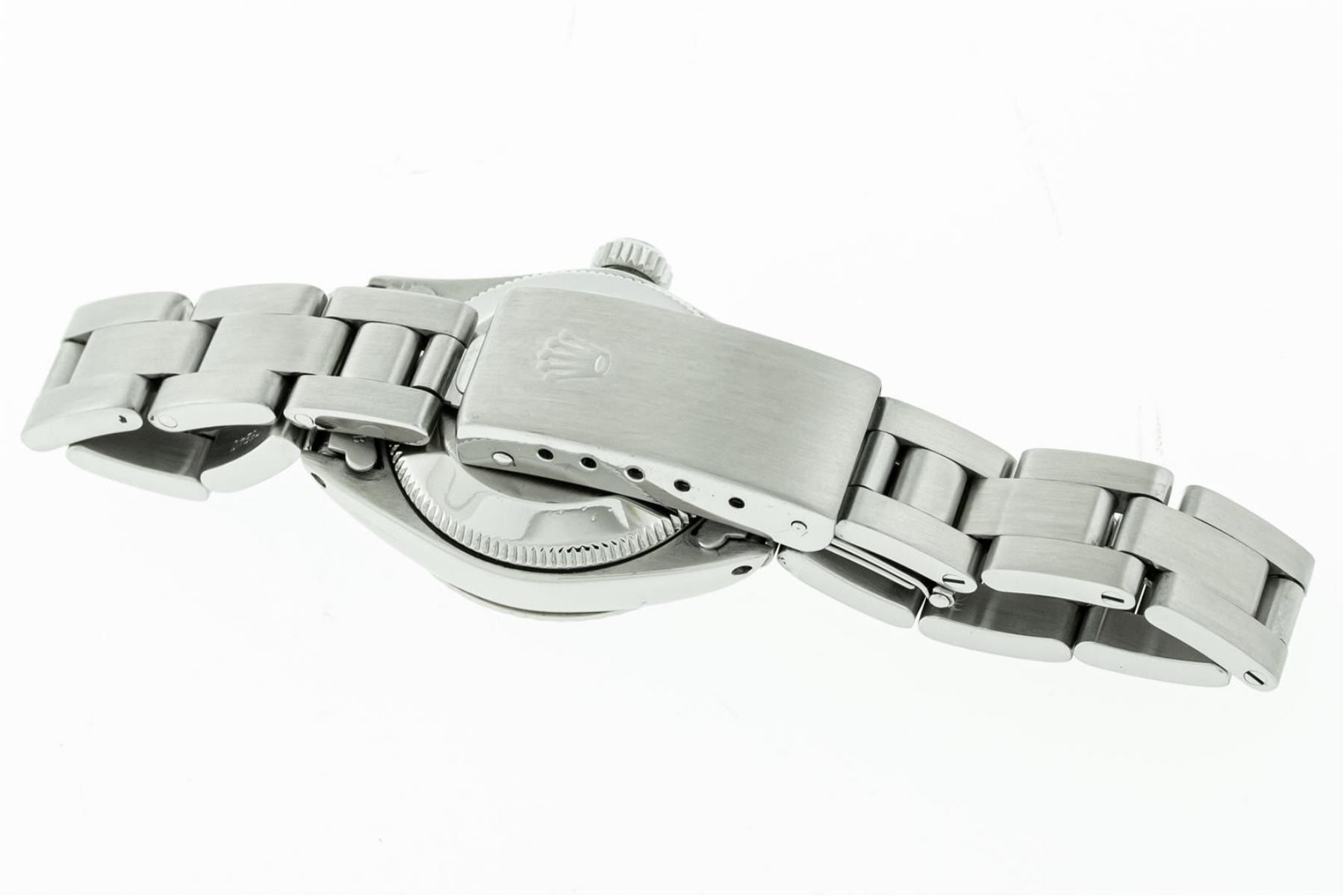One Ladies Stainless Steel Rolex Oyster Perpetual Datejust Polished Bright with Satin Finish, Serviced & Electronically Tested, Stainless Steel Case: 26mm, Stainless Steel Crown, Bezel: Rolex White Gold Fluted Bezel, Custom Crystal: New Acrylic Plastic Crystal. Custom Hands: New Luminescent Hands. Movement: Automatic Winding Movement 1161. Custom Dial: Purple String Diamond Dial With VS Diamonds, Diamond Count: 43 Single Cut VS Diamonds On Dial. Date Window: 3 O'Clock Position Date Display, Model: Datejust. Condition: G-6 Extra Fine. Bracelet: Stainless Steel Oyster Band. Bright Polish & Satin Finish. 6.25 Inches Length, Adjustable. Standard Clasp, With Rolex Logo. This Watch Has Been Serviced Time Tested And Is In Excellent Condition It Is Free Of All Scratches And Dents.