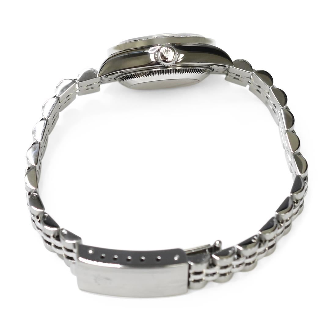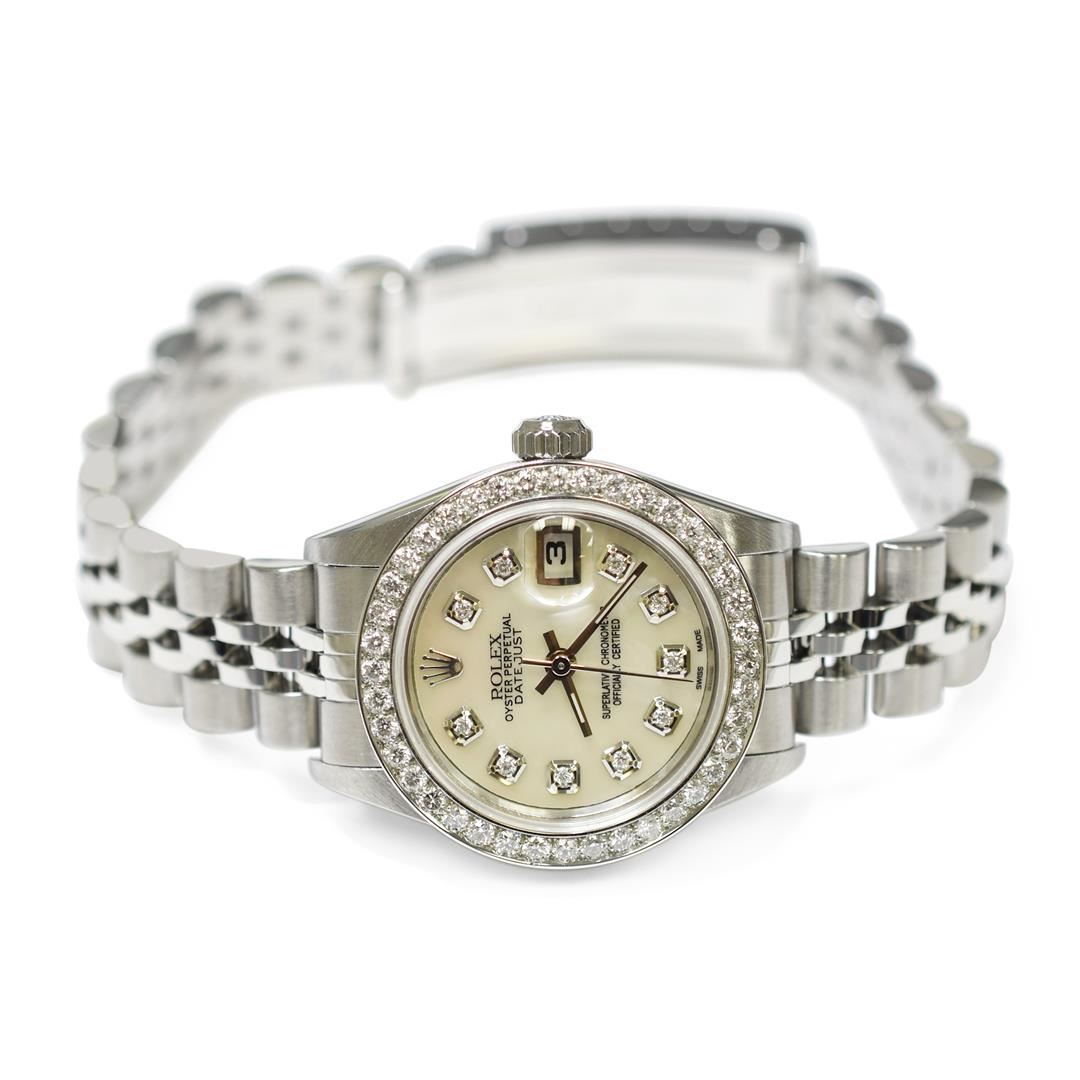 Rolex Lady Datejust Stainless Steel 26mm Mother of Pearl Diamond Dial Watch Polished & Electronically Tested. Model: Datejust. Case: Stainless Steel. Bezel: Custom made diamond bezel with round brilliant diamonds all set in prong setting. Total Diamond Weight: 0.85ctw. Clarity: VS-SI Color: G-H. Crystal: Sapphire Crystal. Bracelet: Stainless Steel, Adjustable Standard Clasp with Rolex Logo. Dial: Mother of Pearl Diamond Dial. Date Window: 3 O'clock Position. Movement: Automatic Winding Movement. Water Resistant: Yes. Case Size: 26mm. Condition: Pre Owned, Watch is free of all Scratches and Dents, Extra Fine G-6.