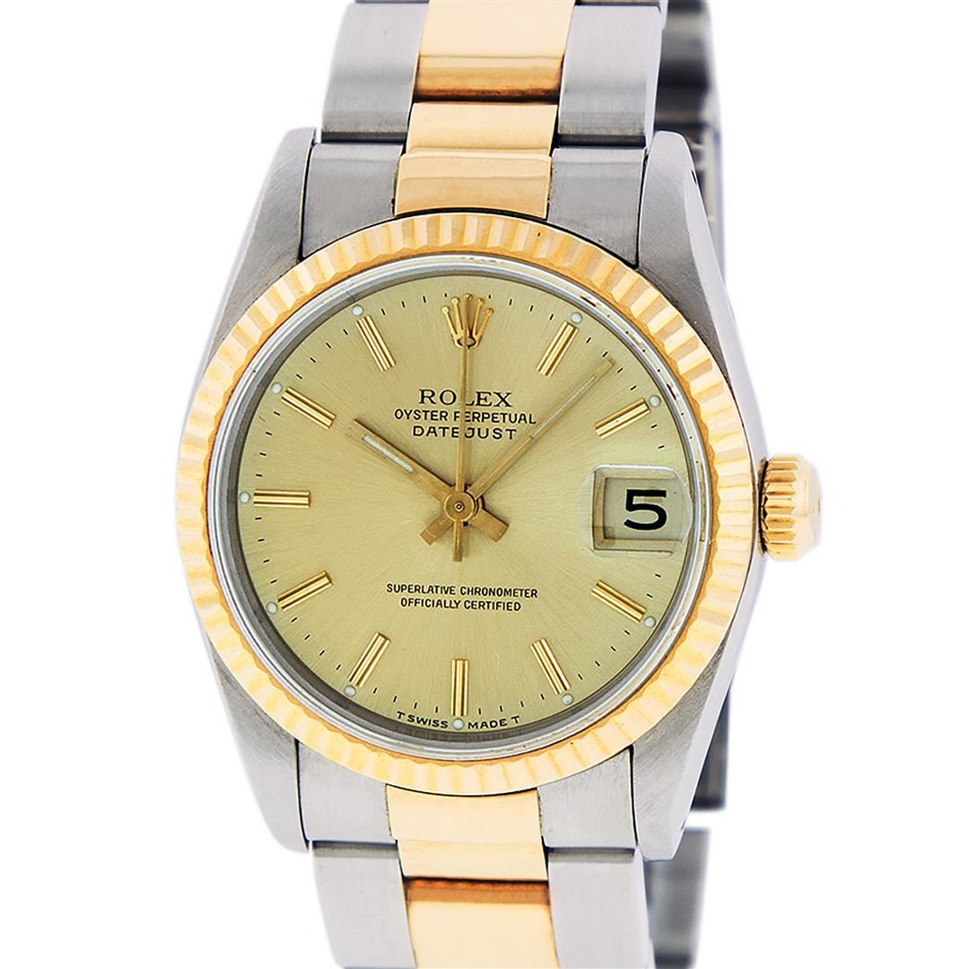 One Women's Midsize 18K Yellow Gold And Stainless Steel Rolex Datejust Polished, Serviced & Electronically Tested, Rolex Stainless Steel Case 31mm, Rolex Yellow Gold Crown, Rolex Bezel: 18K Yellow Gold Fluted Bezel. Crystal: Sapphire With Magnified Date Window. Hands: Luminescent Hands. Rolex Movement: Automatic Winding Movement Caliber 2135. Rolex Dial: Champagne Index Dial With Dash Track And Lumi Dots, Date Window: 3 O'Clock Position Date Display, Quickset, Model: Midsize Quickset Datejust. Condition: G-6 Extra Fine. Rolex Bracelet: 18K Yellow Gold And Stainless Steel Oyster Band. Bright Polish. 6.0 Inch Length, Adjustable. Standard Clasp, With Rolex Logo. This Pre Owned Watch Has Been Serviced Time Tested And Is In Excellent Condition It Is Free Of All Scratches And Dents.