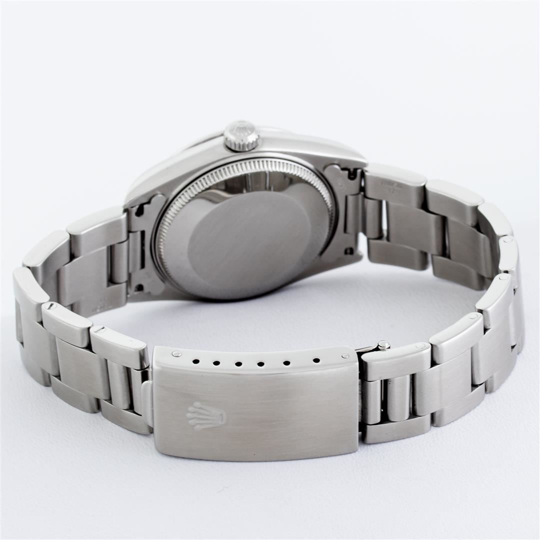 One Women's Rolex Midsize Stainless Steel Datejust Polished, Serviced & Electronically Tested, Rolex Stainless Steel Case Case: 31mm, Rolex Stainless Steel Crown, Rolex Bezel: 18K White Gold Fluted Bezel, Crystal: Sapphire With Cyclops Lens. Hands: Lumi Hands. Rolex Movement: Automatic Winding Movement 2235. Rolex Dial: Factory Blue Dial With Roman Hour Markers And Square Track. Date Window: 3 O'Clock Position Date Display, Quickset, Model: Midsize Quickset Datejust. Condition: G-6 Extra Fine. Rolex Bracelet: Stainless Steel Oyster Band. Bright Polish. 6.0 Inch Length, Adjustable. Standard Clasp, With Rolex Logo. This Pre Owned Watch Has Been Serviced Time Tested And Is In Excellent Condition It Is Free Of All Scratches And Dents.
