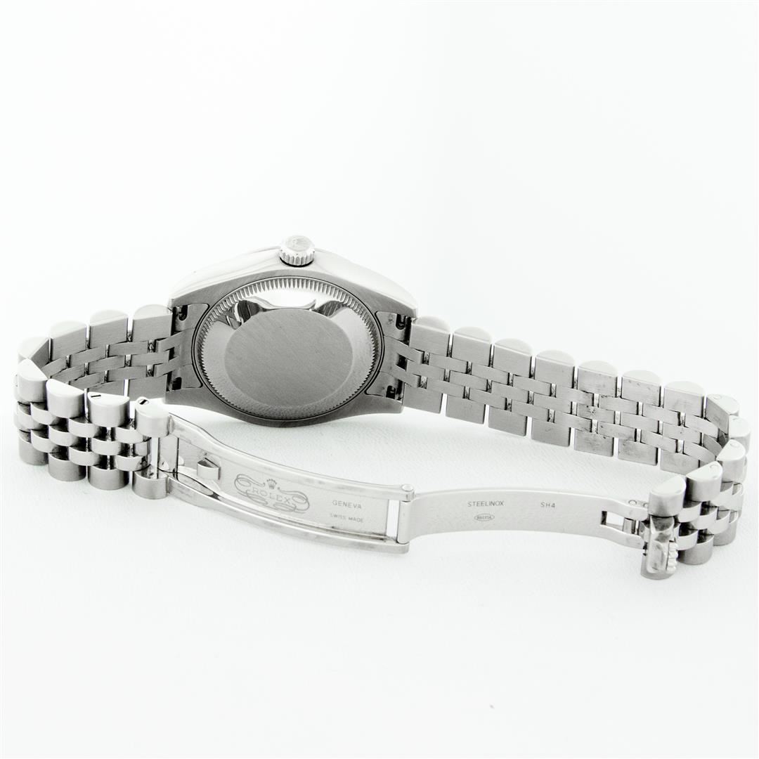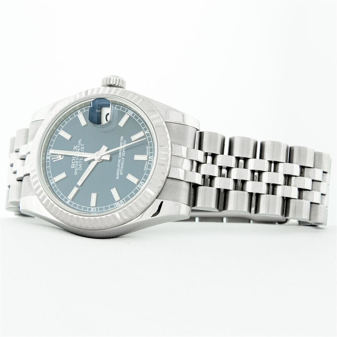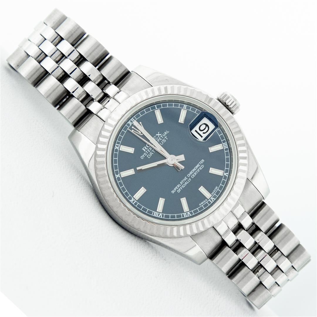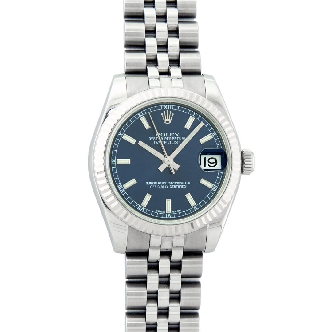 One Women's Midsize Stainless Steel Rolex Datejust Polished, Serviced & Electronically Tested, Stainless Steel Case Case: 31mm, Stainless Steel Crown, Bezel: 18K White Gold Fluted Bezel, Crystal: Sapphire With Magnified Date Window. Hands: Luminescent Hands. Rolex Movement: Automatic Winding Movement Caliber 2235. Rolex Dial: Blue Index Dial With Square Roman Track, Date Window: 3 O'Clock Position Date Display, Quickset, Model: Sapphire Quickset Midsize Datejust. Condition: G-6 Extra Fine. Rolex Bracelet: Stainless Steel Jubilee Band With Hidden Clasp. Bright Polish. 6.0 Inch Length, Adjustable. Hidden Clasp, With Rolex Logo. This Pre Owned Watch Has Been Serviced Time Tested And Is In Excellent Condition It Is Free Of All Scratches And Dents.