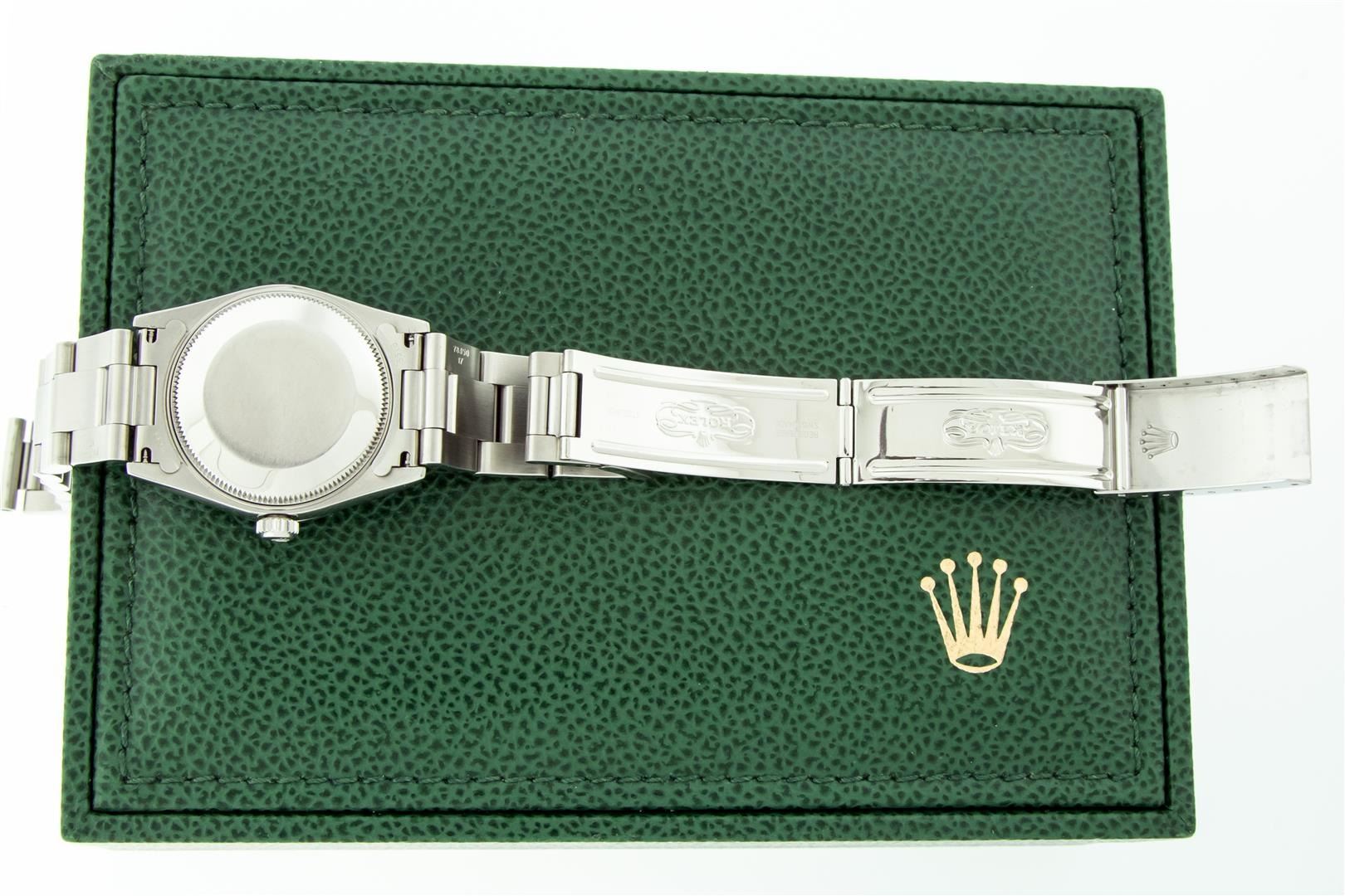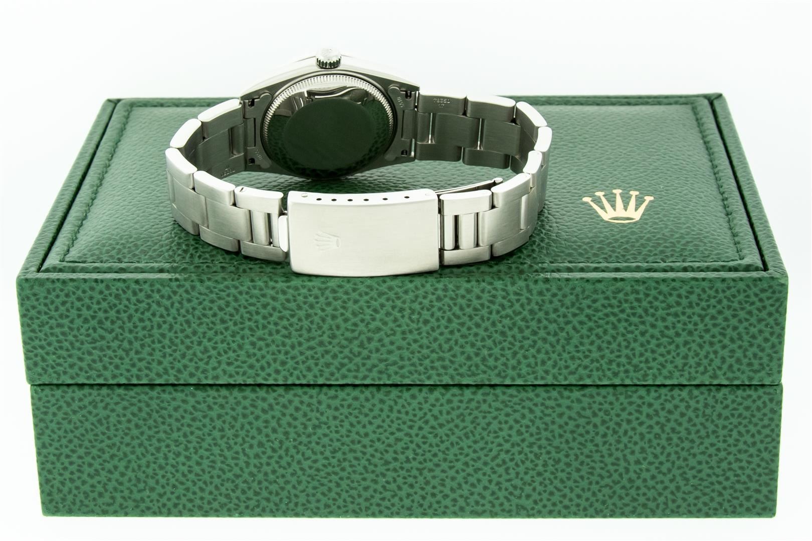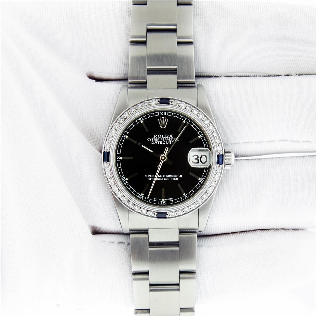 One Women's Pre Owned Midsize Stainless Steel Rolex Datejust Polished, Serviced & Electronically Tested, Rolex Stainless Steel Case Case: 31mm, Rolex Stainless Steel Crown, Custom Bezel: New 18K White Gold Sapphire Beadset Diamond Bezel, Diamond Count: 40 Diamonds + 4 Sapphires On Bezel, Color: G To H, Clarity: VS2-SI1. Custom Crystal: New Sapphire With Magnified Date Window. Custom Hands: New Luminescent Hands. Rolex Movement: Automatic Winding Movement 2235. Rolex Dial: Black Index Dial, Date Window: 3 O'Clock Position Date Display, Quickset, Model: Midsize Datejust. Condition: G-6 Extra Fine. Rolex Bracelet: Stainless Steel Oyster Band. Bright Polish. 6.0 Inch Length, Adjustable. Standard Clasp, With Rolex Logo. This Watch Has Been Serviced Time Tested And Is In Excellent Condition It Is Free Of All Scratches And Dents. This Watch Comes With A Rolex Box.