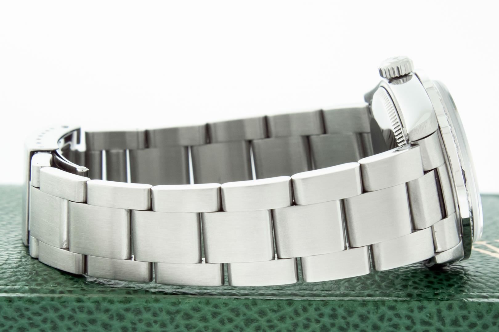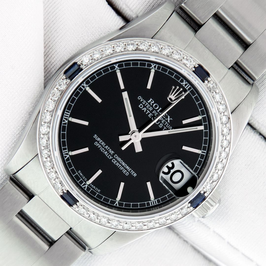 One Women's Pre Owned Midsize Stainless Steel Rolex Datejust Polished, Serviced & Electronically Tested, Rolex Stainless Steel Case Case: 31mm, Rolex Stainless Steel Crown, Custom Bezel: New 18K White Gold Sapphire Beadset Diamond Bezel, Diamond Count: 40 Diamonds + 4 Sapphires On Bezel, Color: G To H, Clarity: VS2-SI1. Custom Crystal: New Sapphire With Magnified Date Window. Custom Hands: New Luminescent Hands. Rolex Movement: Automatic Winding Movement 2235. Rolex Dial: Black Index Dial, Date Window: 3 O'Clock Position Date Display, Quickset, Model: Midsize Datejust. Condition: G-6 Extra Fine. Rolex Bracelet: Stainless Steel Oyster Band. Bright Polish. 6.0 Inch Length, Adjustable. Standard Clasp, With Rolex Logo. This Watch Has Been Serviced Time Tested And Is In Excellent Condition It Is Free Of All Scratches And Dents. This Watch Comes With A Rolex Box.