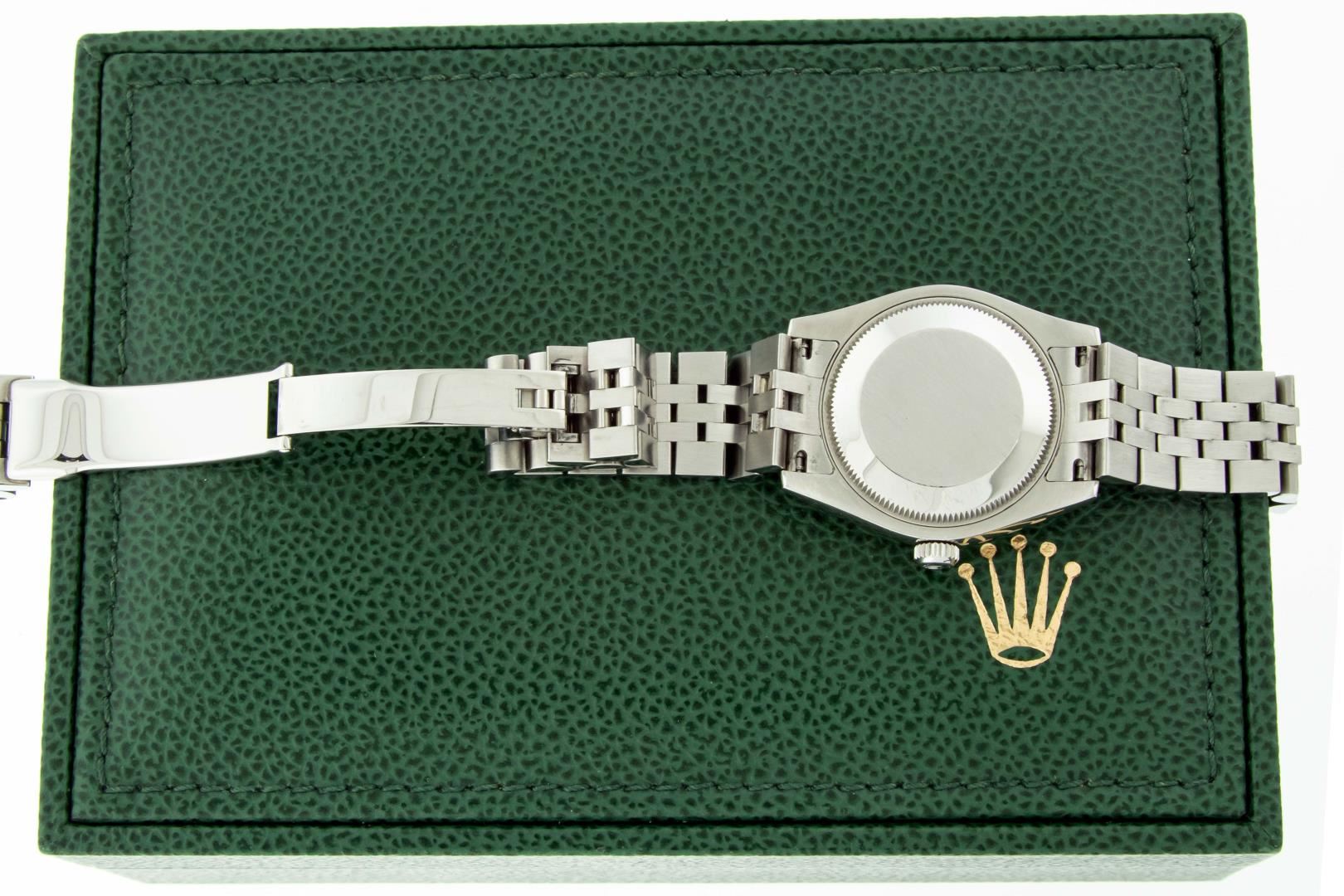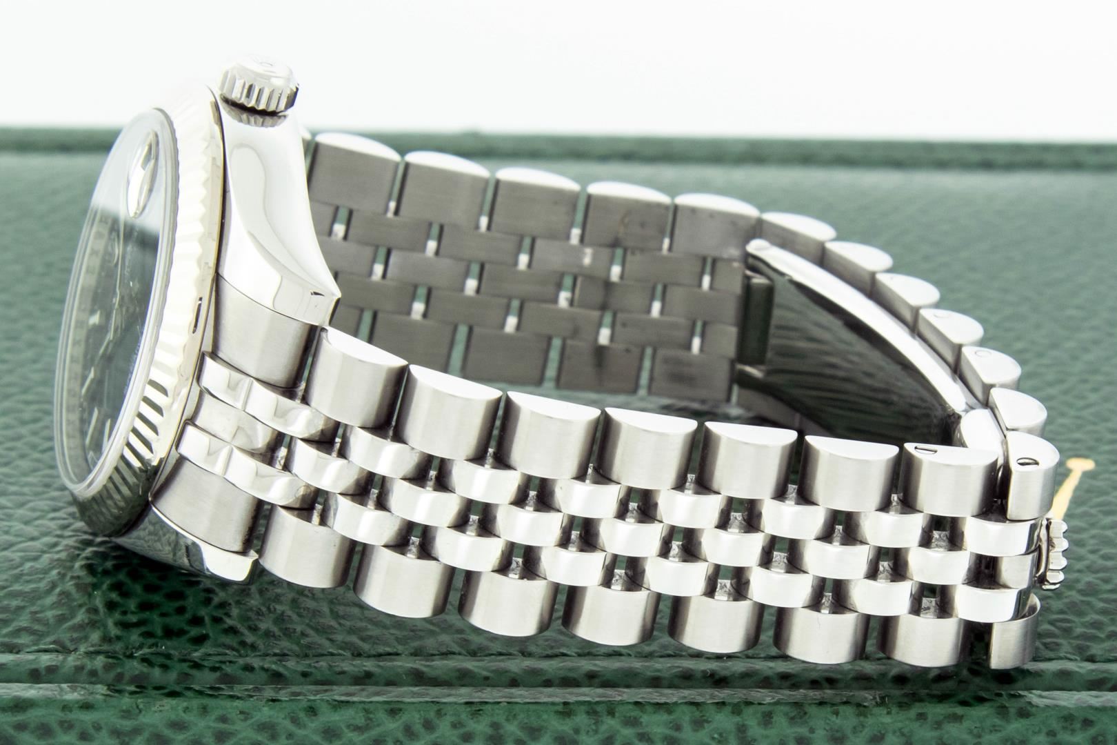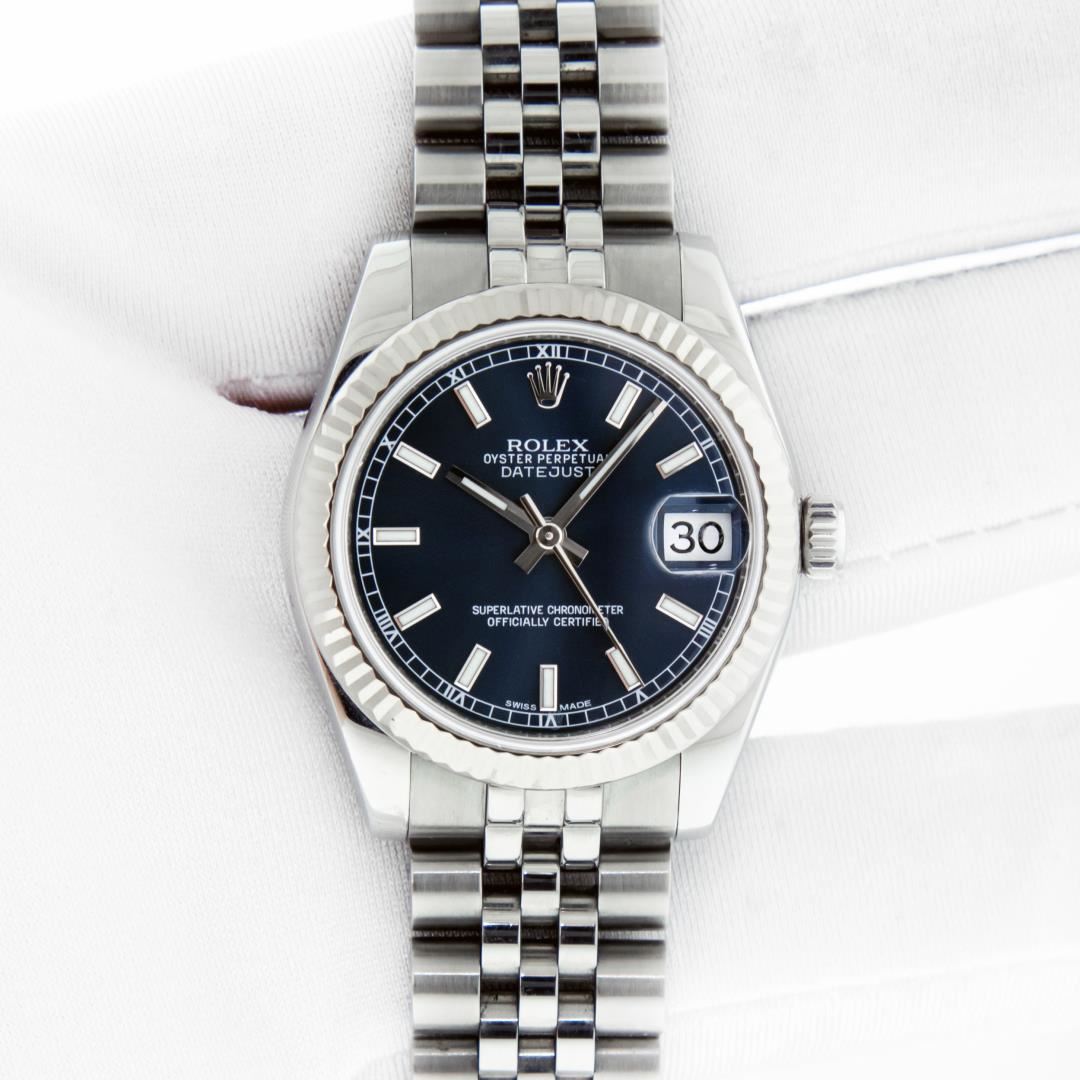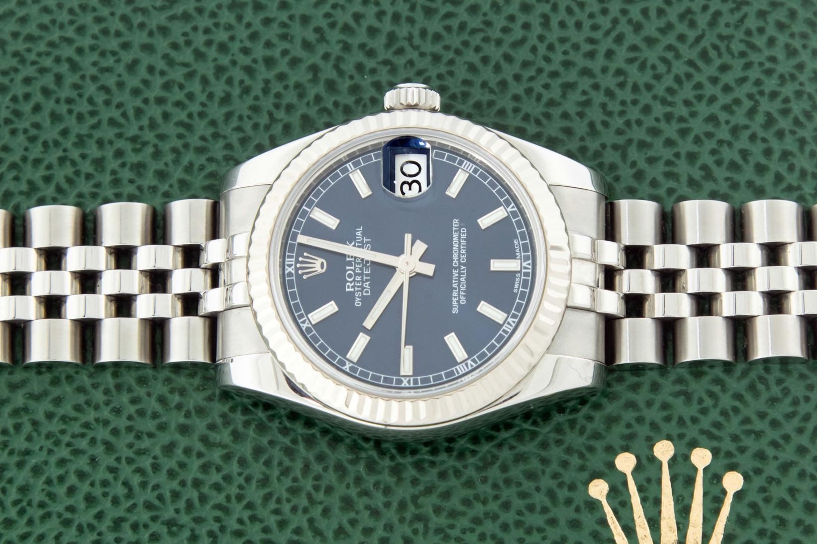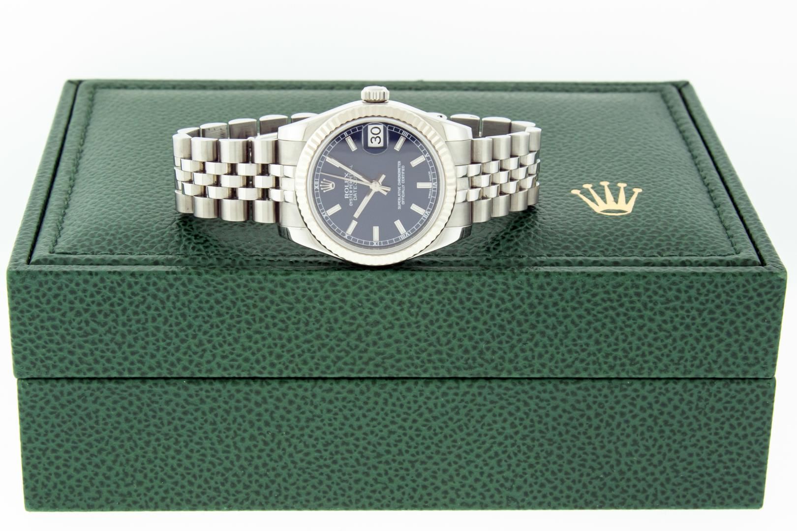 One Women's Pre Owned Midsize 31MM Stainless Steel Rolex Datejust Polished, Serviced & Electronically Tested, Rolex Stainless Steel Case Case: 31mm, Rolex Stainless Steel Crown, Rolex Bezel: 18K White Gold Fluted Bezel, Crystal: Sapphire With Cyclops Lens. Hands: Lumi Hands. Rolex Movement: Automatic Winding Movement 2235. Rolex Dial: Blue Index With Square Roman Track. Date Window: 3 O'Clock Position Date Display, Quickset, Model: Midsize Datejust. Condition: G-6 Extra Fine. Rolex Bracelet: Stainless Steel Jubilee Band. Bright Polish. 6.0 Inch Length, Adjustable. Hidden Clasp, With Rolex Logo. This Watch Has Been Serviced Time Tested And Is In Excellent Condition It Is Free Of All Scratches And Dents. This Watch Comes With A Rolex Box.