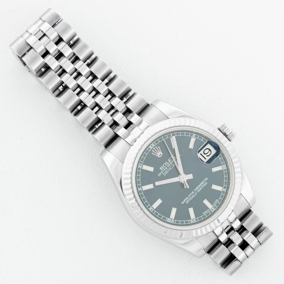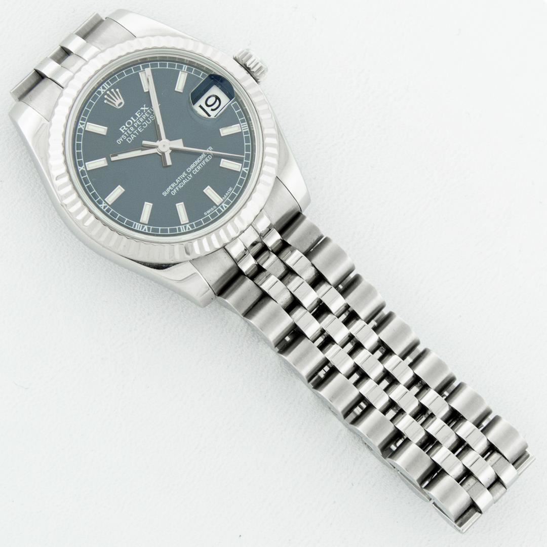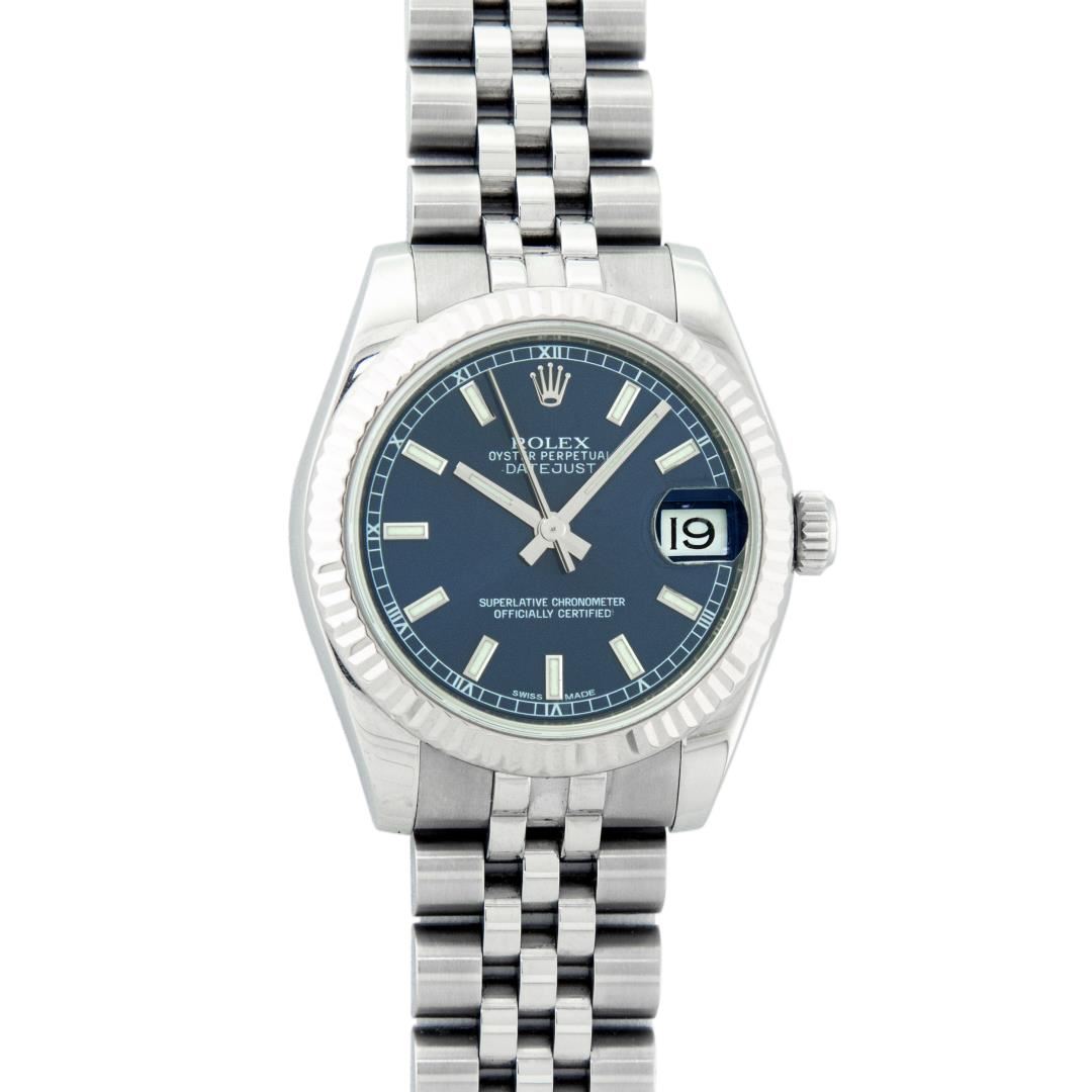 One Women's Midsize Stainless Steel Rolex Datejust Polished, Serviced & Electronically Tested, Stainless Steel Case : 31mm, Stainless Steel Crown, Bezel: 18K White Gold Fluted Bezel, Crystal: Sapphire With Magnified Date Window. Hands: Luminescent Hands. Rolex Movement: Automatic Winding Movement Caliber 2235. Rolex Dial: Blue Index Dial With Square Roman Track, Date Window: 3 O'Clock Position Date Display, Quickset, Model: Sapphire Quickset Midsize Datejust. Condition: G-6 Extra Fine. Rolex Bracelet: Stainless Steel Jubilee Band With Hidden Clasp. Bright Polish. 6.0 Inch Length, Adjustable. Hidden Clasp, With Rolex Logo. This Pre Owned Watch Has Been Serviced Time Tested And Is In Excellent Condition It Is Free Of All Scratches And Dents.